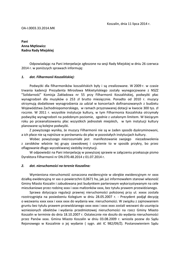 Koszalin, dnia 11 lipca 2014 r. OA-I.0003.33.2014.MK Pani Anna Mętlewicz Radna Rady Miejskiej Odpowiadając na Pani interpelacje zgłoszone na sesji Rady Miejskiej w dniu 26 czerwca 2014 r. w poniższych sprawach informuję: 1. dot. Filharmonii Koszalińskiej: Podwyżki dla filharmoników koszalińskich były i są zrealizowane. W 2009 r. w czasie trwania kadencji Prezydenta Mirosława Mikietyńskiego zostały wynegocjowane z NSZZ ”Solidarność” Komisja Zakładowa nr 55 przy Filharmonii Koszalińskiej, podwyżki płac wynagrodzeń dla muzyków o 253 zł brutto miesięcznie. Ponadto od 2010 r. muzycy otrzymują dodatkowe wynagrodzenia za udział w koncertach dofinansowanych z budżetu Województwa Zachodniopomorskiego, w ramach przyznawanej dotacji w kwocie 300 tys. zł rocznie. W 2011 r. wszystkie instytucje kultury, w tym Filharmonia Koszalińska otrzymały podwyżkę wynagrodzeń na podobnym poziomie, zgodnie z ustalonym limitem. W bieżącym roku po przeanalizowaniu płac wszystkich jednostek miejskich, w tym instytucji kultury planowane są kolejne podwyżki. Z powyższego wynika, że muzycy Filharmonii nie są w żaden sposób dyskryminowani, a ich płace nie są najniższe w porównaniu do płac w pozostałych instytucjach kultury. Wobec powyższego niezrozumiałe jest manifestowanie swojego niezadowolenia z zarobków właśnie tej grupy zawodowej i czynienie to w sposób przykry, bo przez oflagowanie długo wyczekiwanej siedziby instytucji. W odpowiedzi na Pani interpelację w powyższej sprawie w załączeniu przekazuje pismo Dyrektora Filharmonii nr DN.070.48.2014 z 01.07.2014 r. 2. dot. nieruchomości na terenie Koszalina: Wymieniona nieruchomość oznaczona ewidencyjnie w obrębie ewidencyjnym nr xxxx działką ewidencyjną nr xxx o powierzchni 0,0671 ha, jak już informowałem stanowi własność Gminy Miasto Koszalin i zabudowana jest budynkiem parterowym wykorzystywanym na cele mieszkaniowe przez rodzinę xxxx i xxxx małżonków xxxx, bez tytułu prawem przewidzianego. Sprawa dotycząca regulacji prawnej nieruchomości położonej przy ul. xxxxx została rozstrzygnięta na posiedzeniu Kolegium w dniu 28.05.2007 r. - Prezydent podjął decyzję o wezwaniu xxxx xxxx i xxxx xxxx do wydania ww. nieruchomości. W związku z zajmowaniem gruntu bez tytułu prawem przewidzianego xxxx xxxx i xxxx xxxx zostali wezwani do usunięcia wzniesionych obiektów i wydania przedmiotowej nieruchomości na rzecz Gminy Miasto Koszalin w terminie do dnia 18.10.2007 r. Ostatecznie nie doszło do wydania nieruchomości przez Panów xxxx. Gmina Miasto Koszalin w dniu 03.08.2009 r. wniosła pozew do Sądu Rejonowego w Koszalinie o jej wydanie ( sygn. akt IC 982/09/Ż). Postanowieniem Sądu Rejonowego w Koszalinie Wydział I Cywilny z dnia 11.04.2011 r. postępowanie w ww. sprawie zostało zawieszone a następnie podjęte z urzędu w dniu 08.04.2014 r. xxxx i xxxx małżonkom xxxx niejednokrotnie od wielu lat przedstawiano propozycję ugodowego załatwienia sprawy w zakresie terminu wydania nieruchomości oznaczonej ewidencyjnie w obrębie ewidencyjnym nr xxxx działką ewidencyjną nr xxxx o powierzchni 0,0671 ha, położonej w Koszalinie przy ul. xxxx xxxx. Strona niejednokrotnie informowana była o możliwości zawarcia umowy dzierżawy na czas niedłuższy niż 5 lat. Propozycja ta miała umożliwić rozłożenie w czasie czynności prowadzących do zaspokojenia potrzeb mieszkaniowych rodziny xxxx i xxxx małżonków xxxx. Podjęte próby porozumienia w ww. zakresie nie doprowadziły do ugodowego zakończenia sprawy, gdyż Strona żądała uregulowania stanu prawnego nieruchomości położonej w Koszalinie przy ul. xxxx xxxx poprzez jej sprzedaż lub oddanie w użytkowanie wieczyste. Uwzględniając stan faktyczny nieruchomości, obowiązujące przepisy prawa nie dają podstaw do regulacji stanu prawnego poprzez zbycie jej w drodze bezprzetargowej. Tryb bezprzetargowy należy traktować jako tryb szczególny i wszelkie wyjątki od przetargowego trybu zbywania nieruchomości mają wynikać wprost z przepisów prawa i nie można ich interpretować rozszerzająco. Zasadą jest więc sprzedawanie lub oddawanie nieruchomości w użytkowanie wieczyste w drodze przetargu, a jedynie w wyjątkowych przypadkach nieruchomość jest zbywana w drodze bezprzetargowej - wyrok WSA we Wrocławiu z dnia 8 lipca 2009 r., III SA/Wr 86/09. Dodać należy, że Państwo xxxx w trakcie prowadzonych rozmów i negocjacji z Urzędem, korzystali z pomocy prawnej i reprezentowani byli przez profesjonalnych pełnomocników. Prowadzone również przez sądy sprawy regulacji stanu prawnego ww. nieruchomości nie doprowadziły do korzystnych rozstrzygnięć na rzecz Państwa xxxx. W dniu 10.05.2012 r. Sąd Okręgowy w Koszalinie oddalił powództwo xxxx i xxxx małżonków xxxx o uwłaszczenie. Od ww. orzeczenia strona wniosła apelację. Wyrokiem z dnia 21.11.2012 r. Sąd Apelacyjny w Szczecinie oddalił apelację powodów. Państwo xxxx wnieśli skargę kasacyjną od ww. wyroku do Sądu Najwyższego, która została oddalona postanowieniem z dnia 24.10.2013 r. (sygn. akt II CSK 193/13). Wcześniej Strona występowała o stwierdzenie zasiedzenia przedmiotowej nieruchomości, gdzie następnie wymieniony wniosek wycofała. Jednocześnie informuję, że w omawianej sprawie nie mają zastosowania przepisy ustawy z dnia 14 czerwca 1960 r. Kodeks postępowania administracyjnego. Uwzględniając powyższe nie stwierdziłem nieprawidłowości w postępowaniu Urzędu i w związku z tym brak jest podstaw do wyciągnięcia konsekwencji służbowych w stosunku do podległych mi pracowników. 3. dot. likwidacji przychodni rehabilitacyjnej: W sprawie dotyczącej likwidacji usług rehabilitacyjnych w przychodni przy al. Monte Cassino 13 w Koszalinie podjąłem działania i rozmowy z dyrektorem Szpitala Wojewódzkiego w Koszalinie, aby możliwie szybko rozwiązać trudną sytuację. Decyzja Szpitala Wojewódzkiego o likwidacji Kompleksow