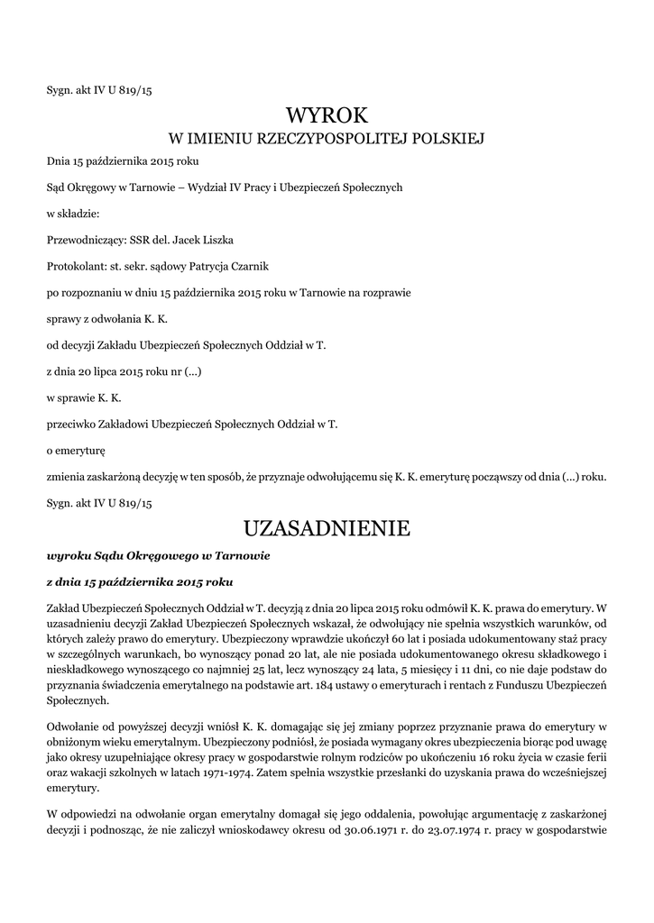 Sygn. akt IV U 819/15 WYROK W IMIENIU RZECZYPOSPOLITEJ POLSKIEJ Dnia 15 października 2015 roku Sąd Okręgowy w Tarnowie – Wydział IV Pracy i Ubezpieczeń Społecznych w składzie: Przewodniczący: SSR del. Jacek Liszka Protokolant: st. sekr. sądowy Patrycja Czarnik po rozpoznaniu w dniu 15 października 2015 roku w Tarnowie na rozprawie sprawy z odwołania K. K. od decyzji Zakładu Ubezpieczeń Społecznych Oddział w T. z dnia 20 lipca 2015 roku nr (...) w sprawie K. K. przeciwko Zakładowi Ubezpieczeń Społecznych Oddział w T. o emeryturę zmienia zaskarżoną decyzję w ten sposób, że przyznaje odwołującemu się K. K. emeryturę począwszy od dnia (...) roku. Sygn. akt IV U 819/15 UZASADNIENIE wyroku Sądu Okręgowego w Tarnowie z dnia 15 października 2015 roku Zakład Ubezpieczeń Społecznych Oddział w T. decyzją z dnia 20 lipca 2015 roku odmówił K. K. prawa do emerytury. W uzasadnieniu decyzji Zakład Ubezpieczeń Społecznych wskazał, że odwołujący nie spełnia wszystkich warunków, od których zależy prawo do emerytury. Ubezpieczony wprawdzie ukończył 60 lat i posiada udokumentowany staż pracy w szczególnych warunkach, bo wynoszący ponad 20 lat, ale nie posiada udokumentowanego okresu składkowego i nieskładkowego wynoszącego co najmniej 25 lat, lecz wynoszący 24 lata, 5 miesięcy i 11 dni, co nie daje podstaw do przyznania świadczenia emerytalnego na podstawie art. 184 ustawy o emeryturach i rentach z Funduszu Ubezpieczeń Społecznych. Odwołanie od powyższej decyzji wniósł K. K. domagając się jej zmiany poprzez przyznanie prawa do emerytury w obniżonym wieku emerytalnym. Ubezpieczony podniósł, że posiada wymagany okres ubezpieczenia biorąc pod uwagę jako okresy uzupełniające okresy pracy w gospodarstwie rolnym rodziców po ukończeniu 16 roku życia w czasie ferii oraz wakacji szkolnych w latach 1971-1974. Zatem spełnia wszystkie przesłanki do uzyskania prawa do wcześniejszej emerytury. W odpowiedzi na odwołanie organ emerytalny domagał się jego oddalenia, powołując argumentację z zaskarżonej decyzji i podnosząc, że nie zaliczył wnioskodawcy okresu od 30.06.1971 r. do 23.07.1974 r. pracy w gospodarstwie rolnym ojca położonym w miejscowości G., gdyż wówczas pobierał naukę w Zasadniczej Szkole Zawodowej w D. i mieszkał w internacie, zatem nie mógł on stale i w odpowiednim wymiarze jej wykonywać w charakterze domownika. Bezsporne między stronami było: K. K. urodzony dnia (...) roku ukończył 60 lat. Posiada na dzień 1.01.1999 r. staż pracy w szczególnych warunkach wynoszący 20 lat, 8 miesięcy i 4 dni. Nie przystąpił do otwartego funduszu emerytalnego. Sąd Okręgowy ustalił nadto następujący stan faktyczny sprawy: Ubezpieczony po ukończeniu 16 lat, w okresach od 29.06.1971 r. do 31.08.1971 r., od 24.06.1972 r. do 31.08.1972 r., od 23.06.1973 r. do 31.08.1973 r. i od 12.06.1974 r. do 23.07.1974 r., a więc do momentu podjęcia pierwszego zatrudnienia, czyli w okresach przerw wakacyjnych podczas pobierania nauki w Zasadniczej Szkole Zawodowej w D. pracował w gospodarstwie rolnym rodziców zamieszkując wówczas w nim jednocześnie. Natomiast w trakcie nauki w Szkole zamieszkiwał w internacie. Szkołę ukończył w dniu 12.06.1974 r. Dowód: - akta ZUS, - zeznania odwołującego się – k. 16, - zeznania świadków J. G. i W. W. – k. 15-16. Gospodarstwo to o powierzchni ponad 10 ha (w tym las stanowił ok. 2 ha, a resztą był uprawiany grunt), znajdowało się w miejscowości G.. W gospodarstwie tym pracował głównie odwołujący wraz z rodzicami i młodszym bratem, gdyż starsze rodzeństwo już wówczas nie mieszkało w domu rodzinnym. Ojciec był chorowity i zmarł w dniu 4.07.1973 r. W gospodarstwie uprawiano pszenicę, owies, rzepak, kukurydzę, buraki, siano, warzywa. Z inwentarza żywego były krowy, świnie (w liczbie ok. 25), koń oraz drób. Świnie były sprzedawane, w gospodarstwie był także traktor, jednak większość prac wykonywało się ręcznie, nie było snopowiązałki. Odwołujący wykonywał wszystkie potrzebne prace w tym gospodarstwie – pracował przy żniwach, sianokosach, wykopkach, omłotach. Pracował także przy zwierzętach, w stajni, wyrzucał obornik itp. W okresach przerw wakacyjnych, a więc w czasie najbardziej wytężonych prac na roli odwołujący stale, codziennie pracował w tym gospodarstwie rolnym rodziców w wymiarze przekraczającym 4 godziny dziennie. Dowód: - akta ZUS, - zeznania odwołującego się – k. 16, - zeznania świadków J. G. i W. W. – k. 15-16. Przedmiotowy stan faktyczny Sąd ustalił w oparciu o dokumenty zalegające w aktach organu emerytalnego, jak również w oparciu o zeznania świadków i odwołującego się. Dokumenty dające podstawę dla poczynienia ustaleń faktycznych w niniejszej sprawie Sąd uznał za autentyczne i wiarygodne. Poza tym treść i forma tych dokumentów nie budziły zastrzeżeń i wątpliwości uczestników postępowania, nie ujawniły się też takie okoliczności, które należałoby brać pod uwagę z urzędu, a które podważałyby wiarygodność tej kategorii dowodów i godziły w ich moc dowodową od strony materialnej czy formalnej. Dokumenty urzędowe stanowiły zatem dowód tego, co zostało w nich urzędowo zaświadczone (art. 244 k.p.c.), a dokumenty prywatne, że osoba która je podpisała złożyła oświadczenie zawarte w dokumencie (art. 245 kpc). Wiarygodne w ocenie Sądu były także zeznania odwołującego się i świadków. Korespondowały one z materiałem dowodowym zgromadzonym w niniejszej sprawie. Depozycje te nie zawierały żadnych wewnętrznych sprzeczności, były logiczne i spójne. Razem wzięte dały pełny i jasny obraz badanej rzeczywistości. Sąd Okręgowy rozważył, co następuje: Odwołanie zasługuje na uwzględnienie. W przedmiotowej sprawie zwrócić uwagę należy na regulację zawartą w art. 184 ust.1 ustawy z dnia 17 grudnia 1998 roku o emeryturach i rentach 
