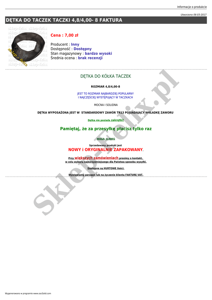 Informacje o produkcie Utworzono 06-03-2017 DĘTKA DO TACZEK TACZKI 4,8/4,00- 8 FAKTURA Cena : 7,00 zł Producent : Inny Dostępność : Dostępny Stan magazynowy : bardzo wysoki Średnia ocena : brak recenzji ROZMIAR 4,8/4,00-8 .p l DĘTKA DO KÓŁKA TACZEK JEST TO ROZMIAR NAJBARDZIEJ POPULARNY I NAJCZĘŚCIEJ WYSTĘPUJĄCY W TACZKACH Fe lix MOCNA I SOLIDNA DĘTKA WYPOSAŻONA JEST W STANDARDOWY ZAWÓR TR13 POSIADAJĄCY WKŁADKĘ ZAWORU Dętka nie posiada zakrętki! Pamiętaj, że za przesyłkę płacisz tylko raz WAGA: 0,40KG Sprzedawany produkt jest Sk le p- NOWY i ORYGINALNIE ZAPAKOWANY. Przy większych zamówieniach prosimy o kontakt, w celu wyboru najkorzystniejszego dla Państwa sposobu wysyłki. Dostępne są HURTOWE ilości. Wystawiamy paragon lub na życzenie klienta FAKTURĘ VAT. Wygenerowano w programie www.oscGold.com
