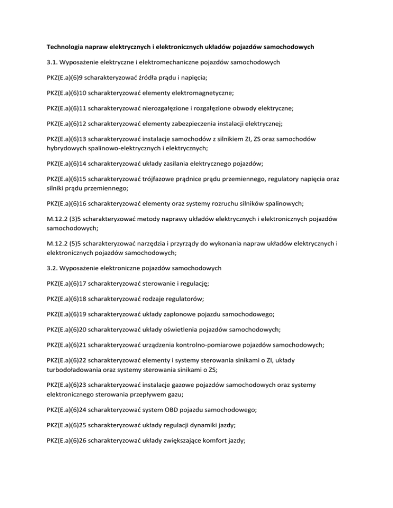 Technologia napraw elektrycznych i elektronicznych układów pojazdów samochodowych 3.1. Wyposażenie elektryczne i elektromechaniczne pojazdów samochodowych PKZ(E.a)(6)9 scharakteryzować źródła prądu i napięcia; PKZ(E.a)(6)10 scharakteryzować elementy elektromagnetyczne; PKZ(E.a)(6)11 scharakteryzować nierozgałęzione i rozgałęzione obwody elektryczne; PKZ(E.a)(6)12 scharakteryzować elementy zabezpieczenia instalacji elektrycznej; PKZ(E.a)(6)13 scharakteryzować instalacje samochodów z silnikiem ZI, ZS oraz samochodów hybrydowych spalinowo-elektrycznych i elektrycznych; PKZ(E.a)(6)14 scharakteryzować układy zasilania elektrycznego pojazdów; PKZ(E.a)(6)15 scharakteryzować trójfazowe prądnice prądu przemiennego, regulatory napięcia oraz silniki prądu przemiennego; PKZ(E.a)(6)16 scharakteryzować elementy oraz systemy rozruchu silników spalinowych; M.12.2 (3)5 scharakteryzować metody naprawy układów elektrycznych i elektronicznych pojazdów samochodowych; M.12.2 (5)5 scharakteryzować narzędzia i przyrządy do wykonania napraw układów elektrycznych i elektronicznych pojazdów samochodowych; 3.2. Wyposażenie elektroniczne pojazdów samochodowych PKZ(E.a)(6)17 scharakteryzować sterowanie i regulację; PKZ(E.a)(6)18 scharakteryzować rodzaje regulatorów; PKZ(E.a)(6)19 scharakteryzować układy zapłonowe pojazdu samochodowego; PKZ(E.a)(6)20 scharakteryzować układy oświetlenia pojazdów samochodowych; PKZ(E.a)(6)21 scharakteryzować urządzenia kontrolno-pomiarowe pojazdów samochodowych; PKZ(E.a)(6)22 scharakteryzować elementy i systemy sterowania sinikami o ZI, układy turbodoładowania oraz systemy sterowania sinikami o ZS; PKZ(E.a)(6)23 scharakteryzować instalacje gazowe pojazdów samochodowych oraz systemy elektronicznego sterowania przepływem gazu; PKZ(E.a)(6)24 scharakteryzować system OBD pojazdu samochodowego; PKZ(E.a)(6)25 scharakteryzować układy regulacji dynamiki jazdy; PKZ(E.a)(6)26 scharakteryzować układy zwiększające komfort jazdy;