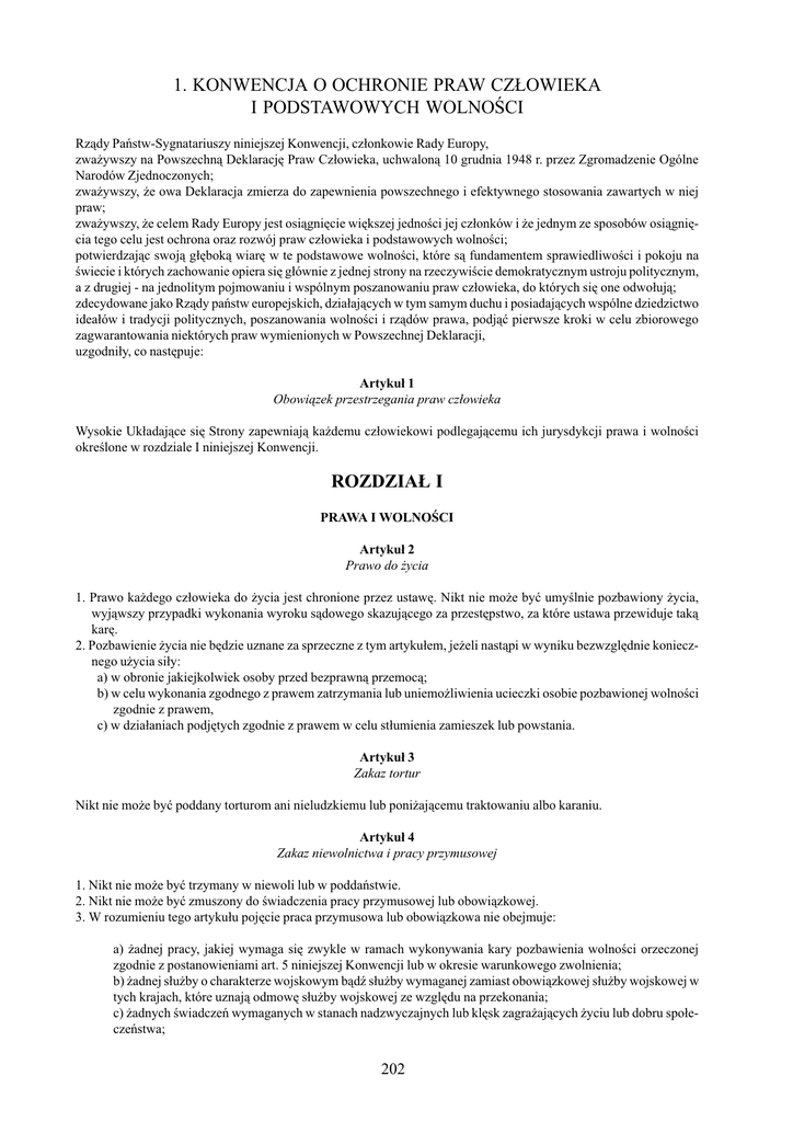 1. KONWENCJA O OCHRONIE PRAW CZ£OWIEKA I PODSTAWOWYCH WOLNOCI Rz¹dy Pañstw-Sygnatariuszy niniejszej Konwencji, cz³onkowie Rady Europy, zwa¿ywszy na Powszechn¹ Deklaracjê Praw Cz³owieka, uchwalon¹ 10 grudnia 1948 r. przez Zgromadzenie Ogólne Narodów Zjednoczonych; zwa¿ywszy, ¿e owa Deklaracja zmierza do zapewnienia powszechnego i efektywnego stosowania zawartych w niej praw; zwa¿ywszy, ¿e celem Rady Europy jest osi¹gniêcie wiêkszej jednoci jej cz³onków i ¿e jednym ze sposobów osi¹gniêcia tego celu jest ochrona oraz rozwój praw cz³owieka i podstawowych wolnoci; potwierdzaj¹c swoj¹ g³êbok¹ wiarê w te podstawowe wolnoci, które s¹ fundamentem sprawiedliwoci i pokoju na wiecie i których zachowanie opiera siê g³ównie z jednej strony na rzeczywicie demokratycznym ustroju politycznym, a z drugiej - na jednolitym pojmowaniu i wspólnym poszanowaniu praw cz³owieka, do których siê one odwo³uj¹; zdecydowane jako Rz¹dy pañstw europejskich, dzia³aj¹cych w tym samym duchu i posiadaj¹cych wspólne dziedzictwo idea³ów i tradycji politycznych, poszanowania wolnoci i rz¹dów prawa, podj¹æ pierwsze kroki w celu zbiorowego zagwarantowania niektórych praw wymienionych w Powszechnej Deklaracji, uzgodni³y, co nastêpuje: Artyku³ 1 Obowi¹zek przestrzegania praw cz³owieka Wysokie Uk³adaj¹ce siê Strony zapewniaj¹ ka¿demu cz³owiekowi podlegaj¹cemu ich jurysdykcji prawa i wolnoci okrelone w rozdziale I niniejszej Konwencji. ROZDZIA£ I PRAWA I WOLNOCI Artyku³ 2 Prawo do ¿ycia 1. Prawo ka¿dego cz³owieka do ¿ycia jest chronione przez ustawê. Nikt nie mo¿e byæ umylnie pozbawiony ¿ycia, wyj¹wszy przypadki wykonania wyroku s¹dowego skazuj¹cego za przestêpstwo, za które ustawa przewiduje tak¹ karê. 2. Pozbawienie ¿ycia nie bêdzie uznane za sprzeczne z tym artyku³em, je¿eli nast¹pi w wyniku bezwzglêdnie koniecznego u¿ycia si³y: a) w obronie jakiejkolwiek osoby przed bezprawn¹ przemoc¹; b) w celu wykonania zgodnego z prawem zatrzymania lub uniemo¿liwienia ucieczki osobie pozbawionej wolnoci zgodnie z prawem, c) w dzia³aniach podjêtych zgodnie z prawem w celu st³umienia zamieszek lub powstania. Artyku³ 3 Zakaz tortur Nikt nie mo¿e byæ poddany torturom ani nieludzkiemu lub poni¿aj¹cemu traktowaniu albo karaniu. Artyku³ 4 Zakaz niewolnictwa i pracy przymusowej 1. Nikt nie mo¿e byæ trzymany w niewoli lub w poddañstwie. 2. Nikt nie mo¿e byæ zmuszony do wiadczenia pracy przymusowej lub obowi¹zkowej. 3. W rozumieniu tego artyku³u pojêcie praca przymusowa lub obowi¹zkowa nie obejmuje: a) ¿adnej pracy, jakiej wymaga siê zwykle w ramach wykonywania kary pozbawienia wolnoci orzeczonej zgodnie z postanowieniami art. 5 niniejszej Konwencji lub w okresie warunkowego zwolnienia; b) ¿adnej s³u¿by o charakterze wojskowym b¹d s³u¿by wymaganej zamiast obowi¹zkowej s³u¿by wojskowej w tych krajach, które uznaj¹ odmowê s³u¿by wojskowej ze wzglêdu na przekonania; c) ¿adnych wiadczeñ wymaganych w stanach nadzwyczajnych lub klêsk zagra¿aj¹cych ¿yciu lub dobru spo³eczeñstwa; 202 d) ¿adnej pracy ani wiadczeñ stanowi¹cych czêæ zwyk³ych obowi¹zków obywatelskich. Artyku³ 5 Prawo do wolnoci i bezpieczeñstwa osobistego 1. Ka¿dy ma prawo do wolnoci i bezpieczeñstwa osobistego. Nikt nie mo¿e byæ pozbawiony wolnoci, z wyj¹tkiem nastêpuj¹cych przypadków i w trybie ustalonym przez prawo: a) zgodnego z prawem pozbawienia wolnoci w wyniku skazania przez w³aciwy s¹d; b) zgodnego z prawem zatrzymania lub aresztowania w przypadku niepodporz¹dkowania siê wydanemu zgodnie z prawem orzeczeniu s¹du lub w celu zapewnienia wykonania okrelonego w ustawie obowi¹zku; c) zgodnego z prawem zatrzymania lub aresztowania w celu postawienia przed w³aciwym organem, je¿eli istnieje uzasadnione podejrzenie pope³nienia czynu zagro¿onego kar¹, lub, jeli jest to konieczne, w celu zapobie¿enia pope³nieniu takiego czynu lub uniemo¿liwienia ucieczki po jego dokonaniu; d) pozbawienia nieletniego wolnoci na podstawie zgodnego z prawem orzeczenia w celu ustanowienia nadzoru wychowawczego lub zgodnego z prawem pozbawienia nieletniego wolnoci w celu postawienia go przed w³aciwym organem; e) zgodnego z prawem pozbawienia wolnoci osoby w celu zapobie¿enia szerzeniu przez ni¹ choroby zakanej, osoby umys³owo chorej, alkoholika, narkomana lub w³óczêgi; f) zgodnego z prawem zatrzymania lub aresztowania osoby w celu zapobie¿enia jej nielegalnemu wkroczeniu na terytorium pañstwa lub osoby, przeciwko której toczy siê postêpowanie o wydalenie lub ekstradycjê. 2. Ka¿dy, kto zosta³ zatrzymany, powinien zostaæ niezw³ocznie i w zrozumia³ym dla niego jêzyku poinformowany o przyczynach zatrzymania i o stawianych mu zarzutach. 3. Ka¿dy zatrzymany lub aresztowany zgodnie z postanowieniami ustêpu 1 lit. c) niniejszego artyku³u powinien zostaæ niezw³ocznie postawiony przed sêdzi¹ lub innym urzêdnikiem uprawnionym przez ustawê do wykonywania w³adzy s¹dowej i ma prawo byæ s¹dzony w rozs¹dnym terminie albo zwolniony na czas postêpowania. Zwolnienie mo¿e zostaæ uzale¿nione od udzielenia gwarancji zapewniaj¹cych stawienie siê na rozprawê. 4. Ka¿dy, kto zosta³ pozbawiony wolnoci przez zatrzymanie lub aresztowanie, ma prawo odwo³ania siê do s¹du w celu ustalenia bezzw³ocznie przez s¹d legalnoci pozbawienia wolnoci i zarz¹dzenia zwolnienia, je¿eli pozbawienie wolnoci jest niezgodne z prawem. 5. Ka¿dy, kto zosta³ pokrzywdzony przez niezgodne z treci¹ tego artyku³u zatrzymanie lub aresztowanie, ma prawo do odszkodowania. Artyku³ 6 Prawo do rzetelnego procesu s¹dowego 1. Ka¿dy ma prawo do sprawiedliwego i publicznego rozpatrzenia jego sprawy w rozs¹dnym terminie przez niezawis³y i bezstronny s¹d ustanowiony ustaw¹ przy rozstrzyganiu o jego prawach i obowi¹zkach o charakterze cywilnym albo o zasadnoci ka¿dego oskar¿enia w wytoczonej przeciwko niemu sprawie karnej. Postêpowanie przed s¹dem jest jawn