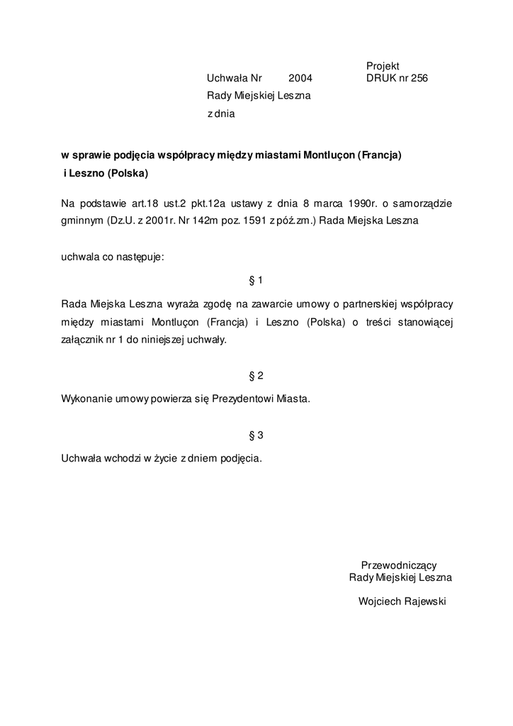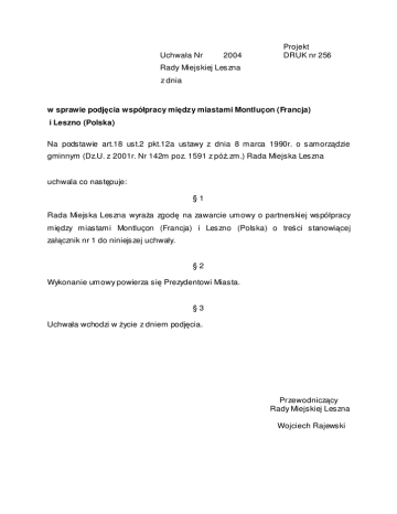 Uchwała Nr 2004 Projekt DRUK nr 256 Rady Miejskiej Leszna z dnia w sprawie podj cia współpracy mi dzy miastami Montluçon (Francja) i Leszno (Polska) Na podstawie art.18 ust.2 pkt.12a ustawy z dnia 8 marca 1990r. o samorz dzie gminnym (Dz.U. z 2001r. Nr 142m poz. 1591 z pó .zm.) Rada Miejska Leszna uchwala co nast puje: §1 Rada Miejska Leszna wyra a zgod na zawarcie umowy o partnerskiej współpracy mi dzy miastami Montluçon (Francja) i Leszno (Polska) o tre ci stanowi cej zał cznik nr 1 do niniejszej uchwały. §2 Wykonanie umowy powierza si Prezydentowi Miasta. §3 Uchwała wchodzi w ycie z dniem podj cia. Przewodnicz cy Rady Miejskiej Leszna Wojciech Rajewski Uzasadnienie do uchwały nr Rady Miejskiej Leszna z dnia w sprawie podj cia współpracy mi dzy miastami Montluçon (Francja) i Leszno (Polska) Miasto Leszno posiada dwie umowy partnerskie – z niemieckim Suhl z 1984r. oraz z holenderskim Deurne z 1989 roku. Pierwsze kontakty pomi dzy miastem Leszno i Montluçon zostały nawi zane w roku 2000 za po rednictwem firmy Deplast, która współpracuje z Montluçon. Podczas wizyty w maju 2004 roku mer miasta Montluçon zaproponował podpisanie umowy o współpracy. Obie strony wst pnie zaakceptowały program współpracy, który miałby by realizowany w ramach przyszłej umowy o partnerstwie. W programie tym uj to nast puj ce przedsi wzi cia: 1. Wizyty delegacji oficjalnych odbywa si b d przemiennie, co drugi rok. Przy czym wizyta w Lesznie b dzie miała miejsce przy okazji Dni Leszna (koniec maja danego roku), wizyta w Montluçon odb dzie si podczas targów (koniec wrze nia, pocz tek pa dziernika nast pnego roku). Zakres tematyczn y wizyty zostanie ustalony odpowiednio wcze niej. 2. Pomi dzy urz dami miast b dzie prowadzona wymiana pracowników. Co roku, na zmian 1-2 pracowników, ka dy po tygodniu, b dzie poznawa dany zakres działania urz du.Odpowiednie koszty w miejscu pobytu przejmuje miasto partnerskie. 3. Oba miasta b d wymienia si do wiadczeniami w zakresie organizacji i struktury urz dów miast oraz funkcjonowania rad miejskich. 4. Zakres wymiany kulturalnej obejmowa b dzie wystawy oraz prezentacje artystów w miastach partnerskich. Na koniec danego roku nast pi uzgodnienie odpowiednich propozycji. 5. Miasta b d wspiera nawi zywanie kontaktów gospodarczych pomi dzy lokalnymi przedsi biorcami oraz b d wymienia si do wiadczeniami w zakresie stymulowania przedsi biorczo ci we współpracy z miejscowym biznesem. 6. Leszno i Montluçon b d d y do prowadzenia wielostronnej wymiany młodzie y oraz innych zainteresowanych grup społeczno ci lokalnej. 7. Oba miasta wspiera b d nawi zywanie kontaktów pomi dzy odpowiednimi organizacjami pozarz dowymi działaj cymi w Lesznie i Montluçon. 8. Koordynacj przedsi wzi w ramach partnerstwa miast zajmuj ka dym z miast: Pełnomocnik mera ds. partnerstwa miast – Urz d Miasta Montluçon, Naczelnik Wydziału Promocji i Rozwoju – Urz d Miasta Leszna. Opracował: Wydział Promocji i Rozwoju si w