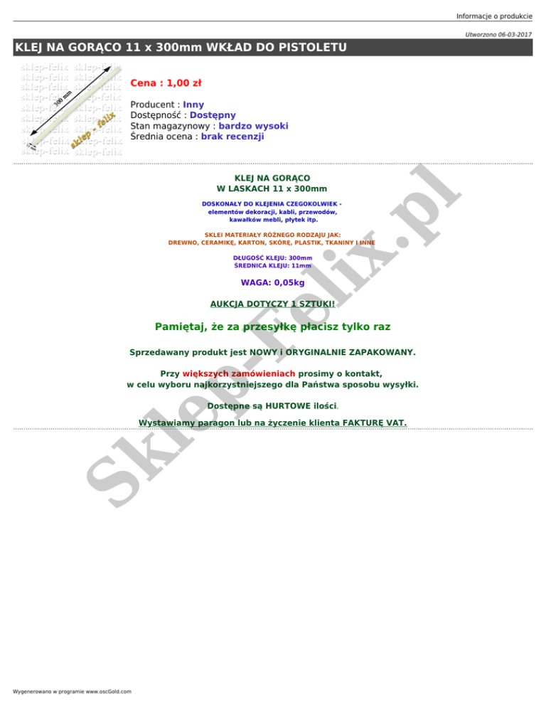 Informacje o produkcie Utworzono 06-03-2017 KLEJ NA GORĄCO 11 x 300mm WKŁAD DO PISTOLETU Cena : 1,00 zł Producent : Inny Dostępność : Dostępny Stan magazynowy : bardzo wysoki Średnia ocena : brak recenzji .p l KLEJ NA GORĄCO W LASKACH 11 x 300mm DOSKONAŁY DO KLEJENIA CZEGOKOLWIEK elementów dekoracji, kabli, przewodów, kawałków mebli, płytek itp. Fe lix SKLEI MATERIAŁY RÓŻNEGO RODZAJU JAK: DREWNO, CERAMIKĘ, KARTON, SKÓRĘ, PLASTIK, TKANINY I INNE DŁUGOŚĆ KLEJU: 300mm ŚREDNICA KLEJU: 11mm WAGA: 0,05kg AUKCJA DOTYCZY 1 SZTUKI! Pamiętaj, że za przesyłkę płacisz tylko raz Sk le p- Sprzedawany produkt jest NOWY i ORYGINALNIE ZAPAKOWANY. Przy większych zamówieniach prosimy o kontakt, w celu wyboru najkorzystniejszego dla Państwa sposobu wysyłki. Dostępne są HURTOWE ilości. Wystawiamy paragon lub na życzenie klienta FAKTURĘ VAT. Wygenerowano w programie www.oscGold.com