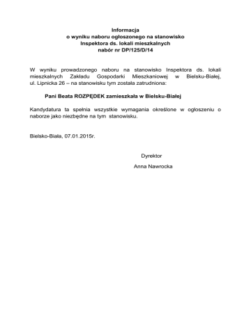 Informacja o wyniku naboru ogłoszonego na stanowisko Inspektora ds. lokali mieszkalnych nabór nr DP/125/D/14 W wyniku prowadzonego naboru na stanowisko Inspektora ds. lokali mieszkalnych Zakładu Gospodarki Mieszkaniowej w Bielsku-Białej, ul. Lipnicka 26 – na stanowisku tym została zatrudniona: Pani Beata ROZPĘDEK zamieszkała w Bielsku-Białej Kandydatura ta spełnia wszystkie wymagania określone w ogłoszeniu o naborze jako niezbędne na tym stanowisku. Bielsko-Biała, 07.01.2015r. Dyrektor Anna Nawrocka