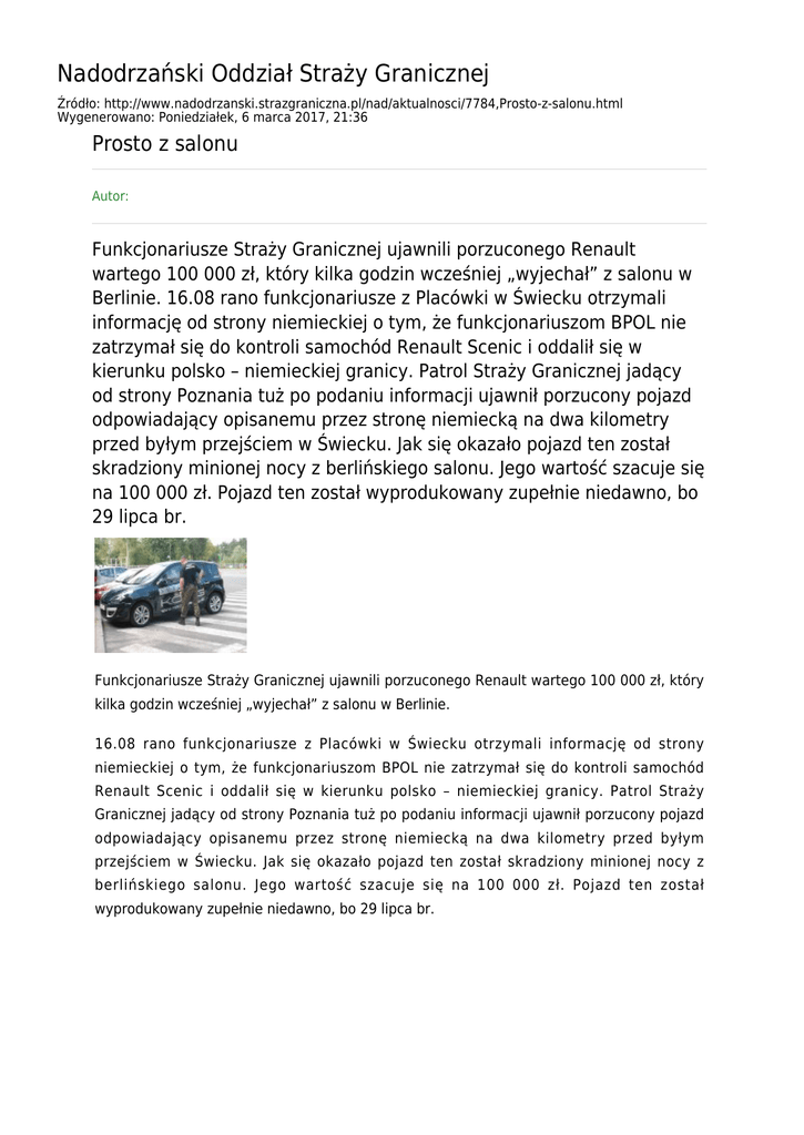 Nadodrzański Oddział Straży Granicznej Źródło: http://www.nadodrzanski.strazgraniczna.pl/nad/aktualnosci/7784,Prosto-z-salonu.html Wygenerowano: Poniedziałek, 6 marca 2017, 21:36 Prosto z salonu Autor: Funkcjonariusze Straży Granicznej ujawnili porzuconego Renault wartego 100 000 zł, który kilka godzin wcześniej „wyjechał” z salonu w Berlinie. 16.08 rano funkcjonariusze z Placówki w Świecku otrzymali informację od strony niemieckiej o tym, że funkcjonariuszom BPOL nie zatrzymał się do kontroli samochód Renault Scenic i oddalił się w kierunku polsko – niemieckiej granicy. Patrol Straży Granicznej jadący od strony Poznania tuż po podaniu informacji ujawnił porzucony pojazd odpowiadający opisanemu przez stronę niemiecką na dwa kilometry przed byłym przejściem w Świecku. Jak się okazało pojazd ten został skradziony minionej nocy z berlińskiego salonu. Jego wartość szacuje się na 100 000 zł. Pojazd ten został wyprodukowany zupełnie niedawno, bo 29 lipca br. Funkcjonariusze Straży Granicznej ujawnili porzuconego Renault wartego 100 000 zł, który kilka godzin wcześniej „wyjechał” z salonu w Berlinie. 16.08 rano funkcjonariusze z Placówki w Świecku otrzymali informację od strony niemieckiej o tym, że funkcjonariuszom BPOL nie zatrzymał się do kontroli samochód Renault Scenic i oddalił się w kierunku polsko – niemieckiej granicy. Patrol Straży Granicznej jadący od strony Poznania tuż po podaniu informacji ujawnił porzucony pojazd odpowiadający opisanemu przez stronę niemiecką na dwa kilometry przed byłym przejściem w Świecku. Jak się okazało pojazd ten został skradziony minionej nocy z berlińskiego salonu. Jego wartość szacuje się na 100 000 zł. Pojazd ten został wyprodukowany zupełnie niedawno, bo 29 lipca br.