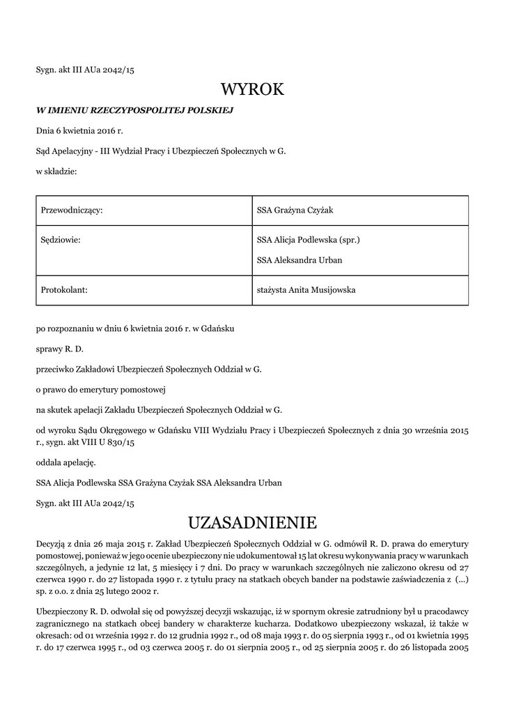 Sygn. akt III AUa 2042/15 WYROK W IMIENIU RZECZYPOSPOLITEJ POLSKIEJ Dnia 6 kwietnia 2016 r. Sąd Apelacyjny - III Wydział Pracy i Ubezpieczeń Społecznych w G. w składzie: Przewodniczący: SSA Grażyna Czyżak Sędziowie: SSA Alicja Podlewska (spr.) SSA Aleksandra Urban Protokolant: stażysta Anita Musijowska po rozpoznaniu w dniu 6 kwietnia 2016 r. w Gdańsku sprawy R. D. przeciwko Zakładowi Ubezpieczeń Społecznych Oddział w G. o prawo do emerytury pomostowej na skutek apelacji Zakładu Ubezpieczeń Społecznych Oddział w G. od wyroku Sądu Okręgowego w Gdańsku VIII Wydziału Pracy i Ubezpieczeń Społecznych z dnia 30 września 2015 r., sygn. akt VIII U 830/15 oddala apelację. SSA Alicja Podlewska SSA Grażyna Czyżak SSA Aleksandra Urban Sygn. akt III AUa 2042/15 UZASADNIENIE Decyzją z dnia 26 maja 2015 r. Zakład Ubezpieczeń Społecznych Oddział w G. odmówił R. D. prawa do emerytury pomostowej, ponieważ w jego ocenie ubezpieczony nie udokumentował 15 lat okresu wykonywania pracy w warunkach szczególnych, a jedynie 12 lat, 5 miesięcy i 7 dni. Do pracy w warunkach szczególnych nie zaliczono okresu od 27 czerwca 1990 r. do 27 listopada 1990 r. z tytułu pracy na statkach obcych bander na podstawie zaświadczenia z (...) sp. z o.o. z dnia 25 lutego 2002 r. Ubezpieczony R. D. odwołał się od powyższej decyzji wskazując, iż w spornym okresie zatrudniony był u pracodawcy zagranicznego na statkach obcej bandery w charakterze kucharza. Dodatkowo ubezpieczony wskazał, iż także w okresach: od 01 września 1992 r. do 12 grudnia 1992 r., od 08 maja 1993 r. do 05 sierpnia 1993 r., od 01 kwietnia 1995 r. do 17 czerwca 1995 r., od 03 czerwca 2005 r. do 01 sierpnia 2005 r., od 25 sierpnia 2005 r. do 26 listopada 2005 r., od 15 grudnia 2005 r. do 12 stycznia 2006 r., od 19 marca 2006 r. do 10 lipca 2006 r. od 14 października 2006 r. do 08 grudnia 2006 r., od 25 stycznia 2007 r. do 23 marca 2007 r., od 01 czerwca 2007 r. do 27 lipca 2007 r., od 30 sierpnia 2007 r. do 28 listopada 2007 r. ,od 13 grudnia 2007 r. do 12 stycznia 2008 r., od 19 marca 2008 r. do 16 czerwca 2008 r., od 27 listopada 2008 r. do 31 grudnia 2008 r., stale i w pełnym wymiarze czasu pracy wykonywał prace w warunkach szczególnych na statkach morskich. W odpowiedzi na odwołanie organ rentowy wniósł o jego oddalenie. Pozwany wyjaśnił, iż w okresie od 27.06.1990 do 27.11.1990r wnioskodawca nie był delegowany do pracy za granicę przez pracodawcę polskiego, a jedynie przez firmy pośredniczące, które zajmowały się kierowaniem polskich marynarzy do pracy za granica u obcych armatorów. Ubezpieczony w okresie wskazanym w zaświadczeniu z P. nie wykonywał pracy w ramach stosunku pracy na terytorium Rzeczypospolitej Polskiej (art. 2 pkt 3 w/w ustawy), a był jedynie skierowany za pośrednictwem w/w firmy do pracy u zagranicznych armatorów w systemie kontraktowym. W związku z powyższym, zdaniem organu rentowego P. nie jest zarówno płatnikiem, o którym mowa w art. 2 pkt 2 ustawy o emeryturach pomostowych, jak i podmiotem uprawnionym do wystawiania zaświadczeń na podstawie art. 51 ustawy o emeryturach pomostowych. Podsumowując pozwany zakwestionował zaświadczenie wystawione przez P. z dnia 25 lutego 2002r. o wykonywaniu pracy w warunkach szczególnych oraz okoliczność, że ubezpieczony ww. okresie wykonywał pracę w warunkach szczególnych w rozumieniu ustawy o emeryturach pomostowych. Organ emerytalny zarzucił również, iż ubezpieczony nie udokumentował zgodnie z obowiązującymi przepisami innych okresów pracy w warunkach szczególnych w rozumieniu ustawy o emeryturach pomostowych. Wyrokiem z dnia 30 września 2015r. sygn.. VIII U 830/15, Sąd Okręgowy w Gdańsku decyzję pozwanego i przyznał ubezpieczonemu prawo do emerytury pomostowej od dnia 7 maja 2015r. (punkt 1), stwierdził, iż pozwany ponosi odpowiedzialność za nieustalenie ostatniej okoliczności niezbędnej do wydania decyzji (punkt 2). Swoje rozstrzygnięcie Sąd I instancji oparł o następujące ustalenia faktyczne i prawne. Ubezpieczony R. D., ur. dnia (...), z zawodu kucharz-marynarz w dniu 27 kwietnia 2015 r. złożył w Zakładzie Ubezpieczeń Społecznych Oddział w G. wniosek o emeryturę pomostową. Na dzień wydania decyzji ubezpieczony udowodnił wymagany okres składkowy i nieskładkowy (tj. 29 lat, 8 dni), a w tym 12 lat, 5 miesięcy i 7 dni okresu pracy w warunkach szczególnych. Ubezpieczony nie pozostaje w stosunku pracy. Organ rentowy nie uwzględnił do stażu pracy w warunkach szczególnych okresów zatrudnienia wnioskodawcy od 27 czerwca 1990 r. do 27 listopada 1990 r. na podstawie zaświadczenia z (...) sp. z o.o. z dnia 25 lutego 2002 r. Zaskarżoną w sprawie decyzją z dnia 26 maja 2015 r. Zakład Ubezpieczeń Społecznych Oddział w G. odmówił R. D. prawa do emerytury pomostowej. W okresie od 09 lutego 1990 r. do 30 czerwca 1994 r. ubezpieczony korzystał z urlopu bezpłatnego w (...) celem zatrudnienia na statkach obcej bandery. Ubezpieczony był zatrudniony u armatorów zagranicznych za pośrednictwem (...) sp. z o.o. na stanowisku kucharza w okresie od 27 czerwca 1990 r. do 27 listopada 1990 r. (...) sp. z o.o. uiszczała na rzecz ZUS składki na ubezpieczenia społeczne i opłaty na Fundusz Pracy W okresach od 01 września 1992 r. do 12 grudnia 1992 r., od 08 maja 1993 r. do 05 sierpnia 1993 r., od 01 kwietnia 1995 r. do 17 czerwca 1995 r., od 03 czerwca 2005 r. do 01 sierpnia 2005 r. od 25 sierpnia 2005 r. do 26 listopada 2005 r., od 15 grudnia 2005 r. do 12 stycznia 2006 r. od 19 marca 2006 r. do 10 lipca 2006 r. od 14 października 2006 r. do 08 grudnia 2006 r. od 25 stycznia 2007 r. do 23 marca 2007 r. od 01 czerwca 2007 r. do 27 lipca 2007 r. od 30 sierpnia 2007 r. do 28 listopada 2007 r. od 13 grudnia 2007 r. do 12 stycznia 2008 r. od 19 marca 2008 r. do 16 czerwca 2008 r. od 27 listopada 2008 r. do 31 grudnia 2008 r. ubezpieczony zatrudniony był na statkach obcych bander w