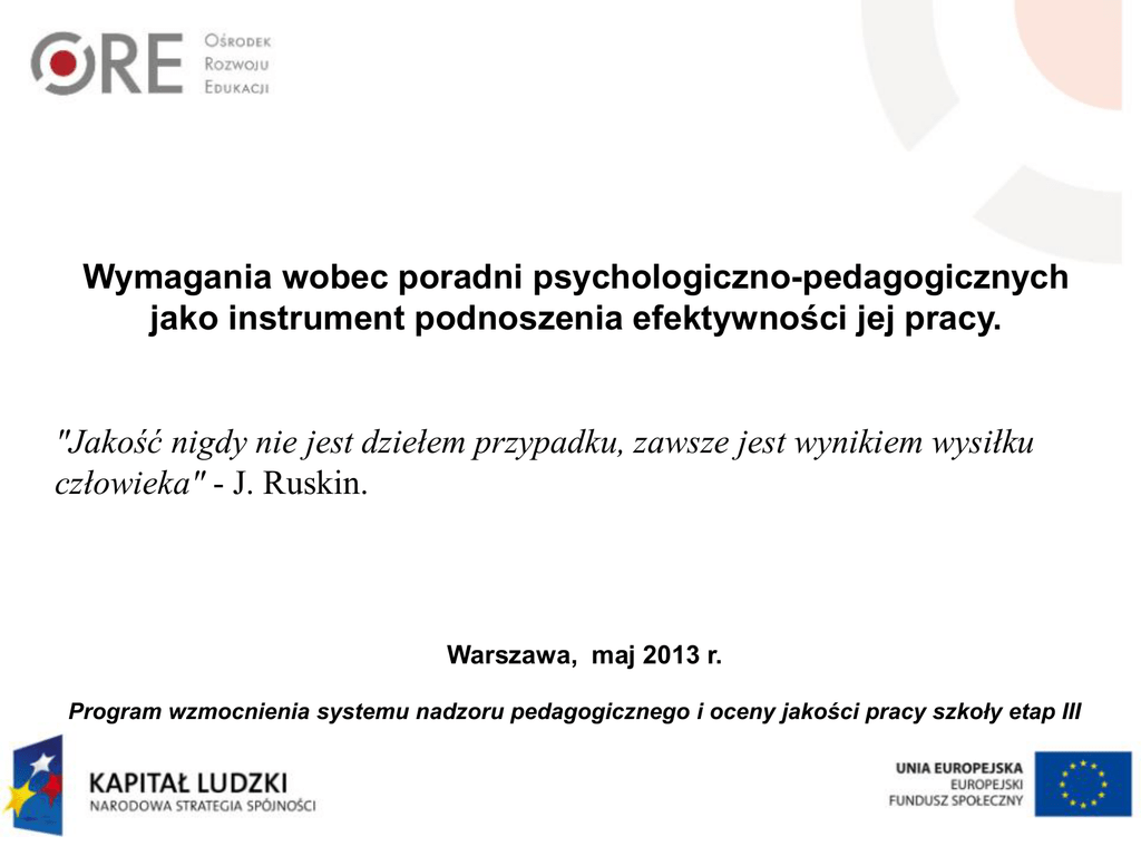 Wymagania wobec poradni psychologiczno-pedagogicznych jako instrument podnoszenia efektywności jej pracy. "Jakość nigdy nie jest dziełem przypadku, zawsze jest wynikiem wysiłku człowieka" - J. Ruskin. Warszawa, maj 2013 r. Program wzmocnienia systemu nadzoru pedagogicznego i oceny jakości pracy szkoły etap III SKĄD WYMAGANIA? •Ustawa z dnia 7 września 1991 r. o systemie oświaty (tekst jednolity: Dz.U. z 2004. Nr 256, poz. 2572 ze zm.): •Art. 35 – nadzór pedagogiczny; •Art. 71 ust.1 pkt 2 – zadania poradni •Art. 33 – zakres nadzoru; 1) ocenianie stanu i warunków działalności dydaktycznej, wychowawczej i opiekuńczej szkół, placówek i nauczycieli; 2) analizowanie i ocenianie efektów działalności dydaktycznej, wychowawczej i opiekuńczej oraz innej działalności statutowej szkół i placówek; 3) udzielanie pomocy szkołom, placówkom i nauczycielom w wykonywaniu ich zadań dydaktycznych, wychowawczych i opiekuńczych; 4) inspirowanie nauczycieli do innowacji pedagogicznych, metodycznych i organizacyjnych. Kluczowe aspekty nowego nadzoru pedagogicznego EWALUACJA - definicje • „Praktyczne badanie oceniające” - słowniczek rozporządzenia • „Systematyczne badanie wartości lub cech konkretnego programu, działania lub obiektu z punktu widzenia przyjętych w tym celu kryteriów w celu jego usprawnienia, rozwoju lub lepszego zrozumienia” - L.Korporowicz • „Zaproszenie do rozwoju” – Helen Simons Zmiana w systemie nadzoru pedagogicznego odpowiedzią na wyzwania. • Krytyczne myślenie i odpowiedzialne zaangażowanie jako cele systemu edukacji. • Nieznana przyszłość determinantą celów szkoły. • Idee nowego nadzoru pedagogicznego. • Jawność jednolitych wymagań sposobem na wyrównywanie szans. • Wprowadzenie ewaluacji w sprawowanie nadzoru pedagogicznego szansą na jakościowy rozwój szkoły/placówki. Wymagania państwa – uporządkowanie priorytetów i celów szkoły/placówki. • Wymagania jako zalecane kierunki działań szkoły/placówki decydujące o kapitale ludzkim. • Wymagania jako pożądany model szkoły/placówki. • Wymagania jako zadanie dla całego systemu edukacyjnego (całych społeczeństw). • Wymagania a uczeń w systemie oświaty. Wymagania państwa wobec szkół i placówek a nadzór pedagogiczny • Rozporządzenie Ministra Edukacji Narodowej z dnia 7 października 2009 r. w sprawie nadzoru pedagogicznego – zmiany z dnia 10 maja 2013 r. • Wymagania państwa – przedmiot ewaluacji zewnętrznej: – – – – – – 12 dla szkół 12 dla przedszkoli, 11 dla MOW, MOS, SOSzW, 8 dla PPP, PDN, BP, 6 dla SOW, BURS, 5 dla placówek oświatowo - wychowawczych Dlaczego wymagania? 1. 2. 3. 4. Umożliwiają wskazanie, jakie zadania szkoła/placówka powinna wypełniać Pokazują szkole/placówce jak powinna pracować i wskazują jej drogi rozwoju. Ich wypełnianie poddawane jest ewaluacji zewnętrznej - ustalenie „mapy” szkoły /placówki z jej mocnymi i słabymi stronami . Połączenie informacji o szkole płynącej z systemu egzaminów zewnętrznych z innymi, bardzo istotnymi informacjami o pracy szkoły. Jak tworzono wymagania? 5. 6. 7. 8. Źródła wymagań. Kluczowe, najważniejsze kwestie Dyskusja w gronie ekspertów, praktyków, prawników. Z myślą o dostosowaniu do rzeczywistości, w odpowiedzi na wyzwania współczesnego społeczeństwa Wyzwania współczesności a rola szkoły/systemu oświaty. Niektóre determinanty myślenia o edukacji: • • • • • • • • • nieograniczony dostęp do informacji, zaawansowane technologie, człowiek w integrującej się Europie, globalizującym się świecie, zagrożenia ekologiczne, nieustanna i nieprzewidywalna zmiana, wysokie standardy jakości, zmiany na rynku pracy, konieczność budowania relacji międzykulturowych, inne spojrzenie na koncepcje równości czy wolności ….. 1. Placówka realizuje koncepcję pracy • • • Placówka działa zgodnie z przyjętą własną koncepcją pracy, uwzględniającą potrzeby rozwojowe osób oraz potrzeby instytucji i organizacji korzystających z jej oferty, specyfikę pracy placówki oraz zidentyfikowane oczekiwania środowiska lokalnego. Koncepcja pracy placówki jest znana osobom, instytucjom i organizacjom korzystającym z oferty placówki. Realizowana koncepcja pracy placówki jest monitorowana i, w razie potrzeb, modyfikowana z uwzględnieniem oczekiwań osób, instytucji i organizacji korzystających z oferty placówki. • • • • • • • • • • • Określenie celów i sposobów ich realizacji warunkiem skutecznej pracy placówki. Umiejętność skupiania działań wokół podobnych wartości i celów, znajomość i akceptacja koncepcji. Czy warto? skutecznie działać? myśleć o przyszłości, przyspieszać rozwój? zapewnić ten sam kierunek działania wszystkim członkom organizacji? koncentrować uwagę na tym co najważniejsze? racjonalnie zarządzać zasobami, w tym czasem? reagować na wyzwania płynące z otoczenia, nabierając dystansu do spraw bieżących, tworzyć klimat dla wprowadzania zmian? mieć pomysł na pokonanie konkurencji? posiadać weryfikator trafności wyborów, godzący różne racje i punkty widzenia? 2. Procesy edukacyjne są zorganizowane w sposób sprzyjający rozwojowi osób, instytucji i organizacji korzystających z oferty placówki • • • • • Planowanie procesów edukacyjnych w placówce służy rozwojowi osób, instytucji i organizacji korzystających z oferty placówki. W realizacji zadań stosuje się różne formy i metody pracy dostosowane do potrzeb osób, instytucji i organizacji korzystających z oferty placówki. Placówka pozyskuje informacje od osób, instytucji i organizacji, które skorzystały z oferty placówki, na temat podejmowanych przez placówkę działań. • W placówce stosuje się nowatorskie rozwiązania służące rozwojowi osób, instytucji i organizacji korzystających z oferty placówki. Wnioski