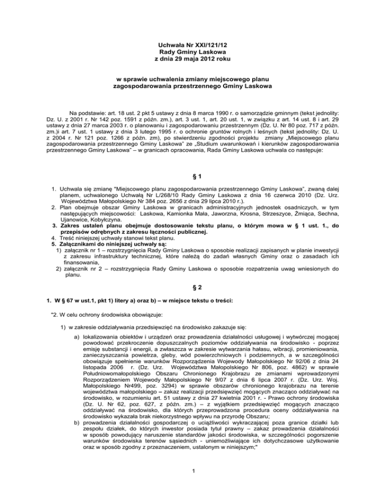 Uchwała Nr XXI/121/12 Rady Gminy Laskowa z dnia 29 maja 2012 roku w sprawie uchwalenia zmiany miejscowego planu zagospodarowania przestrzennego Gminy Laskowa Na podstawie: art. 18 ust. 2 pkt 5 ustawy z dnia 8 marca 1990 r. o samorządzie gminnym (tekst jednolity: Dz. U. z 2001 r. Nr 142 poz. 1591 z późn. zm.), art. 3 ust. 1, art. 20 ust. 1, w związku z art. 14 ust. 8 i art. 29 ustawy z dnia 27 marca 2003 r. o planowaniu i zagospodarowaniu przestrzennym (Dz. U. Nr 80 poz. 717 z późn. zm.)i art. 7 ust. 1 ustawy z dnia 3 lutego 1995 r. o ochronie gruntów rolnych i leśnych (tekst jednolity: Dz. U. z 2004 r. Nr 121 poz. 1266 z późn. zm), po stwierdzeniu zgodności projektu zmiany „Miejscowego planu zagospodarowania przestrzennego Gminy Laskowa” ze „Studium uwarunkowań i kierunków zagospodarowania przestrzennego Gminy Laskowa” – w granicach opracowania, Rada Gminy Laskowa uchwala co następuje: §1 1. Uchwala się zmianę "Miejscowego planu zagospodarowania przestrzennego Gminy Laskowa”, zwaną dalej planem, uchwalonego Uchwałą Nr L/268/10 Rady Gminy Laskowa z dnia 16 czerwca 2010 (Dz. Urz. Województwa Małopolskiego Nr 384 poz. 2656 z dnia 29 lipca 2010 r.). 2. Plan obejmuje obszar Gminy Laskowa w granicach administracyjnych jednostek osadniczych, w tym następujących miejscowości: Laskowa, Kamionka Mała, Jaworzna, Krosna, Strzeszyce, Żmiąca, Sechna, Ujanowice, Kobyłczyna. 3. Zakres ustaleń planu obejmuje dostosowanie tekstu planu, o którym mowa w § 1 ust. 1., do przepisów odrębnych z zakresu łączności publicznej. 4. Treść niniejszej uchwały stanowi tekst planu. 5. Załącznikami do niniejszej uchwały są: 1) załącznik nr 1 – rozstrzygnięcia Rady Gminy Laskowa o sposobie realizacji zapisanych w planie inwestycji z zakresu infrastruktury technicznej, które należą do zadań własnych Gminy oraz o zasadach ich finansowania, 2) załącznik nr 2 – rozstrzygnięcia Rady Gminy Laskowa o sposobie rozpatrzenia uwag wniesionych do planu. §2 1. W § 67 w ust.1, pkt 1) litery a) oraz b) – w miejsce tekstu o treści: "2. W celu ochrony środowiska obowiązuje: 1) w zakresie oddziaływania przedsięwzięć na środowisko zakazuje się: a) lokalizowania obiektów i urządzeń oraz prowadzenia działalności usługowej i wytwórczej mogącej powodować przekroczenie dopuszczalnych poziomów oddziaływania na środowisko - poprzez emisję substancji i energii, a zwłaszcza w zakresie wytwarzania hałasu, wibracji, promieniowania, zanieczyszczania powietrza, gleby, wód powierzchniowych i podziemnych, a w szczególności obowiązuje spełnienie warunków Rozporządzenia Wojewody Małopolskiego Nr 92/06 z dnia 24 listopada 2006 r. (Dz. Urz. Województwa Małopolskiego Nr 806, poz. 4862) w sprawie Południowomałopolskiego Obszaru Chronionego Krajobrazu ze zmianami wprowadzonymi Rozporządzeniem Wojewody Małopolskiego Nr 9/07 z dnia 6 lipca 2007 r. (Dz. Urz. Woj. Małopolskiego Nr499, poz. 3294) w sprawie obszarów chronionego krajobrazu na terenie województwa małopolskiego – zakaz realizacji przedsięwzięć mogących znacząco oddziaływać na środowisko, w rozumieniu art. 51 ustawy z dnia 27 kwietnia 2001 r. - Prawo ochrony środowiska (Dz. U. Nr 62, poz. 627, z późn. zm.) – z wyjątkiem przedsięwzięć mogących znacząco oddziaływać na środowisko, dla których przeprowadzona procedura oceny oddziaływania na środowisko wykazała brak niekorzystnego wpływu na przyrodę Obszaru; b) prowadzenia działalności gospodarczej o uciążliwości wykraczającej poza granice działki lub zespołu działek, do których inwestor posiada tytuł prawny – zakaz prowadzenia działalności w sposób powodujący naruszenie standardów jakości środowiska, w szczególności pogorszenie warunków środowiska terenów sąsiednich - uniemożliwiające ich dotychczasowe użytkowanie oraz w sposób zgodny z przeznaczeniem, ustalonym w niniejszym;" 1 wprowadza się tekst o treści: "2. W celu ochrony środowiska obowiązuje: 1) w zakresie oddziaływania przedsięwzięć na środowisko zakazuje się: a) lokalizowania obiektów i urządzeń oraz prowadzenia działalności usługowej i wytwórczej mogącej powodować przekroczenie dopuszczalnych poziomów oddziaływania na środowisko - poprzez emisję substancji i energii, a zwłaszcza w zakresie wytwarzania hałasu, wibracji, promieniowania, zanieczyszczania powietrza, gleby, wód powierzchniowych i podziemnych, a w szczególności obowiązuje spełnienie warunków Rozporządzenia Wojewody Małopolskiego Nr 92/06 z dnia 24 listopada 2006 r. (Dz. Urz. Województwa Małopolskiego Nr 806, poz. 4862) w sprawie Południowomałopolskiego Obszaru Chronionego Krajobrazu ze zmianami wprowadzonymi Rozporządzeniem Wojewody Małopolskiego Nr 9/07 z dnia 6 lipca 2007 r. (Dz. Urz. Woj. Małopolskiego Nr499, poz. 3294) w sprawie obszarów chronionego krajobrazu na terenie województwa małopolskiego – zakaz realizacji przedsięwzięć mogących znacząco oddziaływać na środowisko, w rozumieniu art. 51 ustawy z dnia 27 kwietnia 2001 r. - Prawo ochrony środowiska (Dz. U. Nr 62, poz. 627, z późn. zm.) – z wyjątkiem przedsięwzięć mogących znacząco oddziaływać na środowisko, dla których przeprowadzona procedura oceny oddziaływania na środowisko wykazała brak niekorzystnego wpływu na przyrodę Obszaru – w przypadku inwestycji z zakresu łączności publicznej obowiązuje spełnienie warunków wynikających z przepisów odrębnych; b) prowadzenia działalności gospodarczej o uciążliwości wykraczającej poza granice działki lub zespołu działek, do których inwestor posiada tytuł prawny – zakaz prowadzenia działalności w sposób powodujący naruszenie standardów jakości środowiska, w szczególności pogorszenie warunków środowiska terenów sąsiednich - uniemożliwiające ich dotychczasowe użytkowanie oraz w sposób zgodny z przeznaczeniem, ustalonym w niniejszym planie – w przypadku i