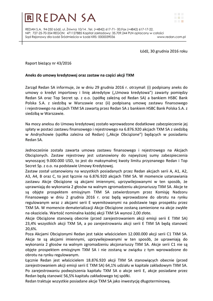 REDAN S.A. 94-250 Łódź, ul. Żniwna 10/14 , Tel. (+4842) 617-71- 00,Fax (+4842) 617-17-22, NIP: 727-25-70-554 REGON: 471127885 Kapitał zakładowy: 35.709.244 PLN opłacony w całości Sąd Rejonowy dla Łodzi Śródmieścia w Łodzi KRS: 0000039036 www.redan.com.pl Łódź, 30 grudnia 2016 roku Raport bieżący nr 43/2016 Aneks do umowy kredytowej oraz zastaw na części akcji TXM Zarząd Redan SA informuje, że w dniu 29 grudnia 2016 r. otrzymał: (i) podpisany aneks do umowy o kredyt importowy i linię akredytyw („Umowa kredytowa”) zawarty pomiędzy Redan SA oraz Top Secret sp. z o.o. (spółkę zależną od Redan SA) a bankiem HSBC Bank Polska S.A. z siedzibą w Warszawie oraz (ii) podpisaną umowę zastawu finansowego i rejestrowego na akcjach TXM SA zawartą przez Redan SA z bankiem HSBC Bank Polska S.A. z siedzibą w Warszawie. Na mocy aneksu do Umowy kredytowej zostało wprowadzone dodatkowe zabezpieczenie jej spłaty w postaci zastawu finansowego i rejestrowego na 6.876.920 akcjach TXM SA z siedzibą w Andrychowie (spółka zależna od Redan) („Akcje Obciążone”) będących w posiadaniu Redan SA. Jednocześnie została zawarta umowa zastawu finansowego i rejestrowego na Akcjach Obciążonych. Zastaw rejestrowy jest ustanowiony do najwyższej sumy zabezpieczenia wynoszącej 9.000.000 USD, to jest do maksymalnej kwoty limitu przyznanego Redan i Top Secret Sp. z o.o. na podstawie Umowy Kredytowej. Zastaw został ustanowiony na wszystkich posiadanych przez Redan akcjach serii A, A1, A2, A3, A4, B oraz C, to jest łącznie na 6.876.920 akcjach TXM SA. W momencie ustanawiania zastawu Akcje Obciążone są akcjami imiennymi, uprzywilejowanymi w ten sposób, że uprawniają do wykonania 2 głosów na walnym zgromadzeniu akcjonariuszy TXM SA. Akcje te są objęte prospektem emisyjnym TXM SA zatwierdzonym przez Komisję Nadzoru Finansowego w dniu 2 grudnia 2016 r. oraz będą wprowadzone do obrotu na rynku regulowanym wraz z akcjami serii E wyemitowanymi na podstawie tego prospektu przez TXM SA. W momencie dematerializacji Akcje Obciążone zostaną zamienione na akcje zwykłe na okaziciela. Wartość nominalna każdej akcji TXM SA wynosi 2,00 złote. Akcje Obciążone stanowią obecnie (przed zarejestrowaniem akcji emisji serii E TXM SA) 23,4% wszystkich akcji TXM SA, a po zarejestrowaniu akcji serii E TXM SA będą stanowić 20,6%. Poza Akcjami Obciążonymi Redan jest także właścicielem 12.000.000 akcji serii C1 TXM SA. Akcje te są akcjami imiennymi, uprzywilejowanymi w ten sposób, że uprawniają do wykonania 2 głosów na walnym zgromadzeniu akcjonariuszy TXM SA. Akcje serii C1 nie są objęte prospektem emisyjnym TXM SA i nie zostaną w związku z tym wprowadzone do obrotu na rynku regulowanym. Łącznie Redan jest właścicielem 18.876.920 akcji TXM SA stanowiących obecnie (przed zarejestrowaniem akcji emisji serii E TXM SA) 64,1% udziału w kapitale zakładowym TXM SA. Po zarejestrowaniu podwyższenia kapitału TXM SA o akcje serii E, akcje posiadane przez Redan będą stanowić 56,5% kapitału zakładowego tej spółki. Redan traktuje wszystkie posiadane akcje TXM SA jako inwestycję długoterminową. Pomiędzy Redan oraz osobami zarządzającymi lub nadzorującymi Redan a Bankiem HSBC Polska SA lub osobami nim zarządzającymi nie istnieją inne powiązania poza Umową Kredytową oraz standardowymi usługami bankowymi świadczonymi przez Bank HSBC Polska SA na rzecz spółek z Grupy Kapitałowej Redan. Umowa Kredytowa jest umową znaczącą z uwagi na fakt, że łączna wartość przyznanego przez HSBC Bank Polska S.A. limitu wynosi 9 mln USD, co przekracza 10% kapitałów własnych Redan. Umowa zastawu na Akcjach Obciążonych została uznana za znaczącą, gdyż wartość Akcji Obciążonych wynosi ok. 37,8 mln zł, co przekracza 10% kapitałów własnych Redan. Podstawa Prawna: Art. 17 ust 1 MAR - informacje poufne Bogusz Kruszyński Prezes Zarządu