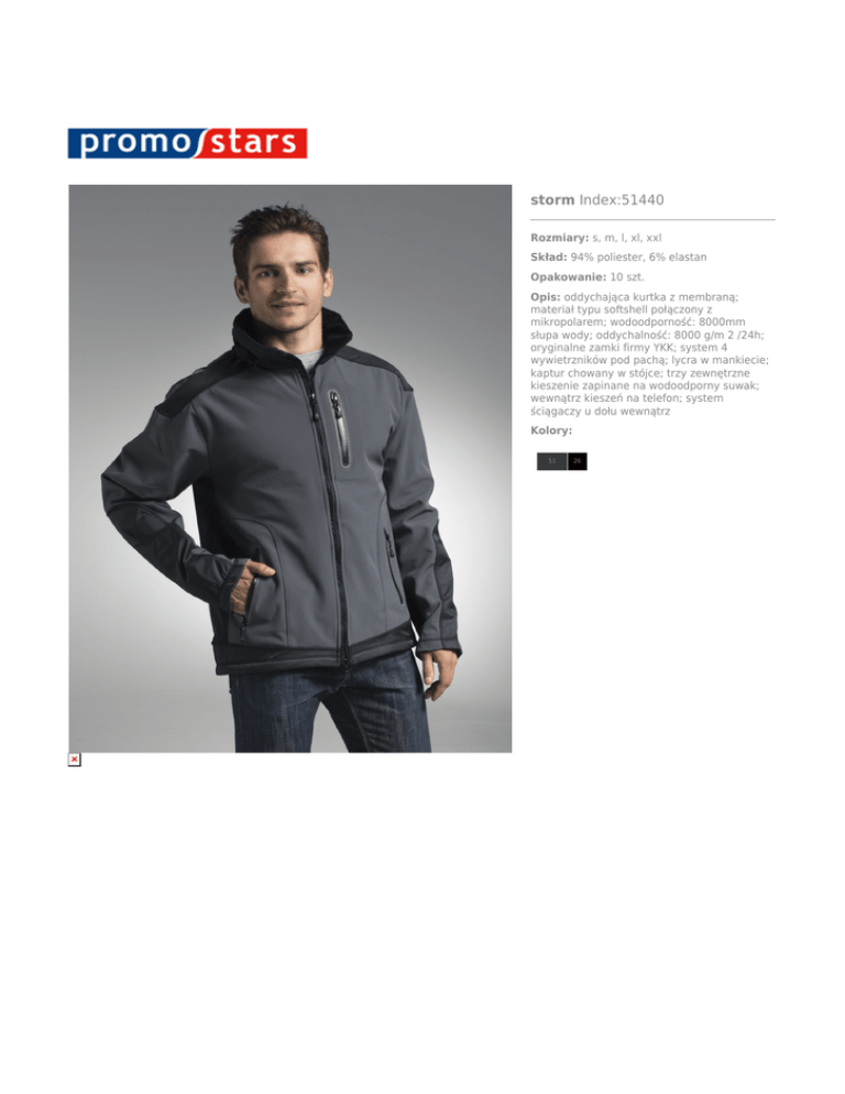 storm Index:51440 Rozmiary: s, m, l, xl, xxl Skład: 94% poliester, 6% elastan Opakowanie: 10 szt. Opis: oddychająca kurtka z membraną; materiał typu softshell połączony z mikropolarem; wodoodporność: 8000mm słupa wody; oddychalność: 8000 g/m 2 /24h; oryginalne zamki firmy YKK; system 4 wywietrzników pod pachą; lycra w mankiecie; kaptur chowany w stójce; trzy zewnętrzne kieszenie zapinane na wodoodporny suwak; wewnątrz kieszeń na telefon; system ściągaczy u dołu wewnątrz Kolory: 51 26