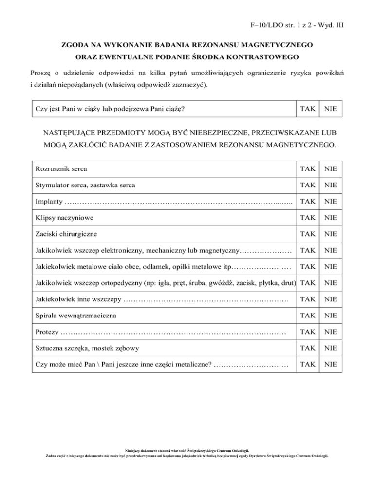 F–10/LDO str. 1 z 2 - Wyd. III ZGODA NA WYKONANIE BADANIA REZONANSU MAGNETYCZNEGO ORAZ EWENTUALNE PODANIE ŚRODKA KONTRASTOWEGO Proszę o udzielenie odpowiedzi na kilka pytań umożliwiających ograniczenie ryzyka powikłań i działań niepożądanych (właściwą odpowiedź zaznaczyć). Czy jest Pani w ciąży lub podejrzewa Pani ciążę? TAK NIE NASTĘPUJĄCE PRZEDMIOTY MOGĄ BYĆ NIEBEZPIECZNE, PRZECIWSKAZANE LUB MOGĄ ZAKŁÓCIĆ BADANIE Z ZASTOSOWANIEM REZONANSU MAGNETYCZNEGO. Rozrusznik serca TAK NIE Stymulator serca, zastawka serca TAK NIE Implanty …………………………………………………………………………...….. TAK NIE Klipsy naczyniowe TAK NIE Zaciski chirurgiczne TAK NIE Jakikolwiek wszczep elektroniczny, mechaniczny lub magnetyczny………………… TAK NIE Jakiekolwiek metalowe ciało obce, odłamek, opiłki metalowe itp…………………… TAK NIE Jakikolwiek wszczep ortopedyczny (np: igła, pręt, śruba, gwóźdź, zacisk, płytka, drut) TAK NIE Jakiekolwiek inne wszczepy ………………………………………………………… TAK NIE Spirala wewnątrzmaciczna TAK NIE Protezy ……………………………………………………………………………… TAK NIE Sztuczna szczęka, mostek zębowy TAK NIE Czy może mieć Pan \ Pani jeszcze inne części metaliczne? ………………………… TAK NIE Niniejszy dokument stanowi własność Świętokrzyskiego Centrum Onkologii. Żadna część niniejszego dokumentu nie może być przedrukowywana ani kopiowana jakąkolwiek techniką bez pisemnej zgody Dyrektora Świętokrzyskiego Centrum Onkologii. F–10/LDO str. 2 z 2 - Wyd. III W niektórych rodzajach badań wymagane jest dożylne podanie środka kontrastowego celem dokładniejszego uwidocznienia narządów wewnętrznych i struktur anatomicznych. Niekiedy środki kontrastowe mogą wywoływać działania niepożądane. Gdyby tak się zdarzyło otrzyma Pan/Pani pomoc i zalecenia dotyczące dalszego postępowania. Większość działań niepożądanych ma przebieg łagodny i krótkotrwały i ustępuje samoistnie. Możliwe działania niepożądane po podaniu środków kontrastowych: - często – bóle głowy, nudności, uczucie gorąca. - sporadycznie – zmiany ciśnienia krwi, suchość w ustach, wymioty, biegunka, zawroty głowy, nadmierne pocenie się, uczucie osłabienia, dreszcze, podwyższona temperatura, swędzenie skóry, wysypka, pokrzywka, omdlenie, zgaga, ból w jamie brzusznej, ból mięśni, obrzęk twarzy, obrzęk krtani, skurcz oskrzeli, ból w klatce, wynaczynienie środka kontrastowego. - wyjątkowo rzadko – drgawki, zapalanie trzustki, obrzęk płuc, zatrzymanie oddechu, zatrzymanie krążenia, wzrost ciśnienia płynu w mózgu (nadciśnienie śródczaszkowe), wstrząs anafilaktyczny. U pacjentów z niewydolnością nerek obserwowano w pojedynczych przypadkach po podaniu środka kontrastowego nasilenie niewydolności nerek i wystąpienie zespołu NFS (nerkopochodne zwłóknienie układowe), dlatego pacjenci muszą poinformować personel o wszelkich chorobach nerek. Ja niżej podpisany/a potwierdzam, że treść i sposób wypełnienia formularza jest dla mnie zrozumiała i wyjaśniono mi wszelkie wątpliwości. Jednocześnie oświadczam, że podane informacje są zgodne ze stanem faktycznym. Wyrażam zgodę na badanie za pomocą Rezonansu Magnetycznego Nie wyrażam zgody na badanie za pomocą Rezonansu Magnetycznego …………………………………………………… …………………………………………………… Data i podpis pacjenta lub prawnego opiekuna Data i podpis pacjenta lub prawnego opiekuna W przypadku braku zgody na podanie środka kontrastowego przyjmuję pełną odpowiedzialność za konsekwencje opóźnionej lub niepełnej diagnozy. Wyrażam zgodę na ewentualne dożylne podanie Nie wyrażam zgody na ewentualne dożylne środka kontrastowego podanie środka kontrastowego …………………………………………………… …………………………………………………… Data i podpis pacjenta lub prawnego opiekuna Data i podpis pacjenta lub prawnego opiekuna Pacjent nie jest w stanie podjąć świadomej Potwierdzam, że pacjent został poinformowany decyzji z powodu: ……………………………… o sposobie badania i powikłaniach mogących …………………………………………………… powstać w wyniku przeprowadzonych procedur …………………………………………………… …………………………………………………… …………………………………………………… Data, pieczątka i podpis lekarza nadzorującego badanie Data, pieczątka i podpis lekarza nadzorującego badanie Niniejszy dokument stanowi własność Świętokrzyskiego Centrum Onkologii. Żadna część niniejszego dokumentu nie może być przedrukowywana ani kopiowana jakąkolwiek techniką bez pisemnej zgody Dyrektora Świętokrzyskiego Centrum Onkologii.
