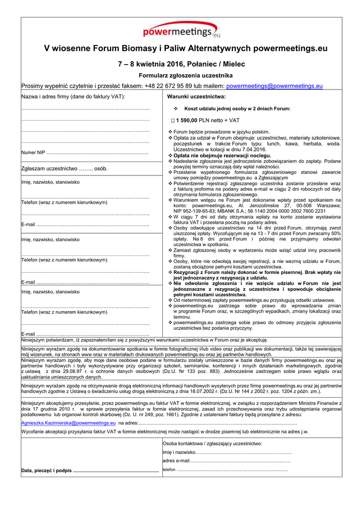 V wiosenne Forum Biomasy i Paliw Alternatywnych powermeetings.eu 7 – 8 kwietnia 2016, Połaniec / Mielec Formularz zgłoszenia uczestnika Prosimy wypełnić czytelnie i przesłać faksem: +48 22 672 95 89 lub mailem: [email protected] Nazwa i adres firmy (dane do faktury VAT): …………………………………………………………………….. …………………………………………………………………….. …………………………………………………………………….. …………………………………………………………………….. Numer NIP ............................................................................ Zgłaszam uczestnictwo …….. osób. Imię, nazwisko, stanowisko …………………………………………………………………….. Telefon (wraz z numerem kierunkowym) …………………………………………………………………….. E-mail ...………………………………………………………….. Imię, nazwisko, stanowisko …………………………………………………………………….. Telefon (wraz z numerem kierunkowym) …………………………………………………………………….. E-mail ...………………………………………………………….. Imię, nazwisko, stanowisko …………………………………………………………………….. Telefon (wraz z numerem kierunkowym) …………………………………………………………………….. Warunki uczestnictwa: Koszt udziału jednej osoby w 2 dniach Forum: 1 590,00 PLN netto + VAT Forum będzie prowadzone w języku polskim. Opłata za udział w Forum obejmuje: uczestnictwo, materiały szkoleniowe, poczęstunek w trakcie Forum typu: lunch, kawa, herbata, woda. Uczestnictwo w kolacji w dniu 7.04.2016. Opłata nie obejmuje rezerwacji noclegu. Nadesłanie zgłoszenia jest jednocześnie zobowiązaniem do zapłaty. Podane powyżej terminy oznaczają daty wpłat należności. Przesłanie wypełnionego formularza zgłoszeniowego stanowi zawarcie umowy pomiędzy powermeetings.eu a Zgłaszającym Potwierdzenie rejestracji zgłaszanego uczestnika zostanie przesłane wraz z fakturą proforma na podany adres e-mail w ciągu 2 dni roboczych od daty otrzymania formularza zgłoszeniowego. Warunkiem wstępu na Forum jest dokonanie wpłaty przed spotkaniem na konto: powermeetings.eu, Al. Jerozolimskie 27, 00-508 Warszawa; NIP 952-139-65-83; MBANK S.A.; 56 1140 2004 0000 3502 7600 2231 W ciągu 7 dni od daty otrzymania wpłaty na konto zostanie wystawiona faktura VAT i przesłana pocztą na podany adres. Osoby odwołujące uczestnictwo na 14 dni przed Forum, otrzymają zwrot uiszczonej opłaty. Wycofującym się na 13 - 7 dni przed Forum zwracamy 50% opłaty. Na 6 dni przed Forum i później nie przyjmujemy odwołań uczestnictwa w spotkaniu. Zamiast zgłoszonej osoby w wydarzeniu może wziąć udział inny pracownik firmy. Osoby, które nie odwołają swojej rejestracji, a nie wezmą udziału w Forum, zostaną obciążone pełnymi kosztami uczestnictwa. Rezygnacji z Forum należy dokonać w formie pisemnej. Brak wpłaty nie jest jednoznaczny z rezygnacją z udziału. Nie odwołanie zgłoszenia i nie wzięcie udziału w Forum nie jest jednoznaczne z rezygnacją z uczestnictwa i spowoduje obciążenie pełnymi kosztami uczestnictwa. Od nieterminowej zapłaty powermeetings.eu przysługują odsetki ustawowe. powermeetings.eu zastrzega sobie prawo do wprowadzania zmian w programie Forum oraz, w szczególnych wypadkach, zmiany lokalizacji oraz terminu. powermeetings.eu zastrzega sobie prawo do odmowy przyjęcia zgłoszenia uczestnictwa bez podania przyczyny. E-mail ...………………………………………………………….. Niniejszym potwierdzam, iż zapoznałem/łam się z powyższymi warunkami uczestnictwa w Forum oraz je akceptuję. Niniejszym wyrażam zgodę na dokumentowanie spotkania w formie fotograficznej i/lub video oraz publikacji ww dokumentacji, także tej zawierającej mój wizerunek, na stronach www oraz w materiałach drukowanych powermeetings.eu oraz jej partnerów handlowych. Niniejszym wyrażam zgodę, aby moje dane osobowe podane w formularzu zostały umieszczone w bazie danych firmy powermeetings.eu oraz jej partnerów handlowych i były wykorzystywane przy organizacji szkoleń, seminariów, konferencji i innych działaniach marketingowych, zgodnie z ustawą z dnia 29.08.97 r. o ochronie danych osobowych (Dz.U. Nr 133 poz. 883). Jednocześnie zastrzegam sobie prawo wglądu oraz uaktualniania umieszczonych danych. Niniejszym wyrażam zgodę na otrzymywanie drogą elektroniczną informacji handlowych wysyłanych przez firmę powermeetings.eu oraz jej partnerów handlowych zgodnie z Ustawą o świadczeniu usług drogą elektroniczną z dnia 18.07.2002 r. (Dz.U. Nr 144 z 2002 r. poz. 1204 z późn. zm.). Niniejszym akceptujemy przesyłanie, przez powermeetings.eu faktur VAT w formie elektronicznej, w związku z rozporządzeniem Ministra Finansów z dnia 17 grudnia 2010 r. w sprawie przesyłania faktur w formie elektronicznej, zasad ich przechowywania oraz trybu udostępniania organowi podatkowemu lub organowi kontroli skarbowej (Dz. U. nr 249, poz. 1661). Zgodnie z ustaleniami faktury będą przesyłane z adresu: [email protected] na adres:...................................................................................................................... Wycofanie akceptacji przysyłania faktur VAT w formie elektronicznej może nastąpić w drodze pisemnej lub elektronicznie na adres j.w. Osoba kontaktowa / zgłaszający uczestnictwo: imię i nazwisko…………………………………………………… adres e-mail……………………………………………………… Data, pieczęć i podpis ................................................................ telefon ………………………………………