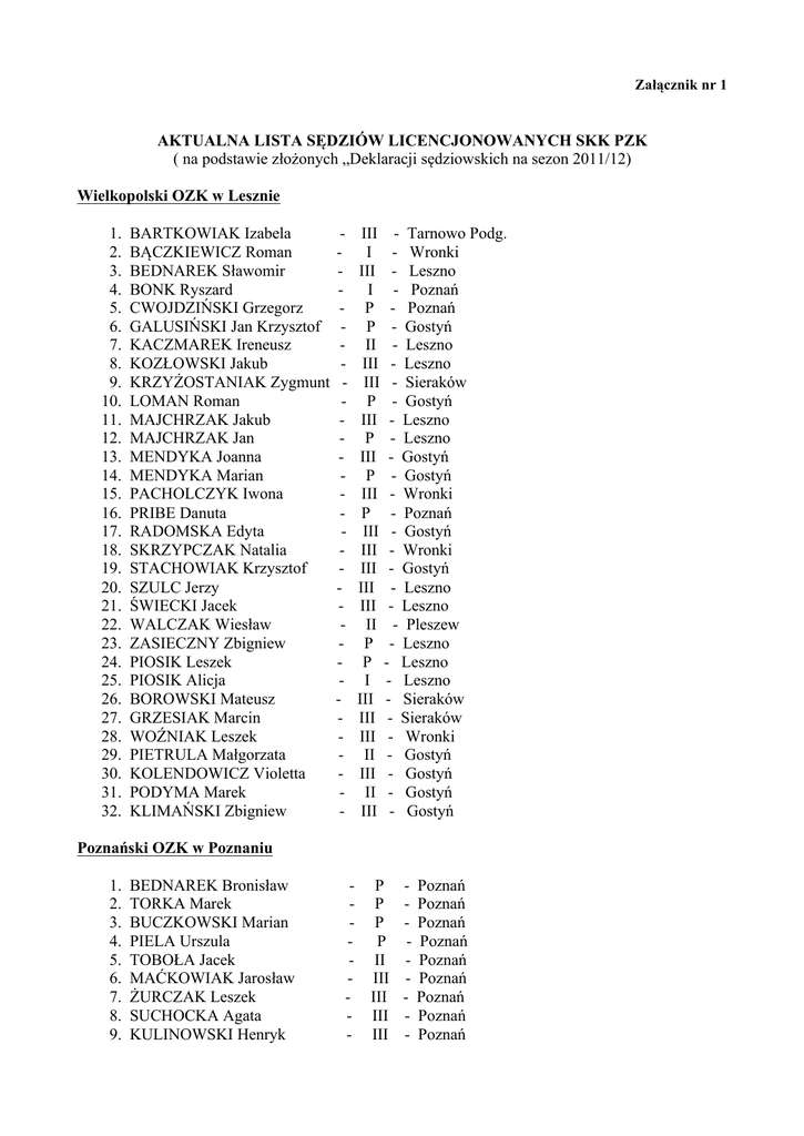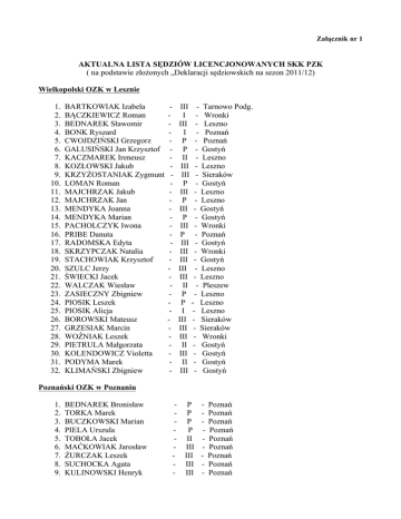 Załącznik nr 1 AKTUALNA LISTA SĘDZIÓW LICENCJONOWANYCH SKK PZK ( na podstawie złożonych „Deklaracji sędziowskich na sezon 2011/12) Wielkopolski OZK w Lesznie 1. 2. 3. 4. 5. 6. 7. 8. 9. 10. 11. 12. 13. 14. 15. 16. 17. 18. 19. 20. 21. 22. 23. 24. 25. 26. 27. 28. 29. 30. 31. 32. BARTKOWIAK Izabela BĄCZKIEWICZ Roman BEDNAREK Sławomir BONK Ryszard CWOJDZIŃSKI Grzegorz GALUSIŃSKI Jan Krzysztof KACZMAREK Ireneusz KOZŁOWSKI Jakub KRZYŻOSTANIAK Zygmunt LOMAN Roman MAJCHRZAK Jakub MAJCHRZAK Jan MENDYKA Joanna MENDYKA Marian PACHOLCZYK Iwona PRIBE Danuta RADOMSKA Edyta SKRZYPCZAK Natalia STACHOWIAK Krzysztof SZULC Jerzy ŚWIECKI Jacek WALCZAK Wiesław ZASIECZNY Zbigniew PIOSIK Leszek PIOSIK Alicja BOROWSKI Mateusz GRZESIAK Marcin WOŹNIAK Leszek PIETRULA Małgorzata KOLENDOWICZ Violetta PODYMA Marek KLIMAŃSKI Zbigniew - III - Tarnowo Podg. I - Wronki III - Leszno I - Poznań P - Poznań P - Gostyń II - Leszno III - Leszno III - Sieraków P - Gostyń III - Leszno P - Leszno III - Gostyń P - Gostyń III - Wronki P - Poznań III - Gostyń III - Wronki III - Gostyń III - Leszno III - Leszno II - Pleszew P - Leszno P - Leszno I - Leszno III - Sieraków III - Sieraków III - Wronki II - Gostyń III - Gostyń II - Gostyń III - Gostyń Poznański OZK w Poznaniu 1. 2. 3. 4. 5. 6. 7. 8. 9. BEDNAREK Bronisław TORKA Marek BUCZKOWSKI Marian PIELA Urszula TOBOŁA Jacek MAĆKOWIAK Jarosław ŻURCZAK Leszek SUCHOCKA Agata KULINOWSKI Henryk - P - P - P P - II - III - III - III - III - Poznań Poznań Poznań Poznań Poznań Poznań Poznań Poznań Poznań 10. RYCHLEWSKI Maciej 11. JASKULSKI Edward 12. JECHURA Krystyna - III - Poznań P - Poznań III - Śrem Sędziowie Parkietowi 1. 2. 3. 4. 5. JASKULSKI Edward STACHOWIAK Maria JECHURA Krystyna JANKOWSKI Czesław SZURMANT Tadeusz - FIQ - Poznań - II - Poznań - III - Śrem - III - Śrem - III - Śrem Centralny OZK w Tomaszowie Maz. 1. 2. 3. 4. 5. 6. 7. 8. 9. 10. 11. 12. 13. 14. BOROS Beata CIESIELSKI Paweł GRABOWSKI Jacek JÓŹWIK Izydor JÓŹWIK Stanisław POLAK Bożena RYDEL Stanisław SOBIERSKI Mieczysław ŚLIWIŃSKA Anna ŚLIWINSKI Tadeusz ŚNIOSZEK Jan WYPYCH Andrzej GADOMSKI Arkadiusz GADOMSKA Dorota - III P P P III III III I II II P P II II - Tomaszów Maz. Tomaszów Maz. Tomaszów Maz. Tomaszów Maz. Tomaszów Maz. Tomaszów Maz. Tomaszów Maz. Tomaszów Maz. Tomaszów Maz. Tomaszów Maz. Tomaszów Maz. Tomaszów Maz. Opoczno Opoczno Pomorski OZK w Gdańsku 1. 2. 3. 4. 5. 6. 7. 8. 9. 10. 11. HIRTH Beata - III BERNAT Eugeniusz P LAZARSKI Edward P LAZARSKI Przemysław - II LAZARSKI Tomasz I ORŁOWSKA Dorota - III KRUEGER Marzena P HENNIK - SKARUPA Paulina - II IWICKA Ewa II PSTRĄG – WILIGAŁA Alina II KOZAKIEWICZ Mariusz - FIQ - Puck - Puck - Gdańsk - Gdańsk - Gdańsk - Gdańsk - Tuchola - Tuchola - Tuchola - Tuchola - Wejherowo Kujawsko – Pomorski OZSK w Toruniu Małopolski OZK w Krakowie 1. KULKA Bogumił - II - Brzesko 2. 3. 4. 5. FILIPEK Andrzej SZYDŁOWSKI Maciej STOLIŃSKI Stanisław SERWIN Marek - II II II III - Brzesko Brzesko Brzesko Brzesko Śląski OZK w Katowicach 1. LISOWSKI Henryk 2. SZOSTOK Marcin 3. SYNOWIEC Czesław - P - Łaziska Górne - III - Łaziska Górne - I - Łaziska Górne W imieniu Kolegium Sędziów SKK PZK Przewodniczący Ryszard Bonk