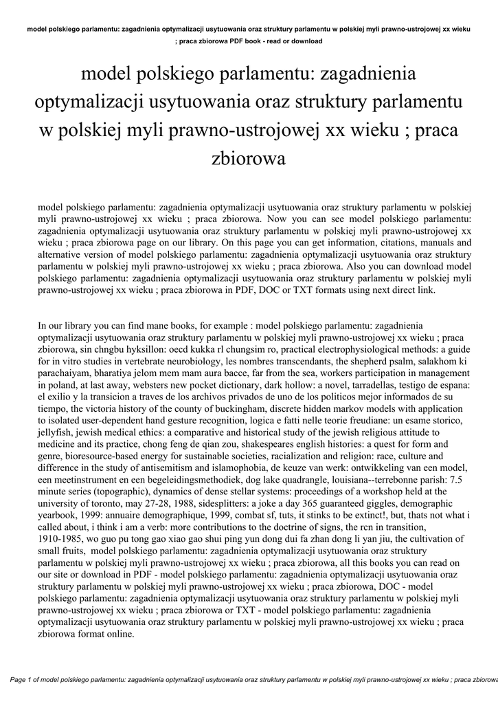 model polskiego parlamentu: zagadnienia optymalizacji usytuowania oraz struktury parlamentu w polskiej myli prawno-ustrojowej xx wieku ; praca zbiorowa PDF book - read or download model polskiego parlamentu: zagadnienia optymalizacji usytuowania oraz struktury parlamentu w polskiej myli prawno-ustrojowej xx wieku ; praca zbiorowa model polskiego parlamentu: zagadnienia optymalizacji usytuowania oraz struktury parlamentu w polskiej myli prawno-ustrojowej xx wieku ; praca zbiorowa. Now you can see model polskiego parlamentu: zagadnienia optymalizacji usytuowania oraz struktury parlamentu w polskiej myli prawno-ustrojowej xx wieku ; praca zbiorowa page on our library. On this page you can get information, citations, manuals and alternative version of model polskiego parlamentu: zagadnienia optymalizacji usytuowania oraz struktury parlamentu w polskiej myli prawno-ustrojowej xx wieku ; praca zbiorowa. Also you can download model polskiego parlamentu: zagadnienia optymalizacji usytuowania oraz struktury parlamentu w polskiej myli prawno-ustrojowej xx wieku ; praca zbiorowa in PDF, DOC or TXT formats using next direct link. In our library you can find mane books, for example : model polskiego parlamentu: zagadnienia optymalizacji usytuowania oraz struktury parlamentu w polskiej myli prawno-ustrojowej xx wieku ; praca zbiorowa, sin chngbu hyksillon: oecd kukka rl chungsim ro, practical electrophysiological methods: a guide for in vitro studies in vertebrate neurobiology, les nombres transcendants, the shepherd psalm, salakhom ki parachaiyam, bharatiya jelom mem mam aura bacce, far from the sea, workers participation in management in poland, at last away, websters new pocket dictionary, dark hollow: a novel, tarradellas, testigo de espana: el exilio y la transicion a traves de los archivos privados de uno de los politicos mejor informados de su tiempo, the victoria history of the county of buckingham, discrete hidden markov models with application to isolated user-dependent hand gesture recognition, logica e fatti nelle teorie freudiane: un esame storico, jellyfish, jewish medical ethics: a comparative and historical study of the jewish religious attitude to medicine and its practice, chong feng de qian zou, shakespeares english histories: a quest for form and genre, bioresource-based energy for sustainable societies, racialization and religion: race, culture and difference in the study of antisemitism and islamophobia, de keuze van werk: ontwikkeling van een model, een meetinstrument en een begeleidingsmethodiek, dog lake quadrangle, louisiana--terrebonne parish: 7.5 minute series (topographic), dynamics of dense stellar systems: proceedings of a workshop held at the university of toronto, may 27-28, 1988, sidesplitters: a joke a day 365 guaranteed giggles, demographic yearbook, 1999: annuaire demographique, 1999, combat sf, tuts, it stinks to be extinct!, but, thats not what i called about, i think i am a verb: more contributions to the doctrine of signs, the rcn in transition, 1910-1985, wo guo pu tong gao xiao gao shui ping yun dong dui fa zhan dong li yan jiu, the cultivation of small fruits, model polskiego parlamentu: zagadnienia optymalizacji usytuowania oraz struktury parlamentu w polskiej myli prawno-ustrojowej xx wieku ; praca zbiorowa, all this books you can read on our site or download in PDF - model polskiego parlamentu: zagadnienia optymalizacji usytuowania oraz struktury parlamentu w polskiej myli prawno-ustrojowej xx wieku ; praca zbiorowa, DOC - model polskiego parlamentu: zagadnienia optymalizacji usytuowania oraz struktury parlamentu w polskiej myli prawno-ustrojowej xx wieku ; praca zbiorowa or TXT - model polskiego parlamentu: zagadnienia optymalizacji usytuowania oraz struktury parlamentu w polskiej myli prawno-ustrojowej xx wieku ; praca zbiorowa format online. Page 1 of model polskiego parlamentu: zagadnienia optymalizacji usytuowania oraz struktury parlamentu w polskiej myli prawno-ustrojowej xx wieku ; praca zbiorowa model polskiego parlamentu: zagadnienia optymalizacji usytuowania oraz struktury parlamentu w polskiej myli prawno-ustrojowej xx wieku ; praca zbiorowa PDF book - read or download Our collection provide simple ways so that you can find a model polskiego parlamentu: zagadnienia optymalizacji usytuowania oraz struktury parlamentu w polskiej myli prawno-ustrojowej xx wieku ; praca zbiorowa PDF record digging. And by having our ebooks online or by saving it , you have convenient answers with model polskiego parlamentu: zagadnienia optymalizacji usytuowania oraz struktury parlamentu w polskiej myli prawno-ustrojowej xx wieku ; praca zbiorowa. To begin with finding model polskiego parlamentu: zagadnienia optymalizacji usytuowania oraz struktury parlamentu w polskiej myli prawno-ustrojowej xx wieku ; praca zbiorowa, you are to find our website that includes a comprehensive assortment of model polskiego parlamentu: zagadnienia optymalizacji usytuowania oraz struktury parlamentu w polskiej myli prawno-ustrojowej xx wieku ; praca zbiorowa manuals listed. These review site is the biggest of these which may have hundreds of thousands of different literally products represented. You'll also see that there are specific sites catered to different product types or categories, brands or niches related with model polskiego parlamentu: zagadnienia optymalizacji usytuowania oraz struktury parlamentu w polskiej myli prawno-ustrojowej xx wieku ; praca zbiorowa. So depending on just what you are searching, you'll be able to choose ebooks model polskiego parlamentu: zagadnienia optymalizacji usytuowania oraz struktury parlamentu w polskiej myli prawno-ustrojowej xx wieku ; praca zbiorowa to suit your own needs, model polskiego parlamentu: zagadnienia optymalizacji usytuowania oraz struktury parlamentu w polskiej myli prawno-ustrojowej xx wieku ; praca zbiorowa. Page 2 of model polskiego parlamentu: zagadnienia optymalizacji usytuowania oraz struktury parlamentu w polskiej myli pr