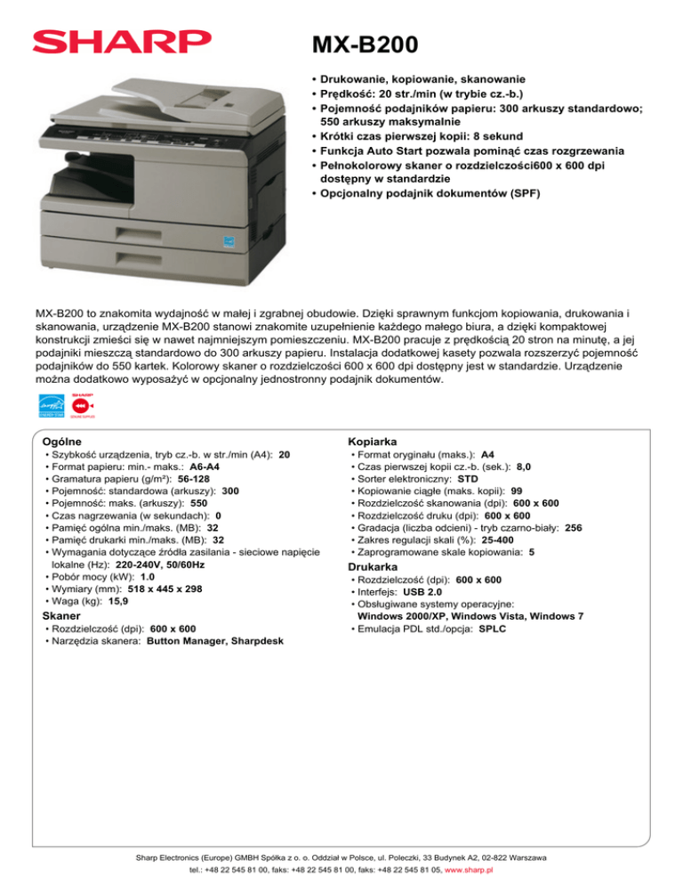 MX-B200 • Drukowanie, kopiowanie, skanowanie • Prędkość: 20 str./min (w trybie cz.-b.) • Pojemność podajników papieru: 300 arkuszy standardowo; 550 arkuszy maksymalnie • Krótki czas pierwszej kopii: 8 sekund • Funkcja Auto Start pozwala pominąć czas rozgrzewania • Pełnokolorowy skaner o rozdzielczości600 x 600 dpi dostępny w standardzie • Opcjonalny podajnik dokumentów (SPF) MX-B200 to znakomita wydajność w małej i zgrabnej obudowie. Dzięki sprawnym funkcjom kopiowania, drukowania i skanowania, urządzenie MX-B200 stanowi znakomite uzupełnienie każdego małego biura, a dzięki kompaktowej konstrukcji zmieści się w nawet najmniejszym pomieszczeniu. MX-B200 pracuje z prędkością 20 stron na minutę, a jej podajniki mieszczą standardowo do 300 arkuszy papieru. Instalacja dodatkowej kasety pozwala rozszerzyć pojemność podajników do 550 kartek. Kolorowy skaner o rozdzielczości 600 x 600 dpi dostępny jest w standardzie. Urządzenie można dodatkowo wyposażyć w opcjonalny jednostronny podajnik dokumentów. Ogólne Kopiarka • Szybkość urządzenia, tryb cz.-b. w str./min (A4): 20 • Format papieru: min.- maks.: A6-A4 • Gramatura papieru (g/m²): 56-128 • Pojemność: standardowa (arkuszy): 300 • Pojemność: maks. (arkuszy): 550 • Czas nagrzewania (w sekundach): 0 • Pamięć ogólna min./maks. (MB): 32 • Pamięć drukarki min./maks. (MB): 32 • Wymagania dotyczące źródła zasilania - sieciowe napięcie lokalne (Hz): 220-240V, 50/60Hz • Pobór mocy (kW): 1.0 • Wymiary (mm): 518 x 445 x 298 • Waga (kg): 15,9 Skaner • Rozdzielczość (dpi): 600 x 600 • Narzędzia skanera: Button Manager, Sharpdesk • Format oryginału (maks.): A4 • Czas pierwszej kopii cz.-b. (sek.): 8,0 • Sorter elektroniczny: STD • Kopiowanie ciągłe (maks. kopii): 99 • Rozdzielczość skanowania (dpi): 600 x 600 • Rozdzielczość druku (dpi): 600 x 600 • Gradacja (liczba odcieni) - tryb czarno-biały: 256 • Zakres regulacji skali (%): 25-400 • Zaprogramowane skale kopiowania: 5 Drukarka • Rozdzielczość (dpi): 600 x 600 • Interfejs: USB 2.0 • Obsługiwane systemy operacyjne: Windows 2000/XP, Windows Vista, Windows 7 • Emulacja PDL std./opcja: SPLC Sharp Electronics (Europe) GMBH Spółka z o. o. Oddział w Polsce, ul. Poleczki, 33 Budynek A2, 02-822 Warszawa tel.: +48 22 545 81 00, faks: +48 22 545 81 00, faks: +48 22 545 81 05, www.sharp.pl