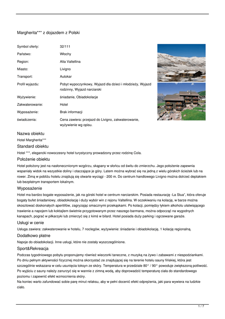Margherita*** z dojazdem z Polski Symbol oferty: 32/111 Państwo: Włochy Region: Alta Valtellina Miasto: Livigno Transport: Autokar Profil wyjazdu: Pobyt wypoczynkowy, Wyjazd dla dzieci i młodzieży, Wyjazd Wyżywienie: śniadanie, Obiadokolacje Zakwaterowanie: Hotel Wyposażenie: Brak informacji świadczenia: Cena zawiera: przejazd do Livigno, zakwaterowanie, rodzinny, Wyjazd narciarski wyżywienie wg opisu. Nazwa obiektu Hotel Margherita*** Standard obiektu Hotel ***, elegancki nowoczesny hotel turystyczny prowadzony przez rodzinę Cola. Położenie obiektu Hotel położony jest na nasłonecznionym wzgórzu, skąpany w słońcu od świtu do zmierzchu. Jego położenie zapewnia wspaniały widok na wszystkie doliny i otaczające je góry. Latem można wybrać się na jedną z wielu górskich ścieżek lub na rower. Zimą w pobliżu hotelu znajdują się otwarte wyciągi - 200 m. Do centrum handlowego Livigno można dotrzeć deptakiem lub bezpłatnym transportem lokalnym. Wyposażenie Hotel ma bardzo bogate wyposażenie, jak na górski hotel w centrum narciarskim. Posiada restaurację -La Stua”, która oferuje bogaty bufet śniadaniowy, obiadokolację i duży wybór win z rejonu Valtellina. W oczekiwaniu na kolację, w barze można skosztować doskonałych aperitifów, zagryzając smacznymi przekąskami. Po kolacji, pomiędzy łykiem alkoholu ułatwiającego trawienie a napojem lub koktajlem świetnie przygotowanym przez naszego barmana, można odpocząć na wygodnych kanapach, pograć w piłkarzyki lub zmierzyć się z kimś w bilard. Hotel posiada duży parking i ogrzewane garaże. Usługi w cenie Usługa zawiera: zakwaterowanie w hotelu, 7 noclegów, wyżywienie: śniadanie i obiadokolację, 1 kolację regionalną. Dodatkowo płatne Napoje do obiadokolacji. Inne usługi, które nie zostały wyszczególnione. Sport&Rekreacja Podczas tygodniowego pobytu proponujemy również wieczorki taneczne, z muzyką na żywo i zabawami z niespodziankami. Po dniu pełnym aktywności fizycznej można skorzystać ze znajdującej się na terenie hotelu sauny fińskiej, która jest szczególnie wskazana w celu usunięcia toksyn ze skóry. Temperatura w przedziale 80° / 90° powoduje zwiększoną potliwość. Po wyjściu z sauny należy zanurzyć się w wannie z zimną wodą, aby doprowadzić temperaturę ciała do standardowego poziomu i zapewnić efekt wzmocnienia skóry. Na koniec warto zafundować sobie parę minut relaksu, aby w pełni docenić efekt odprężenia, jaki para wywiera na ludzkie ciało. 1/7 Może warto, w celu zachowania dobrej kondycji lub po prostu aby podziwiać wspaniały pejzaż Livigno, wybrać się na wycieczkę rowerową? Rowery wypożyczamy gratis! Dla turystów przyjeżdżających z własnym rowerem górskim, mamy bezpieczną przechowalnię oraz dysponujemy miejscem, gdzie można dokonać konserwacji lub naprawy roweru. Wyżywienie Hotel posiada bardzo dobrą kuchnię. Wyżywienie: śniadanie - bardzo bogaty bufet, obiadokolacja - menu do wyboru z 3 różnych dań, z dodatkami i bogatymi w witaminy sałatkami. Po dniu pełnym wrażeń, miło nam będzie Państwa gościć w restauracji -La Stua”. Duży wybór przystawek i oferta 4-częściowego menu to gwarancja dogodzenia każdemu podniebieniu! Wyboru można dokonać spośród dań kuchni lokalnej (valtellinese), dietetycznych i wegetariańskich. Na smakoszy czekają świeże ryby. Ponadto można zamówić menu zawierające potrawy bezglutenowe. Nasze potrawy są komponowane przy użyciu najlepszych składników, z naciskiem położonym na świeżość, prostotę i oryginalność. W połowie tygodnia proponujemy typową kolację. Wieczorem serwujemy wówczas menu z potrawami lokalnymi. Dopełnieniem dobrej atmosfery są stroje regionalne noszone przez obsługę kelnerską. Można ponadto zamówić dania z naszego menu a la carte, wybierając spośród smakowitych specjalności, wyśmienitych pizz i lokalnej potrawy -fonduta di carne”. Doskonałym dodatkiem do potraw są wina z rejonu Valtellina oraz innych regionów Włoch. Wyposażenie i opis pokoju Hotel posiada pokoje 2-osobowe wyposażone w komfortowe łóżka oddzielne i małżeńskie, z możliwością dostawienia dodatkowego 3 i 4 łóżka, dobrze wyposażoną i nowoczesną łazienkę z wanną i prysznicem, WC, TV-SAT, telefon, radio, mały aneks kuchenny i lodówkę. Wygodny sen gwarantują stelaże ortopedyczne i nowe materace z lateksu. Dzięki kolorowym pościelom pokój jest przytulny i miły. Regularna wymiana pościeli zapewnia komfort i higienę. Pokoje są: standardowe -2 osobowe, o wyższym standardzie - 2 osobowe z łóżkiem małżeńskim i miejscem dla dzieci - o powierzchni 12-16 m2, łączone 2 pokoje 2-osobowe. Notatka Doskonały hotel dla narciarzy, polecany dla małych grup i rodzin. Położony bezpośrednio przy wyciągach. Wymagana wcześniejsza rezerwacja, ponieważ hotel ten ma bardzo duże obłożenie. Plusy Położenie na nasłonecznionym wzgórzu wschodnim Livigno. Bardzo dobra kuchnia. Wysoki standard. 200 m do najbliższych wyciągów: Livigno. W pobliżu hotelu w centrum Livigno: basen, lodowisko, sklepy, bary, restauracje. Minusy Hotel nie posiada basenu. Karta win Vini Bianchi di Valtellina Bianco la Contea IGT "Triacca" 2006 Chardonnay Barrique IGT "Plozza" 2005 Ca’ Brione IGT "Nino Negri" 2006 Rezio “Nera” 2002 Torre della Sirena IGT "Conti Sertoli Salis" 2006 Bianchi d’Italia Bianco Imperiale “Berlucchi” 2/7 Terre di Franciacorta Curtefranca Le Arzelle “Berlucchi” 2005 Pinot Nero DOC Terre d’Alteni “La Versa” 2005 Solatia IGT “Ruffino” 2001 Müller Thurgau delle Venezie IGT "Lamberti" 2005 Müller Thurgau delle Venezie IGT "Conti d’Arco" 2005 Pinot Grigio Collio DOC "Borgo Conventi" 2004 Tocai Friulano Collio DOC "Borgo Conventi" 2004 Sauvignon Collio DOC "Cormons" 2004 Müller Thurgau DOC "I Masoletti" 2004 Pinot Grigio delle Venezie DOC " I Masoletti" 2004 Vini Rossi della Valtellina Corte della Meri