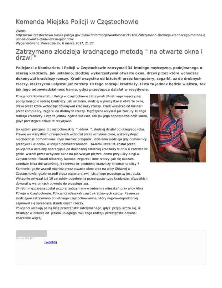 Komenda Miejska Policji w Częstochowie Źródło: http://www.czestochowa.slaska.policja.gov.pl/ka7/informacje/wiadomosci/19160,Zatrzymano-zlodzieja-kradnacego-metoda-q uot-na-otwarte-okna-i-drzwi-quot.html Wygenerowano: Poniedziałek, 6 marca 2017, 21:27 Zatrzymano złodzieja kradnącego metodą " na otwarte okna i drzwi " Policjanci z Komisariatu I Policji w Częstochowie zatrzymali 34-letniego mężczyznę, podejrzanego o szereg kradzieży. Jak ustalono, złodziej wykorzystywał otwarte okna, drzwi przez które wchodząc dokonywał kradzieży rzeczy. Kradł wszystko od biżuterii przez komputery, zegarki, aż do drobnych rzeczy. Mężczyzna usłyszał już zarzuty 10 tego rodzaju kradzieży. Lista ta jednak będzie większa, tak jak jego odpowiedzialność karna, gdyż przestępca działał w recydywie. Policjanci z Komisariatu I Policji w Częstochowie zatrzymali 34-letniego mężczyznę, podejrzanego o szereg kradzieży. Jak ustalono, złodziej wykorzystywał otwarte okna, drzwi przez które wchodząc dokonywał kradzieży rzeczy. Kradł wszystko od biżuterii przez komputery, zegarki do drobnych rzeczy. Mężczyzna usłyszał już zarzuty 10 tego rodzaju kradzieży. Lista ta jednak będzie większa, tak jak jego odpowiedzialność karna, gdyż przestępca działał w recydywie. Jak ustalili policjanci z częstochowskiej " jedynki ", złodziej działał od ubiegłego roku. Prawie we wszystkich przypadkach wchodził przez uchylone okno, wykorzystując nieobecność domowników. Były również przypadku działania złodzieja gdy domownicy przebywali w domu, w innych pomieszczeniach. 34-letni Paweł M. został przez policjantów ustalony operacyjnie po dokonanej ostatniej kradzieży w dniu 6 czerwca br. gdzie wszedł przez uchylone okno na pierwszym piętrze, domu przy ulicy Kingi w Częstochowie. Skradł biżuterię, laptopa, zegarek i inne rzeczy. Jak się okazało, zaledwie kilka dni wcześniej, 3 czerwca br. podobnej kradzieży dokonał na ulicy 7 Kamienic, gdzie wszedł również przez otwarte okno oraz na ulicy Głównej w Częstochowie, gdzie wszedł przez otwarte drzwi. Lista jego przestępstw jest duża. Wstępnie usłyszał już 10 zarzutów popełnienia przestępstw typu kradzieże. Wszystkich dokonał w warunkach powrotu do przestępstwa. 34-letni mężczyzna został wczoraj zatrzymany w jednym z mieszkań przy ulicy Aleja Pokoju w Częstochowie. Policjanci odzyskali część skradzionych rzeczy. Razem ze złodziejem zatrzymano 30-letniego częstochowianina, który najprawdopodobniej zajmował się sprzedażą skradzionych rzeczy. Policjanci ustalają pełną listę przestępstw zatrzymanego, gdyż przypuszcza się, iż działając w okresie od jesieni ubiegłego roku tego rodzaju przestępstw dokonał znaczenie więcej. Ocena: 0/5 (0) Tweetnij