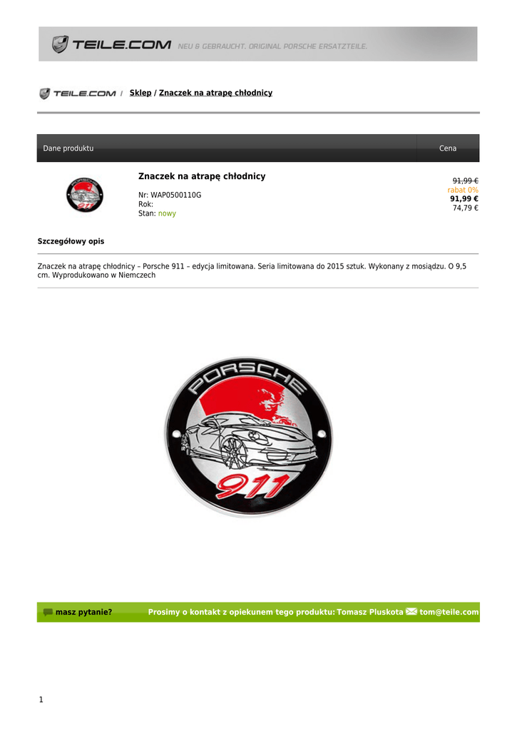 Sklep / Znaczek na atrapę chłodnicy Dane produktu Cena Znaczek na atrapę chłodnicy Nr: WAP0500110G Rok: Stan: nowy 91,99 € rabat 0% 91,99 € 74,79 € Szczegółowy opis Znaczek na atrapę chłodnicy – Porsche 911 – edycja limitowana. Seria limitowana do 2015 sztuk. Wykonany z mosiądzu. O 9,5 cm. Wyprodukowano w Niemczech masz pytanie? 1 Prosimy o kontakt z opiekunem tego produktu: Tomasz Pluskota [email protected]