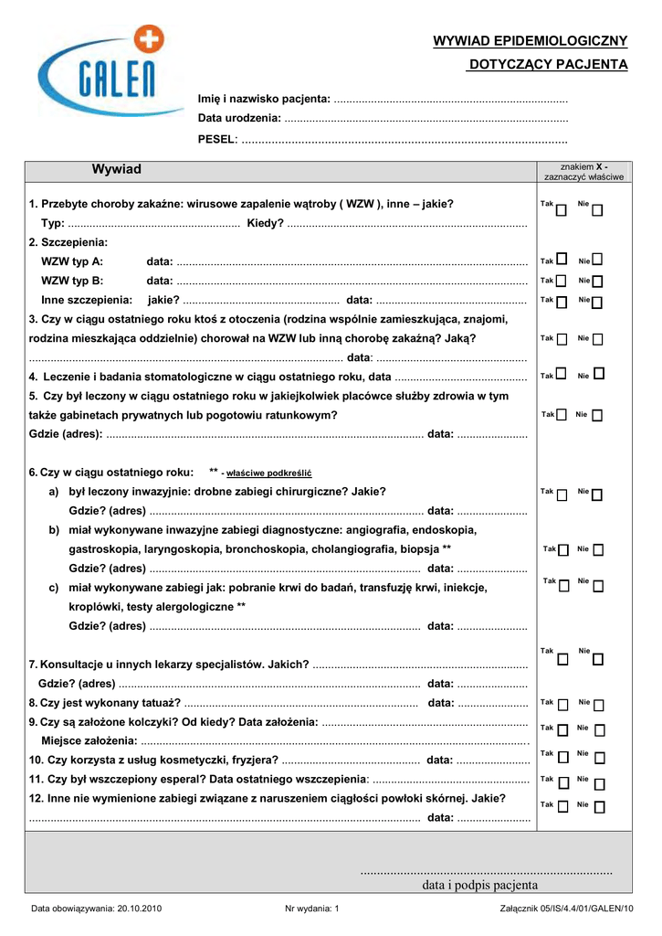 WYWIAD EPIDEMIOLOGICZNY DOTYCZĄCY PACJENTA Imię i nazwisko pacjenta: ............................................................................ Data urodzenia: ............................................................................................ PESEL: .................................................................................................. Wywiad znakiem X zaznaczyć właściwe 1. Przebyte choroby zakaźne: wirusowe zapalenie wątroby ( WZW ), inne – jakie? Tak Nie Typ: ........................................................ Kiedy? .............................................................................. 2. Szczepienia: WZW typ A: data: .................................................................................................................. Tak Nie WZW typ B: data: .................................................................................................................. Tak Nie Inne szczepienia: jakie? ................................................... data: ................................................. Tak Nie Tak Nie Tak Nie Tak Nie Tak Nie 3. Czy w ciągu ostatniego roku ktoś z otoczenia (rodzina wspólnie zamieszkująca, znajomi, rodzina mieszkająca oddzielnie) chorował na WZW lub inną chorobę zakaźną? Jaką? ...................................................................................................... data: ................................................. 4. Leczenie i badania stomatologiczne w ciągu ostatniego roku, data ........................................... 5. Czy był leczony w ciągu ostatniego roku w jakiejkolwiek placówce służby zdrowia w tym także gabinetach prywatnych lub pogotowiu ratunkowym? Gdzie (adres): ....................................................................................................... data: ....................... 6. Czy w ciągu ostatniego roku: ** - właściwe podkreślić a) był leczony inwazyjnie: drobne zabiegi chirurgiczne? Jakie? Gdzie? (adres) ......................................................................................... data: ....................... b) miał wykonywane inwazyjne zabiegi diagnostyczne: angiografia, endoskopia, gastroskopia, laryngoskopia, bronchoskopia, cholangiografia, biopsja ** Gdzie? (adres) ........................................................................................ data: ....................... c) miał wykonywane zabiegi jak: pobranie krwi do badań, transfuzję krwi, iniekcje, Tak Nie Tak Nie kroplówki, testy alergologiczne ** Gdzie? (adres) ........................................................................................ data: ....................... Tak Nie 8. Czy jest wykonany tatuaż? ............................................................................ data: ....................... Tak Nie 9. Czy są założone kolczyki? Od kiedy? Data założenia: ................................................................... Tak Nie Tak Nie 11. Czy był wszczepiony esperal? Data ostatniego wszczepienia: ................................................... Tak Nie 12. Inne nie wymienione zabiegi związane z naruszeniem ciągłości powłoki skórnej. Jakie? Tak Nie 7. Konsultacje u innych lekarzy specjalistów. Jakich? ...................................................................... Gdzie? (adres) .................................................................................................. data: ....................... Miejsce założenia: .............................................................................................................................. 10. Czy korzysta z usług kosmetyczki, fryzjera? ............................................. data: ........................ ............................................................................................................................... data: ........................ ............................................................................ data i podpis pacjenta Data obowiązywania: 20.10.2010 Nr wydania: 1 Załącznik 05/IS/4.4/01/GALEN/10
