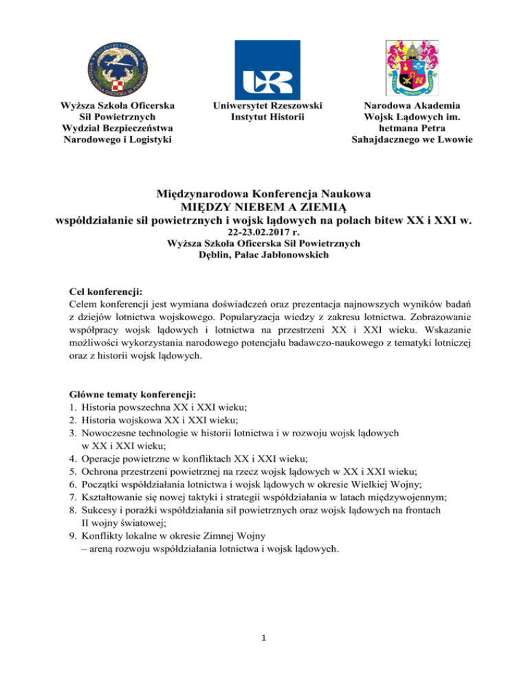 Wyższa Szkoła Oficerska Sił Powietrznych Wydział Bezpieczeństwa Narodowego i Logistyki Uniwersytet Rzeszowski Instytut Historii Narodowa Akademia Wojsk Lądowych im. hetmana Petra Sahajdacznego we Lwowie Międzynarodowa Konferencja Naukowa MIĘDZY NIEBEM A ZIEMIĄ współdziałanie sił powietrznych i wojsk lądowych na polach bitew XX i XXI w. 22-23.02.2017 r. Wyższa Szkoła Oficerska Sił Powietrznych Dęblin, Pałac Jabłonowskich Cel konferencji: Celem konferencji jest wymiana doświadczeń oraz prezentacja najnowszych wyników badań z dziejów lotnictwa wojskowego. Popularyzacja wiedzy z zakresu lotnictwa. Zobrazowanie współpracy wojsk lądowych i lotnictwa na przestrzeni XX i XXI wieku. Wskazanie możliwości wykorzystania narodowego potencjału badawczo-naukowego z tematyki lotniczej oraz z historii wojsk lądowych. Główne tematy konferencji: 1. Historia powszechna XX i XXI wieku; 2. Historia wojskowa XX i XXI wieku; 3. Nowoczesne technologie w historii lotnictwa i w rozwoju wojsk lądowych w XX i XXI wieku; 4. Operacje powietrzne w konfliktach XX i XXI wieku; 5. Ochrona przestrzeni powietrznej na rzecz wojsk lądowych w XX i XXI wieku; 6. Początki współdziałania lotnictwa i wojsk lądowych w okresie Wielkiej Wojny; 7. Kształtowanie się nowej taktyki i strategii współdziałania w latach międzywojennym; 8. Sukcesy i porażki współdziałania sił powietrznych oraz wojsk lądowych na frontach II wojny światowej; 9. Konflikty lokalne w okresie Zimnej Wojny – areną rozwoju współdziałania lotnictwa i wojsk lądowych. 1 KOMITET NAUKOWY Przewodniczący Rektor – Komendant Wyższej Szkoły Oficerskiej Sił Powietrznych w Dęblinie gen. bryg. pil. dr Piotr KRAWCZYK Zastępcy przewodniczącego: Komendant Narodowej Akademii Wojsk Lądowych we Lwowie gen. lejtnant Pavlo TKACZUK Prorektor WSOSP ds. naukowych dr hab. inż. Jarosław KOZUBA, prof. nadzw. Dziekan Wydziału Bezpieczeństwa Narodowego i Logistyki WSOSP płk rez. dr hab. Adam RADOMYSKI, prof. WSOSP Członkowie: Z-ca komendanta Narodowej Akademii Wojsk Lądowych we Lwowie, ds naukowych płk. dr. hab., prof. Andrij SLUSARENKO Wydział Nauk Humanistycznych Narodowej Akademii Wojsk Lądowych we Lwowie dr. hab. prof. Vitalij VYZD Instytut Historii Uniwersytetu Rzeszowskiego prof. nadzw. dr hab. Andrzej BONUSIAK Instytut Pedagogiki Uniwersytetu Przyrodniczo-Humanistycznego w Siedlcach prof. dr hab. Lech WYSZCZELSKI VHU Praha dr Jiri Rajlich KOMITET ORGANIZACYJNY prof. nadzw. dr hab. Andrzej OLEJKO – przewodniczący dr Marcin PALUCH – wiceprzewodniczący ppłk mgr Dariusz GÓRCZYŃSKI – wiceprzewodniczący płk dr inż. Krzysztof OGONOWSKI dr Krzysztof KUBALA dr Paweł KORZENIOWSKI mgr Damian KNUTEL Materiały konferencyjne Referaty będą recenzowane i kwalifikowane do druku w: - monografii wieloautorskiej (po pozytywnej recenzji) Jednocześnie organizatorzy zastrzegają sobie prawo do odrzucenia artykułów, komunikatów, które zostaną opracowane niezgodnie z wytycznymi określonymi w wymogach edycyjnych. Warunki wygłaszania referatów Obrady prowadzone będą w formie sesji plenarnych (referatów, dyskusji oraz komunikatów). W zależności od liczby uczestników obrady mogą być prowadzone w równoległych panelach. Czas wystąpień będzie limitowany: referat plenarny do 20 minut, referat panelowy do 10 minut, komunikat do 5 minut. 2 Terminarz 31.01.2017 r. zgłoszenie udziału w konferencji wraz z podaniem tematu i streszczenia referatu (karta zgłoszenia) 06.02.2017 r. informacja o wstępnej kwalifikacji referatów 08.02.2017 r. wniesienie opłaty konferencyjnej 13.02.2017 r. publikacja komunikatu nr 2 15.02.2017 r. przesłanie pełnego tekstu referatu (.doc oraz .pdf) 17.02.2017 r. przesłanie przez organizatora programu konferencji Koszt udziału w konferencji Konferencja jest przedsięwzięciem niekomercyjnym, opłaty konferencyjne przeznaczone będą wyłącznie na pokrycie kosztów organizacyjnych, w tym na wydanie monografii. Obsługa finansowa konferencji realizowana będzie przez Kwesturę WSOSP, konto konferencji podane zostanie bezpośrednio instytucjom deklarującym czynny udział w tym przedsięwzięciu naukowym. Zgłoszeniem uczestnictwa w konferencji jest przesłanie karty zgłoszenia oraz dokonanie opłaty konferencyjnej w wysokości: - 550 zł - 2 noclegi -21/22, 22/23; - 500 zł -1 nocleg – 22/23; - 400 zł - bez noclegu; - 200 zł - publikacja artykułu w monografii WSOSP bez uczestnictwa. Koszt konferencji obejmuje: materiały konferencyjne; wyżywienie (śniadanie, obiad, kolacja, przerwy kawowe, uroczysta kolacja); noclegi; dostarczenie do autora publikacji z konferencji; certyfikat uczestnictwa. Wpłaty dokonywać na konto: 12 1020 3147 0000 8402 0085 9934 Wyższa Szkoła Oficerska Sił Powietrznych w Dęblinie 08-521 Dęblin, ul. Dywizjonu 303 nr 35 W tytule przelewu należy podać: Konferencja naukowa – Między niebem a ziemią, NAZWISKO Imię, Instytucja SEKRETARIAT KONFERENCJI Wyższa Szkoła Oficerska Sił Powietrznych Wydział Bezpieczeństwa Narodowego i Logistyki ul. Dywizjonu 303 Nr 35, 08-521 Dęblin www.wsosp.pl e-mail [email protected] tel. +48 503 051 574 fax +48 26 151 82 72 3 Ramowy przebieg konferencji 21.02.2017 r. 17:00 - 19:30 - rejestracja uczestników 18:00 - 20:00 - kolacja Restauracja „Piekiełko” 22.02.2017 r. 07:30 - 08:30 śniadanie 08:00 - 09:00 rejestracja uczestników Budynek Rektoratu (Pałac Jabłonowskich) 09:00 - 09:20 rozpoczęcie konferencji Wystąpienie JM Rektora – Komendanta WSOSP gen. bryg. pil. dr. Piotra KRAWCZYKA oraz gości honorowych 09:20 - 12:00 sesja plenarna 12:00 - 12:30 przerwa kawowa 12:30 - 14:30 sesja plenarna 14:30 - 15:20 obiad 15:30 - 18:00 zwiedzanie obiektów WSOSP, Muzeum Sił Powietrznych (do wyboru) 18:20 - uroczysta kolacja 23.02.2017 r. 08:00 – 09:00 śniadanie 09:00 - 11:20 sesja plenarna 11:20 - 12:00 przerwa kawowa 12:00 - 13:20 sesja plenarna 13:20 - 13:40 podsumowanie konferencji JM Rektor - Ko