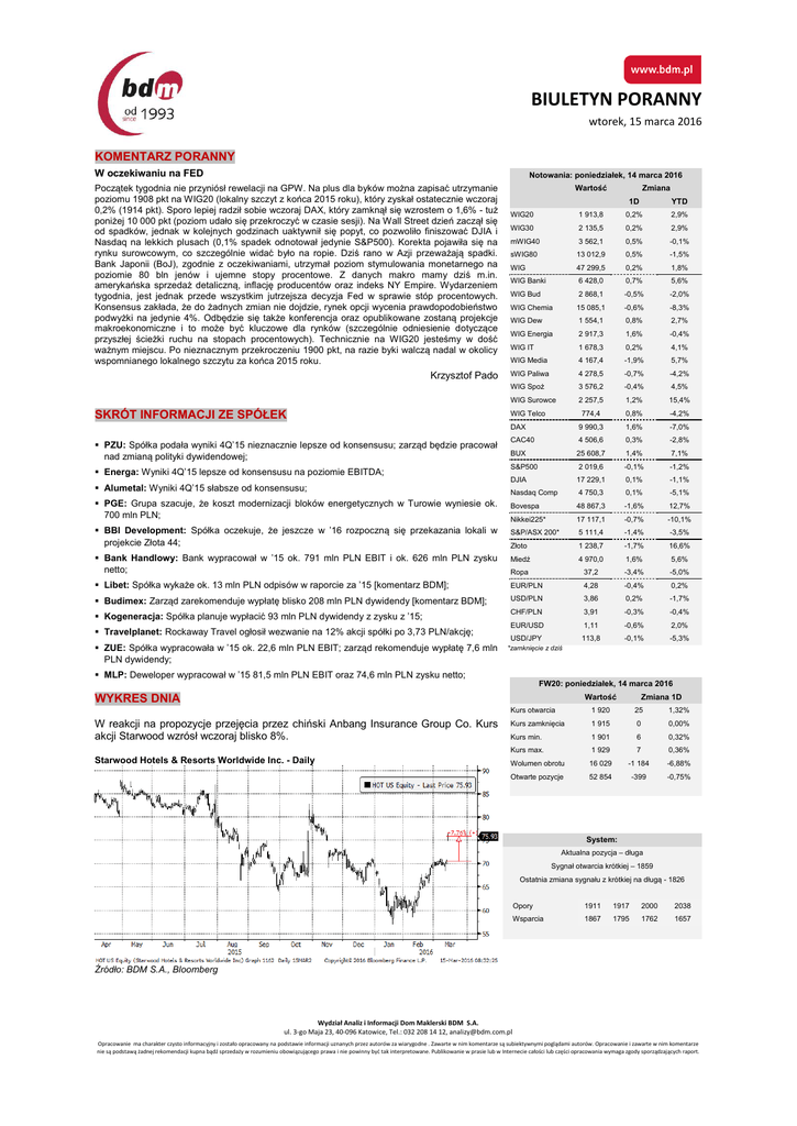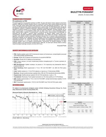 BIULETYN PORANNY wtorek, 15 marca 2016 KOMENTARZ PORANNY W oczekiwaniu na FED Notowania: poniedziałek, 14 marca 2016 Początek tygodnia nie przyniósł rewelacji na GPW. Na plus dla byków można zapisać utrzymanie poziomu 1908 pkt na WIG20 (lokalny szczyt z końca 2015 roku), który zyskał ostatecznie wczoraj 0,2% (1914 pkt). Sporo lepiej radził sobie wczoraj DAX, który zamknął się wzrostem o 1,6% - tuż poniżej 10 000 pkt (poziom udało się przekroczyć w czasie sesji). Na Wall Street dzień zaczął się od spadków, jednak w kolejnych godzinach uaktywnił się popyt, co pozwoliło finiszować DJIA i Nasdaq na lekkich plusach (0,1% spadek odnotował jedynie S&P500). Korekta pojawiła się na rynku surowcowym, co szczególnie widać było na ropie. Dziś rano w Azji przeważają spadki. Bank Japonii (BoJ), zgodnie z oczekiwaniami, utrzymał poziom stymulowania monetarnego na poziomie 80 bln jenów i ujemne stopy procentowe. Z danych makro mamy dziś m.in. amerykańska sprzedaż detaliczną, inflację producentów oraz indeks NY Empire. Wydarzeniem tygodnia, jest jednak przede wszystkim jutrzejsza decyzja Fed w sprawie stóp procentowych. Konsensus zakłada, że do żadnych zmian nie dojdzie, rynek opcji wycenia prawdopodobieństwo podwyżki na jedynie 4%. Odbędzie się także konferencja oraz opublikowane zostaną projekcje makroekonomiczne i to może być kluczowe dla rynków (szczególnie odniesienie dotyczące przyszłej ścieżki ruchu na stopach procentowych). Technicznie na WIG20 jesteśmy w dość ważnym miejscu. Po nieznacznym przekroczeniu 1900 pkt, na razie byki walczą nadal w okolicy wspomnianego lokalnego szczytu za końca 2015 roku. Krzysztof Pado SKRÓT INFORMACJI ZE SPÓŁEK Wartość Zmiana 1D YTD 2,9% WIG20 1 913,8 0,2% WIG30 2 135,5 0,2% 2,9% mWIG40 3 562,1 0,5% -0,1% sWIG80 13 012,9 0,5% -1,5% WIG 47 299,5 0,2% 1,8% WIG Banki 6 428,0 0,7% 5,6% WIG Bud 2 868,1 -0,5% -2,0% WIG Chemia 15 085,1 -0,6% -8,3% WIG Dew 1 554,1 0,8% 2,7% WIG Energia 2 917,3 1,6% -0,4% WIG IT 1 678,3 0,2% 4,1% WIG Media 4 167,4 -1,9% 5,7% WIG Paliwa 4 278,5 -0,7% -4,2% WIG Spoż 3 576,2 -0,4% 4,5% WIG Surowce 2 257,5 1,2% 15,4% 774,4 0,8% -4,2% DAX 9 990,3 1,6% -7,0% PZU: Spółka podała wyniki 4Q’15 nieznacznie lepsze od konsensusu; zarząd będzie pracował nad zmianą polityki dywidendowej; CAC40 4 506,6 0,3% -2,8% BUX 25 608,7 1,4% 7,1% Energa: Wyniki 4Q’15 lepsze od konsensusu na poziomie EBITDA; S&P500 2 019,6 -0,1% -1,2% DJIA 17 229,1 0,1% -1,1% Nasdaq Comp 4 750,3 0,1% -5,1% PGE: Grupa szacuje, że koszt modernizacji bloków energetycznych w Turowie wyniesie ok. 700 mln PLN; Bovespa 48 867,3 -1,6% 12,7% Nikkei225* 17 117,1 -0,7% -10,1% BBI Development: Spółka oczekuje, że jeszcze w ’16 rozpoczną się przekazania lokali w projekcie Złota 44; S&P/ASX 200* 5 111,4 -1,4% -3,5% Złoto 1 238,7 -1,7% 16,6% Bank Handlowy: Bank wypracował w ’15 ok. 791 mln PLN EBIT i ok. 626 mln PLN zysku netto; Miedź 4 970,0 1,6% 5,6% Ropa 37,2 -3,4% -5,0% Libet: Spółka wykaże ok. 13 mln PLN odpisów w raporcie za ’15 [komentarz BDM]; EUR/PLN 4,28 -0,4% 0,2% Budimex: Zarząd zarekomenduje wypłatę blisko 208 mln PLN dywidendy [komentarz BDM]; USD/PLN 3,86 0,2% -1,7% Kogeneracja: Spółka planuje wypłacić 93 mln PLN dywidendy z zysku z ’15; CHF/PLN 3,91 -0,3% -0,4% EUR/USD 1,11 -0,6% 2,0% USD/JPY 113,8 -0,1% -5,3% Alumetal: Wyniki 4Q’15 słabsze od konsensusu; Travelplanet: Rockaway Travel ogłosił wezwanie na 12% akcji spółki po 3,73 PLN/akcję; ZUE: Spółka wypracowała w ’15 ok. 22,6 mln PLN EBIT; zarząd rekomenduje wypłatę 7,6 mln PLN dywidendy; WIG Telco *zamknięcie z dziś MLP: Deweloper wypracował w ’15 81,5 mln PLN EBIT oraz 74,6 mln PLN zysku netto; FW20: poniedziałek, 14 marca 2016 Wartość WYKRES DNIA W reakcji na propozycje przejęcia przez chiński Anbang Insurance Group Co. Kurs akcji Starwood wzrósł wczoraj blisko 8%. Starwood Hotels & Resorts Worldwide Inc. - Daily Zmiana 1D Kurs otwarcia 1 920 25 1,32% Kurs zamknięcia 1 915 0 0,00% Kurs min. 1 901 6 0,32% Kurs max. 1 929 7 0,36% Wolumen obrotu 16 029 -1 184 -6,88% Otwarte pozycje 52 854 -399 -0,75% System: Aktualna pozycja – długa Sygnał otwarcia krótkiej – 1859 Ostatnia zmiana sygnału z krótkiej na długą - 1826 Opory 1911 1917 2000 2038 Wsparcia 1867 1795 1762 1657 Źródło: BDM S.A., Bloomberg Wydział Analiz i Informacji Dom Maklerski BDM S.A. ul. 3-go Maja 23, 40-096 Katowice, Tel.: 032 208 14 12, [email protected] Opracowanie ma charakter czysto informacyjny i zostało opracowany na podstawie informacji uznanych przez autorów za wiarygodne . Zawarte w nim komentarze są subiektywnymi poglądami autorów. Opracowanie i zawarte w nim komentarze nie są podstawą żadnej rekomendacji kupna bądź sprzedaży w rozumieniu obowiązującego prawa i nie powinny być tak interpretowane. Publikowanie w prasie lub w Internecie całości lub części opracowania wymaga zgody sporządzających raport. BIULETYN PORANNY wtorek, 15 marca 2016 GPW PODSUMOWANIE FW20 (1,920.00, 1,929.00, 1,901.00, 1,915.00, +0.00) Indeksy GPW 2200 2150 2100 2050 2000 1950 1900 1850 1800 1750 1700 1650 31 7 14 September 21 28 5 12 October 19 26 2 9 16 November 23 30 7 14 December 21 4 11 2016 18 25 1 8 15 February 22 29 7 March 14 21 28 WIG20 (1,917.09, 1,928.37, 1,902.88, 1,913.83, +2.95996) 2200 2150 2100 Open Low High Close WIG20 1 917,1 1 902,9 1 928,4 1 913,8 0,2% 540 WIG30 2 143,3 2 125,2 2 149,8 2 135,5 0,2% 579 mWIG40 3 558,5 12 961,3 13 033,8 3 562,1 0,5% 119 sWIG80 13 004,7 3 552,0 3 571,6 13 012,9 0,5% 21 WIG-PL 48 048,4 48 048,4 48 232,6 48 232,6 0,3% 657 WIG 47 427,5 47 100,8 47 554,7 47 299,5 0,3% 670 WIG20 Cena Mkt Cap Alior 67,82 1950 1900 1850 1800 1750 1700 1650 7 14 September 21 28 5 12 October 19 26 2 9 16 November 23 30 7 14 December 21 4 11 2016 18 25 1 8 15 February 22 29 7 March 14 21 28 KOMENTARZ POPOŁUDNIOWY Poniedziałek bez większych emocji Poniedziałkowa sesja na GPW upłyn