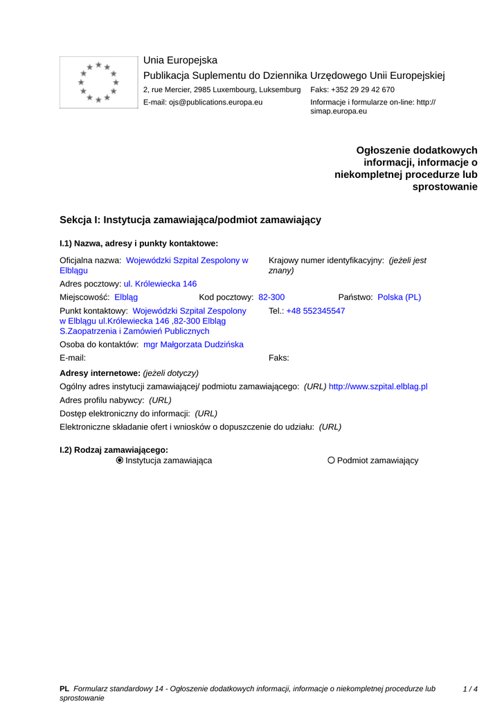 Unia Europejska Publikacja Suplementu do Dziennika Urzędowego Unii Europejskiej 2, rue Mercier, 2985 Luxembourg, Luksemburg Faks: +352 29 29 42 670 E-mail: [email protected] Informacje i formularze on-line: http:// simap.europa.eu Ogłoszenie dodatkowych informacji, informacje o niekompletnej procedurze lub sprostowanie Sekcja I: Instytucja zamawiająca/podmiot zamawiający I.1) Nazwa, adresy i punkty kontaktowe: Oficjalna nazwa: Wojewódzki Szpital Zespolony w Elblągu Krajowy numer identyfikacyjny: (jeżeli jest znany) _____ Adres pocztowy: ul. Królewiecka 146 Miejscowość: Elbląg Kod pocztowy: 82-300 Punkt kontaktowy: Wojewódzki Szpital Zespolony w Elblągu ul.Królewiecka 146 ,82-300 Elbląg S.Zaopatrzenia i Zamówień Publicznych Państwo: Polska (PL) Tel.: +48 552345547 Osoba do kontaktów: mgr Małgorzata Dudzińska E-mail: Faks: _____ Adresy internetowe: (jeżeli dotyczy) Ogólny adres instytucji zamawiającej/ podmiotu zamawiającego: (URL) http://www.szpital.elblag.pl Adres profilu nabywcy: (URL) _____ Dostęp elektroniczny do informacji: (URL) _____ Elektroniczne składanie ofert i wniosków o dopuszczenie do udziału: (URL) _____ I.2) Rodzaj zamawiającego: Instytucja zamawiająca Podmiot zamawiający PL Formularz standardowy 14 - Ogłoszenie dodatkowych informacji, informacje o niekompletnej procedurze lub sprostowanie 1/4 Sekcja II: Przedmiot zamówienia II.1.1) Nazwa nadana zamówieniu: dostawa implantów kręgosłupowych w 19 pakietach z jednoczesnym utworzeniem magazynu depozytowego, użyczeniem zestawu narzędzi niezbędnych do wszczepiania implantów wraz z kontenerami do ich przechowywania i sterylizacji, użyczeniem sprzętu wielorazowego użytku oraz wiertarki w okresie 18 miesięcy dla potrzeb Oddziału Neurochirurgii Wojewódzkiego Szpitala Zespolonego w Elblągu II.1.2) Krótki opis zamówienia lub zakupu: (podano w pierwotnym ogłoszeniu) dostawa w 19 pakietach : Implantów stosowanych w kręgosłupie szyjnym : • pakiet nr 1 – Płytki szyjne • pakiet nr 2 – Proteza trzonu w odcinku szyjnym – sztywna • pakiet nr 3 – Proteza trzonu w odcinku szyjnym – rozszerzalna • pakiet nr 4 – Proteza trzonu w odcinku szyjnym – peek’owa • pakiet nr 5 – Stabilizacje szyjne oparte na śrubach • pakiet nr 6 – Zestaw do stabilizacji międzystawowej kręgosłupa w odcinku szyjnym z dostępu tylnego • pakiet nr 7 - Implanty międzytrzonowe szyjne wraz z użyczeniem zestawu retraktorów, frezami wraz z użyczeniem wiertarki • pakiet nr 8 - Dynamiczna proteza międzytrzonowa w odcinku szyjnym – „sztuczny dysk” Implantów do stabilizacji piersiowych i lędźwiowych • pakiet nr 9 – Stabilizacja tylna transpedikularna • pakiet nr 10 – Stabilizacja transpedikularna złamań osteoporotycznych i nowotworowych kręgosłupa z użyciem śrub perforowanych • pakiet nr 11 – Stabilizacja transpedikularna przezskórna kręgosłupa piersiowego i lędźwiowego • pakiet nr 12 – Stabilizacja przednio-boczna w odcinku piersiowym i lędźwiowym oparta na płycie • pakiet nr 13– Proteza trzonu odcinka piersiowego i lędźwiowego umożliwiająca dystrakcję „in-situ” • pakiet nr 14 – Stabilizatory międzytrzonowe w odcinku lędźwiowym i krzyżowym kręgosłupa • pakiet nr 15 – Zestaw do stabilizacji transpedikularnej przeskórnej opartej o technikę bezkirschnerową z możliwością repozycji ześlizgu • pakiet nr 16 – Zestaw do anatomicznej repozycji trzonów kręgosłupa w złamaniach kompresyjnych i nowotworach • pakiet nr 17 – Zestaw płyt i śrub do laminoplastyki kręgosłupa • pakiet nr 18 – Zestaw do cementoplastyki trzonów kręgów piersiowych i lędźwiowych • pakiet nr 19 – Proteza trzonu kręgowego w odcinku piersiowym i lędźwiowym peek’owa. w 19 pakietach dla potrzeb Oddziału Neurochirurgii Wojewódzkiego Szpitala Zespolonego w Elblągu, których szczegółowy opis, wymagania oraz ilości zostały określone w Załącznikach od Nr 1 do Nr 19 do SIWZ. II.1.3) Wspólny Słownik Zamówień (CPV) Główny przedmiot Słownik główny 33184100 Słownik uzupełniający (jeżeli dotyczy) PL Formularz standardowy 14 - Ogłoszenie dodatkowych informacji, informacje o niekompletnej procedurze lub sprostowanie 2/4 Sekcja IV: Procedura IV.1)Rodzaj procedury (podano w pierwotnym ogłoszeniu) Otwarta Ograniczona Ograniczona przyspieszona Negocjacyjna Negocjacyjna przyspieszona Dialog konkurencyjny Negocjacyjna z uprzednim ogłoszeniem Negocjacyjna bez uprzedniego ogłoszenia Negocjacyjna z publikacją ogłoszenia o zamówieniu Negocjacyjna bez publikacji ogłoszenia o zamówieniu Udzielenie zamówienia bez uprzedniej publikacji ogłoszenia o zamówieniu w Dzienniku Urzędowym Unii Europejskiej IV.2)Informacje administracyjne IV.2.1)Numer referencyjny: (podano w pierwotnym ogłoszeniu) 25/2015 IV.2.2)Dane referencyjne ogłoszenia w przypadku ogłoszeń przesłanych drogą elektroniczną: Pierwotne ogłoszenie przesłane przez eNotices TED eSender Login: ENOTICES_mdudzinska Dane referencyjne ogłoszenia: 2015-076612 rok i numer dokumentu IV.2.3)Ogłoszenie, którego dotyczy niniejsza publikacja: Numer ogłoszenia w Dz.U.: 2015/S 113-204498 z dnia: 13/06/2015 (dd/mm/rrrr) IV.2.4)Data wysłania pierwotnego ogłoszenia: 10/06/2015 (dd/mm/rrrr) PL Formularz standardowy 14 - Ogłoszenie dodatkowych informacji, informacje o niekompletnej procedurze lub sprostowanie 3/4 Sekcja VI: Informacje uzupełniające VI.1) Ogłoszenie dotyczy: Procedury niepełnej Sprostowania Informacji dodatkowych VI.2) Informacje na temat niepełnej procedury udzielenia zamówienia: Postępowanie o udzielenie zamówienia zostało przerwane Postępowanie o udzielenie zamówienia uznano za nieskuteczne Zamówienia nie udzielono Zamówienie może być przedmiotem ponownej publikacji VI.3) Informacje do poprawienia lub dodania : VI.3.1) Zmiana oryginalnej informacji podanej przez instytucję zamawiającą Publikacja w witrynie TED niezgodna z o