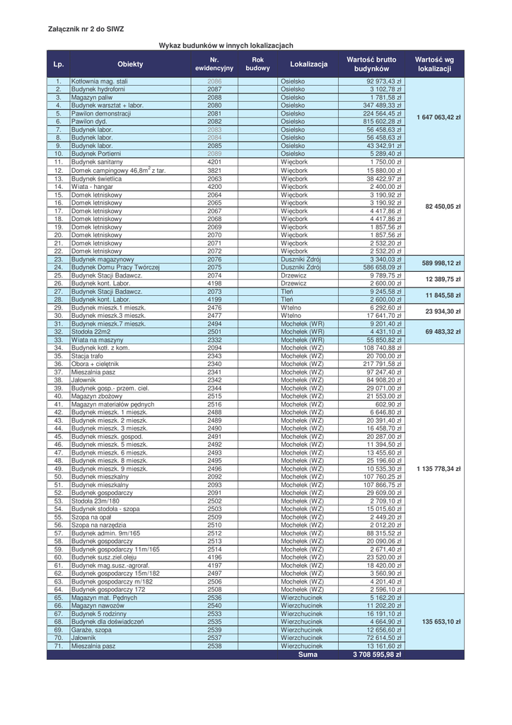 Zał cznik nr 2 do SIWZ Wykaz budunków w innych lokalizacjach Lp. 1. 2. 3. 4. 5. 6. 7. 8. 9. 10. 11. 12. 13. 14. 15. 16. 17. 18. 19. 20. 21. 22. 23. 24. 25. 26. 27. 28. 29. 30. 31. 32. 33. 34. 35. 36. 37. 38. 39. 40. 41. 42. 43. 44. 45. 46. 47. 48. 49. 50. 51. 52. 53. 54. 55. 56. 57. 58. 59. 60. 61. 62. 63. 64. 65. 66. 67. 68. 69. 70. 71. Obiekty Kotłownia mag. stali Budynek hydroforni Magazyn paliw Budynek warsztat + labor. Pawilon demonstracji Pawilon dyd. Budynek labor. Budynek labor. Budynek labor. Budynek Portierni Budynek sanitarny Domek campingowy 46,8m 2 z tar. Budynek wietlica Wiata - hangar Domek letniskowy Domek letniskowy Domek letniskowy Domek letniskowy Domek letniskowy Domek letniskowy Domek letniskowy Domek letniskowy Budynek magazynowy Budynek Domu Pracy Twórczej Budynek Stacji Badawcz. Budynek kont. Labor. Budynek Stacji Badawcz. Budynek kont. Labor. Budynek mieszk.1 mieszk. Budynek mieszk.3 mieszk. Budynek mieszk.7 mieszk. Stodoła 22m2 Wiata na maszyny Budynek kotł. z kom. Stacja trafo Obora + ciel tnik Mieszalnia pasz Jałownik Budynek gosp.- przem. ciel. Magazyn zbo owy Magazyn materiałów p dnych Budynek mieszk. 1 mieszk. Budynek mieszk. 2 mieszk. Budynek mieszk. 3 mieszk. Budynek mieszk. gospod. Budynek mieszk. 5 mieszk. Budynek mieszk. 6 mieszk. Budynek mieszk. 8 mieszk. Budynek mieszk. 9 mieszk. Budynek mieszkalny Budynek mieszkalny Budynek gospodarczy Stodoła 23m/180 Budynek stodoła - szopa Szopa na opał Szopa na narz dzia Budynek admin. 9m/165 Budynek gospodarczy Budynek gospodarczy 11m/165 Budynek susz.ziel.oleju Budynek mag.susz.-agroraf. Budynek gospodarczy 15m/182 Budynek gospodarczy m/182 Budynek gospodarczy 172 Magazyn mat. P dnych Magazyn nawozów Budynek 5 rodzinny Budynek dla do wiadcze Gara e, szopa Jałownik Mieszalnia pasz Nr. ewidencyjny 2086 2087 2088 2080 2081 2082 2083 2084 2085 2089 4201 3821 2063 4200 2064 2065 2067 2068 2069 2070 2071 2072 2076 2075 2074 4198 2073 4199 2476 2477 2494 2501 2332 2094 2343 2340 2341 2342 2344 2515 2516 2488 2489 2490 2491 2492 2493 2495 2496 2092 2093 2091 2502 2503 2509 2510 2512 2513 2514 4196 4197 2497 2506 2508 2536 2540 2533 2535 2539 2537 2538 Rok budowy Lokalizacja Osielsko Osielsko Osielsko Osielsko Osielsko Osielsko Osielsko Osielsko Osielsko Osielsko Wi cbork Wi cbork Wi cbork Wi cbork Wi cbork Wi cbork Wi cbork Wi cbork Wi cbork Wi cbork Wi cbork Wi cbork Duszniki Zdrój Duszniki Zdrój Drzewicz Drzewicz Tle Tle Wtelno Wtelno Mochełek (WR) Mochełek (WR) Mochełek (WR) Mochełek (WZ) Mochełek (WZ) Mochełek (WZ) Mochełek (WZ) Mochełek (WZ) Mochełek (WZ) Mochełek (WZ) Mochełek (WZ) Mochełek (WZ) Mochełek (WZ) Mochełek (WZ) Mochełek (WZ) Mochełek (WZ) Mochełek (WZ) Mochełek (WZ) Mochełek (WZ) Mochełek (WZ) Mochełek (WZ) Mochełek (WZ) Mochełek (WZ) Mochełek (WZ) Mochełek (WZ) Mochełek (WZ) Mochełek (WZ) Mochełek (WZ) Mochełek (WZ) Mochełek (WZ) Mochełek (WZ) Mochełek (WZ) Mochełek (WZ) Mochełek (WZ) Wierzchucinek Wierzchucinek Wierzchucinek Wierzchucinek Wierzchucinek Wierzchucinek Wierzchucinek Suma Warto brutto budynków 92 973,43 zł 3 102,78 zł 1 781,58 zł 347 489,33 zł 224 564,45 zł 815 602,28 zł 56 458,63 zł 56 458,63 zł 43 342,91 zł 5 289,40 zł 1 750,00 zł 15 880,00 zł 38 422,97 zł 2 400,00 zł 3 190,92 zł 3 190,92 zł 4 417,86 zł 4 417,86 zł 1 857,56 zł 1 857,56 zł 2 532,20 zł 2 532,20 zł 3 340,03 zł 586 658,09 zł 9 789,75 zł 2 600,00 zł 9 245,58 zł 2 600,00 zł 6 292,60 zł 17 641,70 zł 9 201,40 zł 4 431,10 zł 55 850,82 zł 108 740,88 zł 20 700,00 zł 217 791,58 zł 97 247,40 zł 84 908,20 zł 29 071,00 zł 21 553,00 zł 602,90 zł 6 646,80 zł 20 391,40 zł 16 458,70 zł 20 287,00 zł 11 394,50 zł 13 455,60 zł 25 196,60 zł 10 535,30 zł 107 760,25 zł 107 866,75 zł 29 609,00 zł 2 709,10 zł 15 015,60 zł 2 449,20 zł 2 012,20 zł 88 315,52 zł 20 090,06 zł 2 671,40 zł 23 520,00 zł 18 420,00 zł 3 560,90 zł 4 201,40 zł 2 596,10 zł 5 162,20 zł 11 202,20 zł 16 191,10 zł 4 664,90 zł 12 656,60 zł 72 614,50 zł 13 161,60 zł 3 708 595,98 zł Warto wg lokalizacji 1 647 063,42 zł 82 450,05 zł 589 998,12 zł 12 389,75 zł 11 845,58 zł 23 934,30 zł 69 483,32 zł 1 135 778,34 zł 135 653,10 zł 3 708 595,98 zł