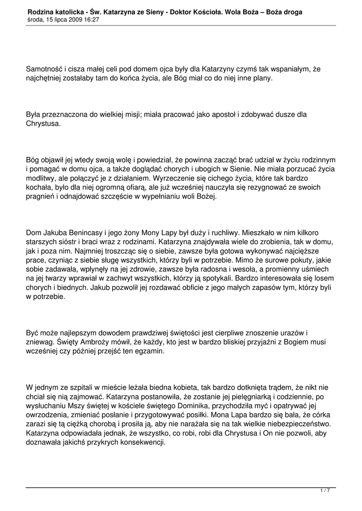 Rodzina katolicka - Św. Katarzyna ze Sieny - Doktor Kościoła. Wola Boża – Boża droga środa, 15 lipca 2009 16:27 Samotność i cisza małej celi pod domem ojca były dla Katarzyny czymś tak wspaniałym, że najchętniej zostałaby tam do końca życia, ale Bóg miał co do niej inne plany. Była przeznaczona do wielkiej misji; miała pracować jako apostoł i zdobywać dusze dla Chrystusa. Bóg objawił jej wtedy swoją wolę i powiedział, że powinna zacząć brać udział w życiu rodzinnym i pomagać w domu ojca, a także doglądać chorych i ubogich w Sienie. Nie miała porzucać życia modlitwy, ale połączyć je z działaniem. Wyrzeczenie się cichego życia, które tak bardzo kochała, było dla niej ogromną ofiarą, ale już wcześniej nauczyła się rezygnować ze swoich pragnień i odnajdować szczęście w wypełnianiu woli Bożej. Dom Jakuba Benincasy i jego żony Mony Lapy był duży i ruchliwy. Mieszkało w nim kilkoro starszych sióstr i braci wraz z rodzinami. Katarzyna znajdywała wiele do zrobienia, tak w domu, jak i poza nim. Najmniej troszcząc się o siebie, zawsze była gotowa wykonywać najcięższe prace, czyniąc z siebie sługę wszystkich, którzy byli w potrzebie. Mimo że surowe pokuty, jakie sobie zadawała, wpłynęły na jej zdrowie, zawsze była radosna i wesoła, a promienny uśmiech na jej twarzy wprawiał w zachwyt wszystkich, którzy ją spotykali. Bardzo interesowała się losem chorych i biednych. Jakub pozwolił jej rozdawać obficie z jego małych zapasów tym, którzy byli w potrzebie. Być może najlepszym dowodem prawdziwej świętości jest cierpliwe znoszenie urazów i zniewag. Święty Ambroży mówił, że każdy, kto jest w bardzo bliskiej przyjaźni z Bogiem musi wcześniej czy później przejść ten egzamin. W jednym ze szpitali w mieście leżała biedna kobieta, tak bardzo dotknięta trądem, że nikt nie chciał się nią zajmować. Katarzyna postanowiła, że zostanie jej pielęgniarką i codziennie, po wysłuchaniu Mszy świętej w kościele świętego Dominika, przychodziła myć i opatrywać jej owrzodzenia, zmieniać posłanie i przygotowywać posiłki. Mona Lapa bardzo się bała, że córka zarazi się tą ciężką chorobą i prosiła ją, aby nie narażała się na tak wielkie niebezpieczeństwo. Katarzyna odpowiadała jednak, że wszystko, co robi, robi dla Chrystusa i On nie pozwoli, aby doznawała jakichś przykrych konsekwencji. 1/7 Rodzina katolicka - Św. Katarzyna ze Sieny - Doktor Kościoła. Wola Boża – Boża droga środa, 15 lipca 2009 16:27 Chora kobieta, która na początku była wdzięczna za otrzymaną pomoc, szybko zaczęła zapominać, z jak wielkim oddanie służy jej Katarzyna. Kiedy pielęgniarka spóźniała się choć trochę, beształa ją i przeklinała, jak gdyby ta była jej niewolnicą. Katarzyna zawsze czule odpowiadała: – Bądź cierpliwa, matko, a zrobię wszystko, czego sobie zażyczysz. Im bardziej niewdzięczna pacjentka obrażała ją, z tym większym oddaniem i miłością jej służyła. Kiedy doszło wręcz do przemocy ze strony pacjentki, a jej ślady były widoczne na rękach Katarzyny, lamenty matki stały się jeszcze głośniejsze. Jednak Katarzyna nie zwracając uwagi na niewygody, służyła chorej aż do jej śmierci. Po śmierci przygotowała ciało do pochówku, gdyż nikt więcej nie odważył się do niego nawet zbliżyć, a jej ufność Bogu cudownie ocaliła ją od choroby. Dowiedziała się o tym jedna z sióstr Zakonu Pokutniczego, starsza kobieta – Palmerina, która była bardzo dumna z tego, iż cały swój majątek oddała na służbę Bogu, ale miała również skłonność do zazdrości. Nie mogła znieść pochwał pod adresem Katarzyny i wzbudziła w sobie wielką niechęć do dziewczyny, o której wszyscy mówili z podziwem. Nie przepuszczała żadnej okazji, aby rzucać oszczerstwa na siostrę ze swego zgromadzenia. Katarzynę wprawiało w rozpacz to, że stała się przyczyną grzechu innej osoby i słysząc, że Palmerina jest umierająca, poszła do niej w nadziei, że da radę oczyścić jej myśli ze złości. Ale jej wysiłki tylko zwiększyły gorycz i nienawiść w sercu zakonnicy. Tylko przez chwilę niecierpliwie słuchała jej słów, a potem obrzuciła przekleństwami Katarzynę i wyprosiła z domu. Katarzyna postanowiła wtedy uciec się do modlitwy i przez trzy dni błagała Naszego Pana, aby nie pozwolił jej, która miała ratować zagubione dusze, być przyczyną upadku jednej z nich. Jej modlitwy zostały wysłuchane. Palmerina posłała po nią i przeprosiła za całe zło, jakie jej wyrządziła. Następnie przyjęła Komunię świętą i zmarła w pokoju. Po tym wydarzeniu Chrystus powiedział Katarzynie, że tylko dzięki jej szczerym modlitwom ta dusza została ocalona. Dziewczyna podziękowała Mu i poprosiła o udzielenie jej w przyszłości specjalnej łaski – chciała, rozmawiając z kimś, móc oglądać jego duszę zamiast ciała. Jak się wkrótce przekonamy, Bóg udzielił jej tego daru. 2/7 Rodzina katolicka - Św. Katarzyna ze Sieny - Doktor Kościoła. Wola Boża – Boża droga środa, 15 lipca 2009 16:27 Katarzyna musiała często wycierpieć najwięcej od swoich sióstr zakonnych i od dobrych ludzi. Nie rozumieli drogi, po której prowadził ją Bóg i nie ufali jej zachowaniu. Z tak wielką pobożnością podchodziła do Najświętszego Sakramentu, że po Komunii świętej często na wiele godzin pozostawała w uniesieniu, nie poruszając się i nie reagując na to, co się wokół niej działo. Ludzie pytali: „Dlaczego nie zachowuje się jak inni i po Mszy świętej nie idzie w ciszy do domu? Kimże jest Katarzyna Benincasa, że zachowuje się tak, jakby była święta?”. Namawiali nawet braci dominikanów, aby zmienić jej spowiednika i zabronić przyjmowania Komunii świętej. Katarzyna znosiła to ze swoją zwykłą cierpliwością i pokorą, wierząc, że naprawdę starają się odnaleźć dobro w 