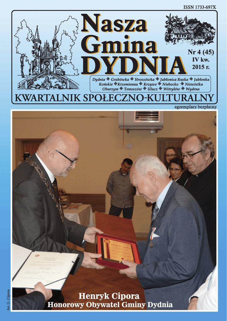 Zofia Morajko fot. S. Pytlowany „Krzywe jest dla Henryka Cipory domem, A Henryk Cipora jest Krzywego – dumą” Słowa te zamieścił Waldemar Bałda w książce „Henryk Cipora Artysta z Krzywego”, której promocja miała miejsce 15 listopada 2015 r. w sali Domu Ludowego w Krzywem. Niecodzienną uroczystość rozpoczął Wójt Gminy Dydnia Jerzy F. Adamski, który serdecznie powitał licznie zgromadzonych mieszkańców wsi oraz zaproszonych gości. Wśród nich znaleźli się m.in.: ks. Prałat Adam Drewniak, Elżbieta Wróbel – Wójt Gminy Niwiska, Waldemar Bałda – autor książki, przedstawiciele Wydawnictwa Libra: Adriana Pyszkowska i Zygmunt Śliwa, Edward Rozenbajgier – członek Zarządu Oddziału Wojewódzkiego Związku OSP RP Województwa Podkarpackiego, Prezes Zarządu Powiatowego Związku OSP RP w Brzozowie, dyrektorzy szkół i placówek z terenu gminy, Stanisław Pałys – zastępca Wójta Gminy Dydnia, Beata Czerkies – p.o. Sekretarza Gminy, Zofia Pytlowana – Skarbnik Gminy, radni gminy na czele z Przewodniczącym Rady – Piotrem Szulem, sołtysi, kierownicy referatów UG Dydnia, przedstawiciele lokalnych mediów. Henryk Cipora - Artysta z Krzywego Wójt przybliżył zebranym niezwykłą postać P. Henryka Cipory oraz dorobek artystyczny najwybitniejszego przedstawiciela rzeźbiarstwa ludowego Gminy Dydnia. Następnie głos zabrała Iwona Pocałuń – dyrektor Zespołu Szkół w Dydni, podkreślając związki P. Henryka ze szkołą poprzez udział w warsztatach, podczas których przekazuje młodzieży tajniki artystycznego rzemiosła. Kolejny punkt uroczystości to „muzyczna laurka” dla P. Cipory przygotowana przez uczniów Szkoły Muzycznej I st. w Dydni. Koncert prowadziła dyrektor szkoły Elżbieta Przystasz. Występujący młodzi artyści to laureaci prestiżowych konkursów muzycznych, np.: Kacper Kosztyła i Filip Siwiecki - “wirtuozi” akordeonu. Zaprezentowały się też: trio fletowe, duet fortepianowy oraz specjalne trio fletowe. Należy dodać, że występujące uczennice: Ola Howorko i Kasia Kondracka to młode „talenty” Krzywego. Muzyczne dzieła przeplatane były utworami poetyckimi w wykonaniu uczniów Zespołu Szkół w Dydni przygotowanych przez Zofię Sokołowską – Chorążak. Recy- tatorzy: Magdalena Kondracka, Zuzanna Howorko, Kinga Kraczkowska, Weronika Szelest, Daniel Bok, Jakub Kraczkowski, Karol Wójcik – mieszkający w Krzywem oraz Weronika Sabat zaprezentowali wiersze rodzimych poetów. To: „Rymowany przewodnik po Krzywem” autorstwa Ignacego Wójcika, „Talenty Krzywego” Mieczysława Nykla oraz okolicznościowy wiersz Urszuli Skrabalak „Mistrz Henryk Cipora”. W imieniu organistów, którzy kiedykolwiek dotykali organów ozdobionych przez P. Henryka, serdeczne życzenia złożyła Mistrzowi Elżbieta Przystasz. Miłym akcentem uroczystości były odznaczenia dla zasłużonych strażaków z Krzywego. Uchwalą Prezydium Zarządu Oddziału Wojewódzkiego Związku OSP RP Województwa Podkarpackiego Złotym Medalem „Za zasługi dla pożarnictwa” odznaczono dha Bolesława Kota, a Srebrnym Medalem „Za zasługi dla pożarnictwa” – dha Henryka Ciporę. Wręczenia odznaczeń dokonali: dh Edward Rozenbajgier, Mariusz Kot – Prezes, Józef Toczek – Naczelnik OSP w Krzywem, Dariusz Kot – radny, Jerzy F. Adamski – Wójt Gminy. Na wniosek zarządu OSP Krzywe Wójt Gminy Dydnia ufundował okolicznościowe grawertony z podziękowaniem za ofiarną służbę strażacką dla druhów: Bolesława Kota, Józefa Kota, Ryszarda Kraczkowskiego, Eugeniusza Szuby, Edwarda Lorenca, Jana Toczka. Następnie głos zabrał Przewodniczący Rady Gminy – Pior Szul. Przedstawił krótki biogram Henryka Cipory oraz Jego wyjątkową postać poprzez przywołanie wypowiedzi tych, którzy znają P. Henryka bądź spotkali się z Nim okazjonalnie. Zapoznał też z treścią uchwały Rady Gminy Dydnia z dn. 13 listopada 2015 r., na mocy której Panu Henrykowi Ciporze nadano Honorowe Obywatelstwo Gminy Dydnia. Akt nadania Honorowego Obywatelstwa wręczyli P. Henrykowi: Przewodniczący Rady i Wójt Gminy Dydnia. Z kolei przyszedł czas na kulminacyjny punkt programu, czyli promocję książki Waldemara Bałdy „Henryk Cipora Artysta z Krzywego”. Wójt podziękował wszystkim, którzy wnieśli swój wkład w jej powstanie. Oddał głos twórcom dzieła. Autor zapoznał ze swoim warsztatem pisarskim, podkreślając, że pisanie o takim człowieku jak P. Henio, stanowiło niezwykłą przyjemność. Pozostali: Zygmunt Śliwa – wydawnictwo Libra, Beata Czerkies, Zofia Morajko, autorzy zdjęć Sylweriusz Pytlowany i Grzegorz Cipora dzielili się osobistymi wrażeniami ze spotkań z P. Henrykiem, składając Mu również serdeczne życzenia i gratulacje. Pan H. Cipora przedstawił etapy rozwoju swojej artystycznej pracy. Zwrócił uwagę na brak przygotowania, odpowiedniego wykształcenia, talent rozwijał samodzielnie. Musiał pokonywać wiele trudności, także zdrowotnych. Mistrz wyraził słowa wdzięczności dla twórców książki oraz wszystkich życzliwych mu ludzi. Pod adresem Artysty popłynęło wiele życzeń i gratulacji. Oprócz wymienionych wcześniej osób złożyli je: ks. Prałat Adam Drewniak, Elżbieta Wróbel - Wójt Gminy Niwiska, Zofia Turoń – Sołtys wsi Krzywe, dyrektorzy szkół z terenu gminy, Jacek Adamski – członek Zarządu Powiatu w imieniu własnym oraz Starosty Brzozowskiego Zygmunta Nasza Gmina Dydnia IV/2015 Strażakom OSP w Krzywem, szczególnie: Sołtys Zofii Turoń, Przewodniczącej KGW Jadwidze Kraczkowskiej, Radnemu Dariuszowi Kotowi, który zaprosił uczestników spotkania na poczęstunek. Do autora i bohatera książki ustawiła się długa kolejka po autografy. Zofia Morajko 11 listopada – to dzień, w którym obchodzimy narodowe Święto Niepodległości. Jest to symboliczna data odrodzenia się państwa polskiego po 123 latach niewoli. W Kościele Parafialnym w Niebocku, właśni