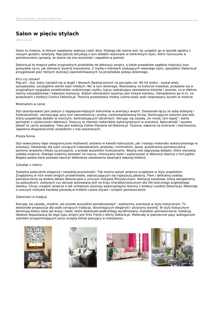 Tekst pochodzi z serwisu: Dekoria.pl Salon w pięciu stylach 2012-11-22 Salon to miejsce, w którym spędzamy większą część dnia. Dlatego tak ważne jest, by urządzić go w sposób zgodny z naszym gustem, estetyką. Najczęściej decydują o tym dodatki wykonane w konkretnym stylu, które rozrzucone w pomieszczeniu sprawią, że stanie się ono wyraziste i zapadnie w pamięć. Dekoria.pl to miejsce pełne oryginalnych produktów do dekoracji wnętrz, a także prawdziwe zagłębie inspiracji oraz pomysłów na to, jak odmienić wystrój mieszkania. Z myślą o klientach szukających własnego stylu, specjaliści Dekoria.pl przygotowali pięć różnych stylizacji zaprezentowanych na przykładzie pokoju dziennego. Kicz czy sztuka? Pop-art - styl, który narodził się w Anglii i Stanach Zjednoczonych na początku lat ’60 XX wieku - zyskał wielu sympatyków, szczególnie wśród ludzi młodych. Nic w tym dziwnego. Wzorowany na kulturze masowej, przejawia się w oryginalnym wyglądzie przedmiotów codziennego użytku. Łączy zaskakujące zestawienia kolorów i wzorów, co w efekcie tworzy nieszablonowe i odważne stylizacje. Stałym elementem wystroju jest motyw komiksu. Odnajdziemy go m.in. na produktach z kolekcji Comics Dekoria.pl. Tkanina przedstawia modny czarno-biały wzór inspirowany życiem w mieście. Minimalizm w cenie Styl skandynawski jest jednym z najpopularniejszych kierunków w aranżacji wnętrz. Doskonale łączy ze sobą estetykę i funkcjonalność, zachwycając przy tym naturalnością i prostą, nieskomplikowaną formą. Dominującym kolorem jest biel, którą uzupełniają dodatki w mocnych, kontrastujących odcieniach. Kierując się zasadą „im mniej, tym lepiej”, warto pamiętać o użyteczności dekoracji. Dotyczy to również materiałów wykorzystanych w aranżacji. Naturalność i wysoka jakość to cechy pożądane. Taka jest kolekcja Cotton Panama od Dekoria.pl. Tkanina, odporna na ścieranie i mechacenie, zapewnia długowieczność produktom z niej wykonanych. Prosta forma Styl nowoczesny daje nieograniczone możliwość zarówno w kwestii kolorystyki, jak i rodzaju materiału wykorzystanego w aranżacji. Doskonały dla ludzi ceniących indywidualizm, prostotę i minimalizm. Jasne, przestronne pomieszczenia pomimo wrażenia chłodu są przyjazne, a przede wszystkim funkcjonalne. Ważną role odgrywają dodatki, które stanowią ozdobę wnętrza. Dlatego możemy postawić na mocny, intensywny kolor i wykorzystać w dekoracji tkaniny z linii Jupiter. Bogata paleta barw pozwala tworzyć efektowne zestawienia wewnątrz własnej kolekcji. Czerpiąc z natury Subtelne połączenie elegancji i swojskiej przytulności. Tak można opisać wnętrza urządzone w stylu angielskim. Znajdziemy w nich wiele drogich przedmiotów, odznaczających się najwyższą jakością. Tłem i delikatną ozdobą pomieszczenia są drobne detale dekoracyjne o uroczym motywie florystycznym. Wariacja kwiatowa, którą odnajdziemy na poduszkach, zasłonach czy obrusie wzorowana jest na kroju charakterystycznym dla XIX-wiecznego angielskiego dworku. Chcąc urządzić wnętrze o tak unikalnym wystroju wykorzystajmy tkaniny z kolekcji Londres Dekoria.pl. Materiały o uroczym motywie kwiatów pozwolą w krótkim czasie ożywić i ocieplić pomieszczenie. Zakochani w tradycji Kierując się zasadą „modnie, ale przede wszystkim ponadczasowo”, wybierzmy aranżacje w stylu klasycznym. To doskonała propozycja dla osób ceniących tradycję, doceniających elegancki i przytulny wystrój. W stylu klasycznym dominują kolory takie jak brązy i beże, które doskonale podkreślają wyrafinowany charakter pomieszczenia. Kolekcją idealnie dopasowaną do tego typu wnętrz jest linia Trend z oferty Dekoria.pl. Materiały w poprzeczne pasy wzbogacone szenilem przypominającym plusz ocieplą klimat panujący w mieszkaniu.