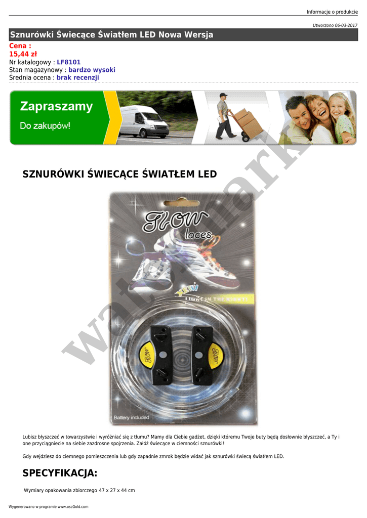 Informacje o produkcie Utworzono 06-03-2017 Sznurówki Świecące Światłem LED Nowa Wersja Cena : 15,44 zł er m ar k Nr katalogowy : LF8101 Stan magazynowy : bardzo wysoki Średnia ocena : brak recenzji w at SZNURÓWKI ŚWIECĄCE ŚWIATŁEM LED Lubisz błyszczeć w towarzystwie i wyróżniać się z tłumu? Mamy dla Ciebie gadżet, dzięki któremu Twoje buty będą dosłownie błyszczeć, a Ty i one przyciągniecie na siebie zazdrosne spojrzenia. Załóż świecące w ciemności sznurówki! Gdy wejdziesz do ciemnego pomieszczenia lub gdy zapadnie zmrok będzie widać jak sznurówki świecą światłem LED. SPECYFIKACJA: Wymiary opakowania zbiorczego 47 x 27 x 44 cm Wygenerowano w programie www.oscGold.com 144 szt. w at er m ar k W opakowaniu zbiorczym