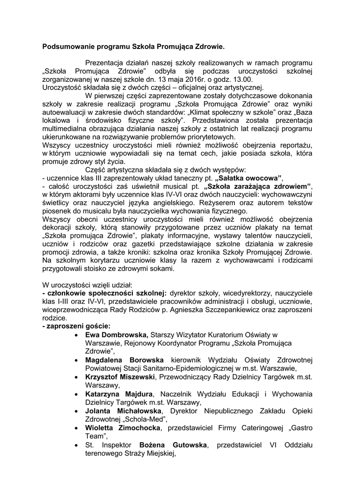 Podsumowanie programu Szkoła Promująca Zdrowie. Prezentacja działań naszej szkoły realizowanych w ramach programu „Szkoła Promująca Zdrowie” odbyła się podczas uroczystości szkolnej zorganizowanej w naszej szkole dn. 13 maja 2016r. o godz. 13.00. Uroczystość składała się z dwóch części – oficjalnej oraz artystycznej. W pierwszej części zaprezentowane zostały dotychczasowe dokonania szkoły w zakresie realizacji programu „Szkoła Promująca Zdrowie” oraz wyniki autoewaluacji w zakresie dwóch standardów: „Klimat społeczny w szkole” oraz „Baza lokalowa i środowisko fizyczne szkoły”. Przedstawiona została prezentacja multimedialna obrazująca działania naszej szkoły z ostatnich lat realizacji programu ukierunkowane na rozwiązywanie problemów priorytetowych. Wszyscy uczestnicy uroczystości mieli również możliwość obejrzenia reportażu, w którym uczniowie wypowiadali się na temat cech, jakie posiada szkoła, która promuje zdrowy styl życia. Część artystyczna składała się z dwóch występów: - uczennice klas III zaprezentowały układ taneczny pt. „Sałatka owocowa”, - całość uroczystości zaś uświetnił musical pt. „Szkoła zarażająca zdrowiem”, w którym aktorami były uczennice klas IV-VI oraz dwóch nauczycieli: wychowawczyni świetlicy oraz nauczyciel języka angielskiego. Reżyserem oraz autorem tekstów piosenek do musicalu była nauczycielka wychowania fizycznego. Wszyscy obecni uczestnicy uroczystości mieli również możliwość obejrzenia dekoracji szkoły, którą stanowiły przygotowane przez uczniów plakaty na temat „Szkoła promująca Zdrowie”, plakaty informacyjne, wystawy talentów nauczycieli, uczniów i rodziców oraz gazetki przedstawiające szkolne działania w zakresie promocji zdrowia, a także kroniki: szkolna oraz kronika Szkoły Promującej Zdrowie. Na szkolnym korytarzu uczniowie klasy Ia razem z wychowawcami i rodzicami przygotowali stoisko ze zdrowymi sokami. W uroczystości wzięli udział: - członkowie społeczności szkolnej: dyrektor szkoły, wicedyrektorzy, nauczyciele klas I-III oraz IV-VI, przedstawiciele pracowników administracji i obsługi, uczniowie, wiceprzewodnicząca Rady Rodziców p. Agnieszka Szczepankiewicz oraz zaproszeni rodzice. - zaproszeni goście: Ewa Dombrowska, Starszy Wizytator Kuratorium Oświaty w Warszawie, Rejonowy Koordynator Programu „Szkoła Promująca Zdrowie”, Magdalena Borowska kierownik Wydziału Oświaty Zdrowotnej Powiatowej Stacji Sanitarno-Epidemiologicznej w m.st. Warszawie, Krzysztof Miszewski, Przewodniczący Rady Dzielnicy Targówek m.st. Warszawy, Katarzyna Majdura, Naczelnik Wydziału Edukacji i Wychowania Dzielnicy Targówek m.st. Warszawy, Jolanta Michałowska, Dyrektor Niepublicznego Zakładu Opieki Zdrowotnej „Schola-Med”, Wioletta Zimochocka, przedstawiciel Firmy Cateringowej „Gastro Team”, St. Inspektor Bożena Gutowska, przedstawiciel VI Oddziału terenowego Straży Miejskiej, St. Inspektor Krzysztof Gorzelniawski, przedstawiciel VI Oddziału terenowego Straży Miejskiej, Roman Soroczyński, prezes Uczniowskiego Klubu Sportowego „Zdrowy Targówek”, Małgorzata Jarzębska, koordynator programu „Szkoła Promująca Zdrowie” w Szkole Podstawowej nr 82 w Warszawie, dyrektorzy placówek kulturalno-oświatowych, dyrektorzy szkół podstawowych dzielnicy Targówek m.st. Warszawy.