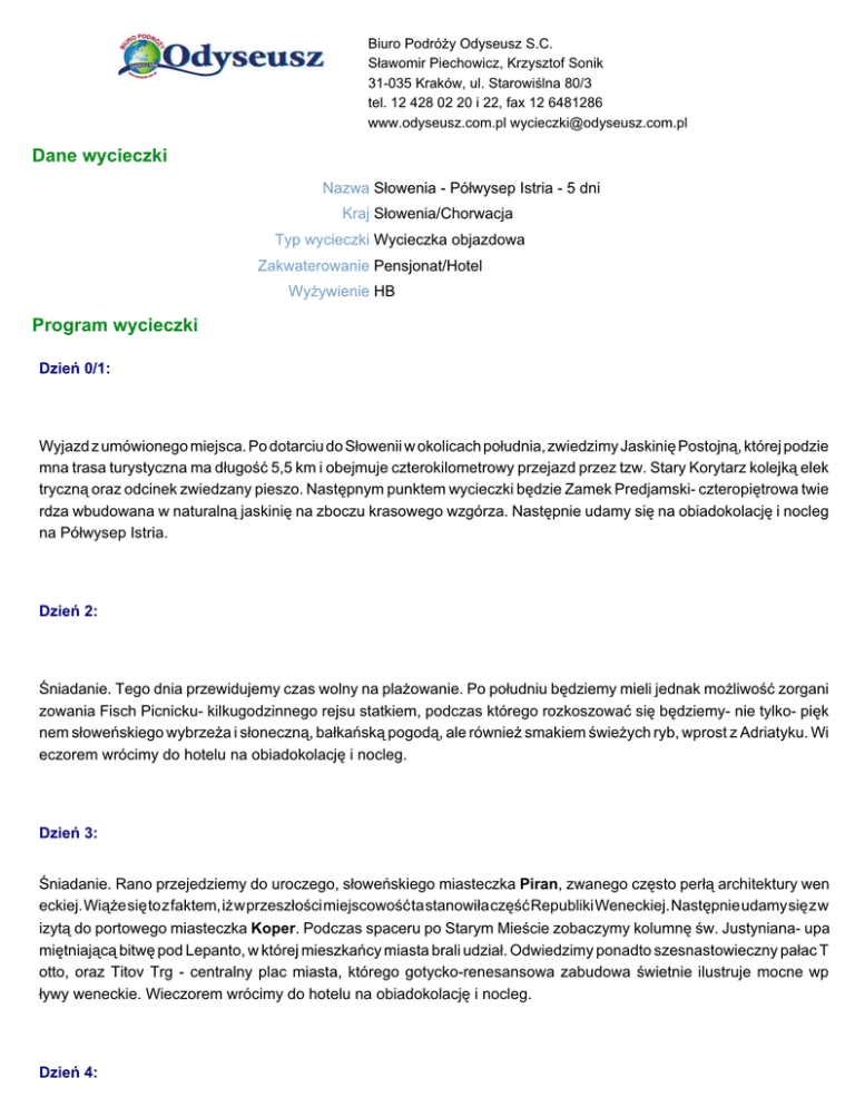 Biuro Podróży Odyseusz S.C. Sławomir Piechowicz, Krzysztof Sonik 31-035 Kraków, ul. Starowiślna 80/3 tel. 12 428 02 20 i 22, fax 12 6481286 www.odyseusz.com.pl [email protected] Dane wycieczki Nazwa Słowenia - Półwysep Istria - 5 dni Kraj Słowenia/Chorwacja Typ wycieczki Wycieczka objazdowa Zakwaterowanie Pensjonat/Hotel Wyżywienie HB Program wycieczki Dzień 0/1: Wyjazd z umówionego miejsca. Po dotarciu do Słowenii w okolicach południa, zwiedzimy Jaskinię Postojną, której podzie mna trasa turystyczna ma długość 5,5 km i obejmuje czterokilometrowy przejazd przez tzw. Stary Korytarz kolejką elek tryczną oraz odcinek zwiedzany pieszo. Następnym punktem wycieczki będzie Zamek Predjamski- czteropiętrowa twie rdza wbudowana w naturalną jaskinię na zboczu krasowego wzgórza. Następnie udamy się na obiadokolację i nocleg na Półwysep Istria. Dzień 2: Śniadanie. Tego dnia przewidujemy czas wolny na plażowanie. Po południu będziemy mieli jednak możliwość zorgani zowania Fisch Picnicku- kilkugodzinnego rejsu statkiem, podczas którego rozkoszować się będziemy- nie tylko- pięk nem słoweńskiego wybrzeża i słoneczną, bałkańską pogodą, ale również smakiem świeżych ryb, wprost z Adriatyku. Wi eczorem wrócimy do hotelu na obiadokolację i nocleg. Dzień 3: Śniadanie. Rano przejedziemy do uroczego, słoweńskiego miasteczka Piran, zwanego często perłą architektury wen eckiej. Wiąże się to z faktem, iż w przeszłości miejscowość ta stanowiła część Republiki Weneckiej. Następnie udamy się z w izytą do portowego miasteczka Koper. Podczas spaceru po Starym Mieście zobaczymy kolumnę św. Justyniana- upa miętniającą bitwę pod Lepanto, w której mieszkańcy miasta brali udział. Odwiedzimy ponadto szesnastowieczny pałac T otto, oraz Titov Trg - centralny plac miasta, którego gotycko-renesansowa zabudowa świetnie ilustruje mocne wp ływy weneckie. Wieczorem wrócimy do hotelu na obiadokolację i nocleg. Dzień 4: Śniadanie. Po śniadaniu wybierzemy się do- największego na Półwyspie Istria- chorwackiego miasteczka Pula. W tym uroczym, starożytnym mieście zwiedzimy doskonale zachowany, monumentalny rzymski amfiteatr, którego bud owę rozpoczęto w 2 roku p.n.e. W Rovinj- uchodzącym za jedno z najpiękniejszych miast półwyspu i całej Chorw acji- poczujemy niepowtarzalną atmosferę, którą tworzą urokliwe, brukowane uliczki z ciasną zabudową w stylu wenecki m. Zobaczymy tam imponujące pałace, średniowieczne kamienice i mury miejskie z czasów panowania wenecjan. Podz iwiać będziemy także liczne zabytki architektury sakralnej, z których najważniejszy stanowi osiemnastowieczna Kated ra św. Eufemi- chrześcijańskiej męczennicy i orędowniczki osób słabej wiary. Podczas zwiedzania będziemy mieli możliwoś ć wejścia na mierzącą 61 metrów dzwonnicę. Po wizycie w Rovinj wrócimy do hotelu na obiadokolację i nocleg. Dzień 5: Śniadanie. Po posiłku wyruszymy w kierunku Polski. Po drodze zatrzymamy się jednak w Lublanie. Podczas krótkiej wizyty w stolicy Słowenii zwiedzimy Stare Miasto, rynek miejski oraz Plac Pre?erena- upamiętniający posta ć najwybitniejszego słoweńskiego poety. Zwiedzimy także ufortyfikowany w XV wieku Zamek Gradski, górujący nad miaste m. Zakończenie wycieczki planowane jest w godzinach nocnych. Cena zawiera: przejazd komfortowym autokarem, 4 noclegi w pensjonacie lub hotelu, 4 śniadania, 4 obiadokolację, opiekę pilota ? przewodnika, bezpłatne miejsca dla opieki, ubezpieczenie KL,NNW, wszystkie opłaty drogowe oraz parkingi. Cena nie zawiera: biletów wstępu do zwiedzanych obiektów, lokalnego przewodnika, Fisch Picknicu, opłat klimatycznych. Uwaga !!! Jeżeli szkoła jest z poza Krakowa lub Katowic przygotowujemy indywidualną kalkulację w równie atrak cyjnych cenach. Gwarantujemy konkurencyjne ceny i dobrą jakość usług. Cena Miasto wyjazdu Katowice Kraków Rzeszów Cena w przypadku 30os. 1250.00 zł 1280.00 zł 1350.00 zł Cena w przypadku 44os. 1040.00 zł 1060.00 zł 1110.00 zł