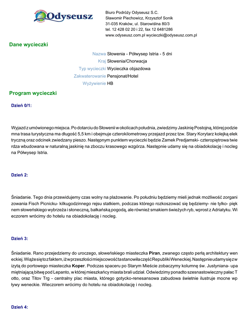 Dane wycieczki Program wycieczki - ODYSEUSZ