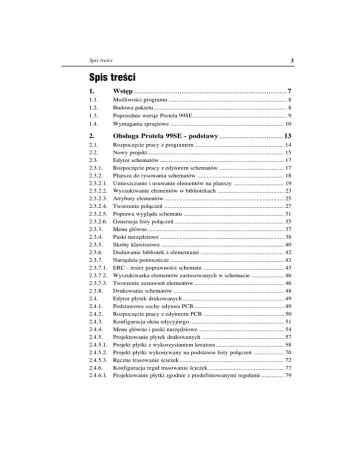 Spis treści 3 Spis treœci 1. Wstęp .................................................................................... 7 1.1. 1.2. 1.3. 1.4. Możliwości programu .............................................................................. 8 Budowa pakietu ........................................................................................ 8 Poprzednie wersje Protela 99SE .............................................................. 9 Wymagania sprzętowe ........................................................................... 10 2. Obsługa Protela 99SE − podstawy ................................... 13 2.1. 2.2. 2.3. 2.3.1. 2.3.2. 2.3.2.1. 2.3.2.2. 2.3.2.3. 2.3.2.4. 2.3.2.5. 2.3.2.6. 2.3.3. 2.3.4. 2.3.5. 2.3.6. 2.3.7. 2.3.7.1. 2.3.7.2. 2.3.7.3. 2.3.8. 2.4. 2.4.1. 2.4.2. 2.4.3. 2.4.4. 2.4.5. 2.4.5.1. 2.4.5.2. 2.4.5.3. 2.4.6. 2.4.6.1. Rozpoczęcie pracy z programem ........................................................... 14 Nowy projekt .......................................................................................... 15 Edytor schematów .................................................................................. 17 Rozpoczęcie pracy z edytorem schematów ........................................... 17 Plansza do rysowania schematów ......................................................... 18 Umieszczanie i usuwanie elementów na planszy ................................. 19 Wyszukiwanie elementów w bibliotekach ............................................ 23 Atrybuty elementów ............................................................................... 25 Tworzenie połączeń ............................................................................... 27 Poprawa wyglądu schematu .................................................................. 31 Generacja listy połączeń ........................................................................ 35 Menu główne .......................................................................................... 37 Paski narzędziowe .................................................................................. 38 Skróty klawiszowe ................................................................................. 40 Dodawanie bibliotek z elementami ....................................................... 42 Narzędzia pomocnicze ........................................................................... 43 ERC − tester poprawności schematu ..................................................... 43 Wyszukiwarka elementów zastosowanych w schemacie ...................... 46 Tworzenie zestawień elementów ........................................................... 46 Drukowanie schematów ......................................................................... 48 Edytor płytek drukowanych ................................................................... 49 Podstawowe cechy edytora PCB ........................................................... 49 Rozpoczęcie pracy z edytorem PCB ..................................................... 50 Konfiguracja okna edycyjnego .............................................................. 51 Menu główne i paski narzędziowe ........................................................ 54 Projektowanie płytek drukowanych ...................................................... 57 Projekt płytki z wykorzystaniem kreatora ............................................. 58 Projekt płytki wykonywany na podstawie listy połączeń .................... 70 Ręczne trasowanie ścieżek ..................................................................... 72 Konfiguracja reguł trasowania ścieżek .................................................. 77 Projektowanie płytki zgodnie z predefiniowanymi regułami ............... 79 Spis treści 4 2.4.7. 2.4.8. 2.4.8.1. 2.4.8.2. 2.4.9. 2.4.10. Poprawki i modyfikacje wyglądu płytki ............................................... 81 Narzędzia pomocnicze ........................................................................... 83 DRC − tester poprawności połączeń na płytce drukowanej.................. 83 Wizualizacja projektu płytki − Board in 3D ......................................... 85 Zarządzanie projektami płytek wielowarstwowych .............................. 86 Drukowanie płytki ................................................................................. 88 3. Biblioteki ............................................................................ 91 3.1. 3.2. 3.2.1. 3.2.2. 3.2.3. 3.2.4. 3.2.4.1. 3.2.4.2. 3.2.4.3. 3.2.5. 3.2.6. 3.2.7. 3.2.8. 3.2.9. 3.2.10. 3.3. 3.3.1. 3.3.2. 3.3.3. 3.3.4. 3.3.4.1. Podstawy ................................................................................................ 92 Biblioteki edytora schematów ............................................................... 92 Obsługa edytora bibliotek ...................................................................... 93 Menu i paski narzędziowe ..................................................................... 95 Edycja istniejących bibliotek ................................................................. 97 Tworzenie nowych bibliotek ............................................................... 101 Rysowanie kształtu nowego elementu ................................................ 106 Tworzenie i pozycjonowanie wyprowadzeń ....................................... 110 Edycja sposobu wyświetlania i cech wyprowadzeń ........................... 111 Określanie właściwości elementów ..................................................... 113 Parametry symulacyjne ........................................................................ 115 Alternatywne reprezentacje graficzne ................................................. 118 Tworzenie elementów bibliotecznych składających się z kilku części ..... 118 Konfiguracja edytora bibliotek ............................................................ 122 Sporządza