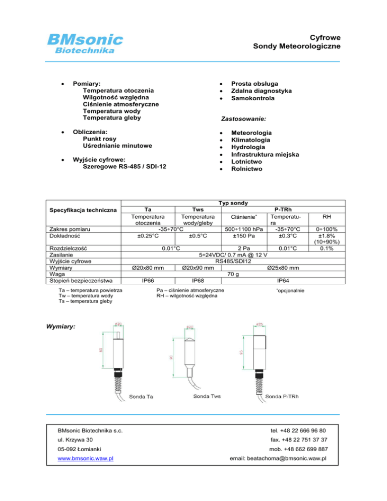 Cyfrowe Sondy Meteorologiczne Pomiary: Temperatura otoczenia Wilgotność względna Ciśnienie atmosferyczne Temperatura wody Temperatura gleby Obliczenia: Punkt rosy Uśrednianie minutowe Wyjście cyfrowe: Szeregowe RS-485 / SDI-12 Prosta obsługa Zdalna diagnostyka Samokontrola Zastosowanie: Meteorologia Klimatologia Hydrologia Infrastruktura miejska Lotnictwo Rolnictwo Typ sondy Specyfikacja techniczna Zakres pomiaru Dokładność Rozdzielczość Zasilanie Wyjście cyfrowe Wymiary Waga Stopień bezpieczeństwa Ta – temperatura powietrza Tw – temperatura wody Ts – temperatura gleby Ta Tws Temperatura Temperatura otoczenia wody/gleby -35÷70°C ±0.25°C ±0.5°C 0.01°C Ø20x80 mm IP66 Ciśnienie 500÷1100 hPa ±150 Pa P-TRh Temperatura -35÷70°C ±0.3°C 2 Pa 0.01°C 5÷24VDC/ 0.7 mA @ 12 V RS485/SDI12 Ø20x90 mm Ø25x80 mm 70 g IP68 IP64 Pa – ciśnienie atmosferyczne RH – wilgotność względna RH 0÷100% ±1.8% (10÷90%) 0.1% opcjonalnie Wymiary: BMsonic Biotechnika s.c. tel. +48 22 666 96 80 ul. Krzywa 30 fax. +48 22 751 37 37 05-092 Łomianki mob. +48 662 699 887 www.bmsonic.waw.pl email: [email protected]