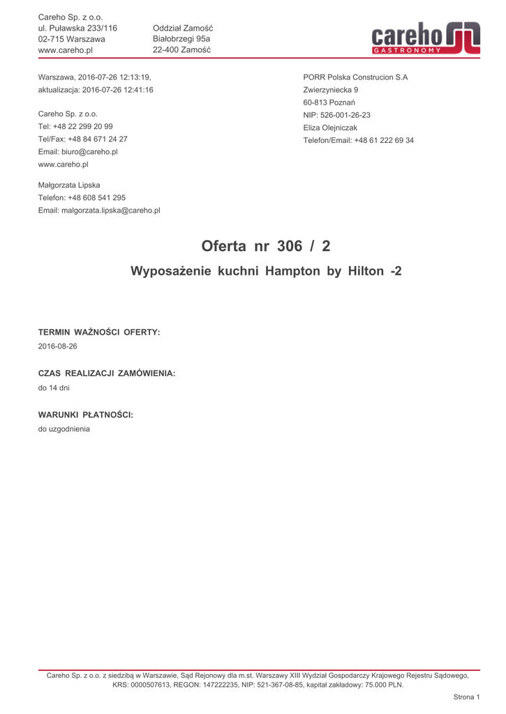 Careho Sp. z o.o. ul. Puławska 233/116 02-715 Warszawa www.careho.pl Oddział Zamość Białobrzegi 95a 22-400 Zamość Warszawa, 2016-07-26 12:13:19, PORR Polska Construcion S.A aktualizacja: 2016-07-26 12:41:16 Zwierzyniecka 9 60-813 Poznań Careho Sp. z o.o. NIP: 526-001-26-23 Tel: +48 22 299 20 99 Eliza Olejniczak Tel/Fax: +48 84 671 24 27 Telefon/Email: +48 61 222 69 34 Email: [email protected] www.careho.pl Małgorzata Lipska Telefon: +48 608 541 295 Email: [email protected] Oferta nr 306 / 2 Wyposażenie kuchni Hampton by Hilton -2 TERMIN WAŻNOŚCI OFERTY: 2016-08-26 CZAS REALIZACJI ZAMÓWIENIA: do 14 dni WARUNKI PŁATNOŚCI: do uzgodnienia Careho Sp. z o.o. z siedzibą w Warszawie, Sąd Rejonowy dla m.st. Warszawy XIII Wydział Gospodarczy Krajowego Rejestru Sądowego, KRS: 0000507613, REGON: 147222235, NIP: 521-367-08-85, kapitał zakładowy: 75.000 PLN. Strona 1 Careho Sp. z o.o. ul. Puławska 233/116 02-715 Warszawa www.careho.pl Oddział Zamość Białobrzegi 95a 22-400 Zamość Podsumowanie oferty Lp. Nazwa produktu Model Kod Ilość Cena* Rabat Po rabacie* 16 Stół przyścienny z półką 700mm POL-103 103-207-3 1 1 365,00 zł 15% 1 160,25 zł POL-502 502193-6 1 660,00 zł 15% 561,00 zł 850(H)mm, 1200(L)mm, 600(D)mm RMS - 1041 / 12x6 00008117 1 1 350,00 zł 10% 1 215,00 zł Nadstawka na stół dwupoziomowa 300mm POL-502 502113 1 493,00 zł 15% 419,05 zł O 1011 i 00003493 1 37 500,00 zł 10% 33 750,00 zł ST 1116 00003569 1 1 450,00 zł 10% 1 305,00 zł RT - 3D 00001411 1 5 830,00 zł 10% 5 247,00 zł 775419 3 13 797,00 zł 10% 12 417,30 zł 742031 1 709,00 zł 5% 673,55 zł 382-103 1 204,00 zł 15% 173,40 zł 90092 1 1 183,25 zł 10% 1 064,92 zł 692216 1 165,00 zł 5% 156,75 zł 850(H)mm, 2000(W)mm, 700(D)mm 17 Nadstawka na stół dwupoziomowa 300mm 700(H)mm, 1900(W)mm, 300(D)mm 18 19 Stół na kółkach 700(H)mm, 1100(W)mm, 300(D)mm 20 Piec konwekcyjno-parowy 10x GN 1/1 + 1x GN 1/1 17,6kW 1046(H)mm, 933(L)mm, 863(D)mm 20.1 Podstawa pod piec 611/1011 - 16 prowadnic GN 1/1 700(H)mm, 830(L)mm, 585(D)mm 22 Stół chłodniczy 3 drzwiowy 850(H)mm, 1800(W)mm, 700(D)mm 23 Kuchenka mikrofalowa 1,85kW 368(H)mm, 464(W)mm, 597(D)mm 24 Kontakt grill panini 2,2kW 195(H)mm, 390(W)mm, 390(D)mm 27 Półka wisząca z dwiema konsolami 300mm POL-382 1000(W)mm, 300(D)mm 28 Kuchnia indukcyjna 3,5kW 115(H)mm, 440(L)mm, 340(D)mm 29 Lampa owadobójcza 2x15W 320(H)mm, 500(W)mm, 95(D)mm Suma netto: 58 143,22 zł VAT: 13 372,94 zł Suma brutto: 71 516,16 zł *Ceny netto Careho Sp. z o.o. z siedzibą w Warszawie, Sąd Rejonowy dla m.st. Warszawy XIII Wydział Gospodarczy Krajowego Rejestru Sądowego, KRS: 0000507613, REGON: 147222235, NIP: 521-367-08-85, kapitał zakładowy: 75.000 PLN. Strona 2 Careho Sp. z o.o. ul. Puławska 233/116 02-715 Warszawa www.careho.pl Oddział Zamość Białobrzegi 95a 22-400 Zamość Produkty opcjonalne Lp. Nazwa produktu 22. Stół chłodniczy 3 drzwiowy Model Kod Ilość 841036 1 Cena* Rabat Po rabacie* 3 490,00 zł 10% 3 141,00 zł 850(H)mm, 1795(W)mm, 700(D)mm *Ceny netto Careho Sp. z o.o. z siedzibą w Warszawie, Sąd Rejonowy dla m.st. Warszawy XIII Wydział Gospodarczy Krajowego Rejestru Sądowego, KRS: 0000507613, REGON: 147222235, NIP: 521-367-08-85, kapitał zakładowy: 75.000 PLN. Strona 3 Careho Sp. z o.o. ul. Puławska 233/116 02-715 Warszawa www.careho.pl Oddział Zamość Białobrzegi 95a 22-400 Zamość 16. Stół przyścienny z półką 700mm Parametry główne Producent Polgast Model POL-103 Kod producenta 103-207-3 Kategoria Meble ze stali nierdzewnej Podkategoria Stoły do pracy Parametry techniczne Wysokość 850 mm Szerokość 2000 mm Głębokość 700 mm Główny materiał Stal nierdzewna Regulowane stopki 15 ± mm Cena Cena: 1 365,00 zł Rabat: 15 % Cena po rabacie: Oszczędność: Strona produktu http://careho.pl/pl/product/stol-przyscienny-z-polka-700mm-careho-pol-103 1 160,25 zł 204,75 zł Careho Sp. z o.o. z siedzibą w Warszawie, Sąd Rejonowy dla m.st. Warszawy XIII Wydział Gospodarczy Krajowego Rejestru Sądowego, KRS: 0000507613, REGON: 147222235, NIP: 521-367-08-85, kapitał zakładowy: 75.000 PLN. Strona 4 Careho Sp. z o.o. ul. Puławska 233/116 02-715 Warszawa www.careho.pl Oddział Zamość Białobrzegi 95a 22-400 Zamość 17. Nadstawka na stół dwupoziomowa 300mm Parametry główne Producent Polgast Model POL-502 Kod producenta 502193-6 Kategoria Meble ze stali nierdzewnej Podkategoria Nadstawy, podstawy Urządzenia Nadstawy na stoły Parametry techniczne Wysokość 700 mm Szerokość 1900 mm Głębokość 300 mm Główny materiał Stal nierdzewna Cena Cena: 660,00 zł Rabat: 15 % Cena po rabacie: 561,00 zł Oszczędność: 99,00 zł Strona produktu http://careho.pl/pl/product/nadstawka-na-stol-dwupoziomowa-300mm-careho-pol-502 Careho Sp. z o.o. z siedzibą w Warszawie, Sąd Rejonowy dla m.st. Warszawy XIII Wydział Gospodarczy Krajowego Rejestru Sądowego, KRS: 0000507613, REGON: 147222235, NIP: 521-367-08-85, kapitał zakładowy: 75.000 PLN. Strona 5 Careho Sp. z o.o. ul. Puławska 233/116 02-715 Warszawa www.careho.pl Oddział Zamość Białobrzegi 95a 22-400 Zamość 18. Stół na kółkach Parametry główne Producent Rm Gastro Model RMS - 1041 / 12x6 Kod producenta 00008117 Kategoria Meble ze stali nierdzewnej Podkategoria Stoły do pracy Parametry techniczne Cena: 1 350,00 zł Rabat: 10 % Oszczędność: 850 mm Długość 1200 mm Głębokość 600 mm Główny materiał Stal nierdzewna Strona produktu Cena Cena po rabacie: Wysokość http://careho.pl/pl/product/stol-na-kolkach-rmgastro-rms-1041-10x6 Opis 1 215,00 zł 135,00 zł Careho Sp. z o.o. z siedzibą w Warszawie, Sąd Rejonowy dla m.st. Warszawy XIII Wydział Gospodarczy Krajowego Rejestru Sądowego, KRS: 0000507613, REGON: 147222235, NIP: 521-367-08-85, kapitał zakładowy: 75.000 PLN. Strona 6 Careho Sp. z o.o. ul. Puławska 233/116 02-715 Warszawa www.careho.pl Oddział Zamość Białobrzegi 95a 22-400 Zamość 19. Nadstawka na stół dwupoziomowa 300mm Parame
