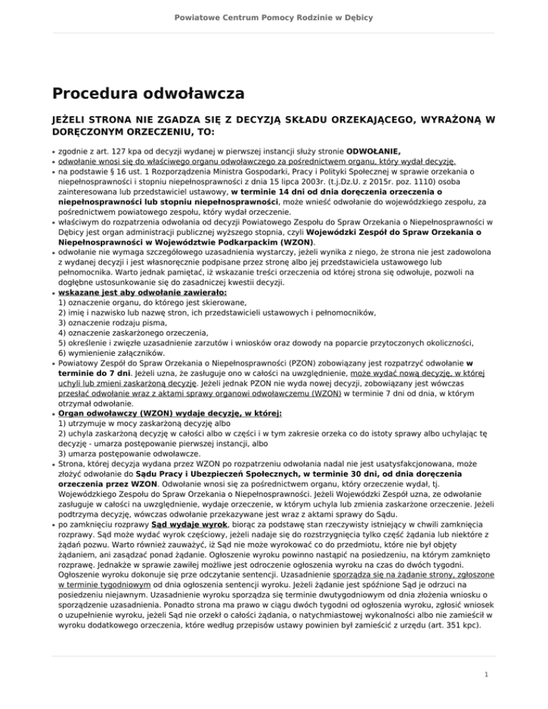 Powiatowe Centrum Pomocy Rodzinie w Dębicy Procedura odwoławcza JEŻELI STRONA NIE ZGADZA SIĘ Z DECYZJĄ SKŁADU ORZEKAJĄCEGO, WYRAŻONĄ W DORĘCZONYM ORZECZENIU, TO: ● ● ● ● ● ● ● ● ● ● zgodnie z art. 127 kpa od decyzji wydanej w pierwszej instancji służy stronie ODWOŁANIE, odwołanie wnosi się do właściwego organu odwoławczego za pośrednictwem organu, który wydał decyzję. na podstawie § 16 ust. 1 Rozporządzenia Ministra Gospodarki, Pracy i Polityki Społecznej w sprawie orzekania o niepełnosprawności i stopniu niepełnosprawności z dnia 15 lipca 2003r. (t.j.Dz.U. z 2015r. poz. 1110) osoba zainteresowana lub przedstawiciel ustawowy, w terminie 14 dni od dnia doręczenia orzeczenia o niepełnosprawności lub stopniu niepełnosprawności, może wnieść odwołanie do wojewódzkiego zespołu, za pośrednictwem powiatowego zespołu, który wydał orzeczenie. właściwym do rozpatrzenia odwołania od decyzji Powiatowego Zespołu do Spraw Orzekania o Niepełnosprawności w Dębicy jest organ administracji publicznej wyższego stopnia, czyli Wojewódzki Zespół do Spraw Orzekania o Niepełnosprawności w Województwie Podkarpackim (WZON). odwołanie nie wymaga szczegółowego uzasadnienia wystarczy, jeżeli wynika z niego, że strona nie jest zadowolona z wydanej decyzji i jest własnoręcznie podpisane przez stronę albo jej przedstawiciela ustawowego lub pełnomocnika. Warto jednak pamiętać, iż wskazanie treści orzeczenia od której strona się odwołuje, pozwoli na dogłębne ustosunkowanie się do zasadniczej kwestii decyzji. wskazane jest aby odwołanie zawierało: 1) oznaczenie organu, do którego jest skierowane, 2) imię i nazwisko lub nazwę stron, ich przedstawicieli ustawowych i pełnomocników, 3) oznaczenie rodzaju pisma, 4) oznaczenie zaskarżonego orzeczenia, 5) określenie i zwięzłe uzasadnienie zarzutów i wniosków oraz dowody na poparcie przytoczonych okoliczności, 6) wymienienie załączników. Powiatowy Zespół do Spraw Orzekania o Niepełnosprawności (PZON) zobowiązany jest rozpatrzyć odwołanie w terminie do 7 dni. Jeżeli uzna, że zasługuje ono w całości na uwzględnienie, może wydać nową decyzję, w której uchyli lub zmieni zaskarżoną decyzję. Jeżeli jednak PZON nie wyda nowej decyzji, zobowiązany jest wówczas przesłać odwołanie wraz z aktami sprawy organowi odwoławczemu (WZON) w terminie 7 dni od dnia, w którym otrzymał odwołanie. Organ odwoławczy (WZON) wydaje decyzję, w której: 1) utrzymuje w mocy zaskarżoną decyzję albo 2) uchyla zaskarżoną decyzję w całości albo w części i w tym zakresie orzeka co do istoty sprawy albo uchylając tę decyzję - umarza postępowanie pierwszej instancji, albo 3) umarza postępowanie odwoławcze. Strona, której decyzja wydana przez WZON po rozpatrzeniu odwołania nadal nie jest usatysfakcjonowana, może złożyć odwołanie do Sądu Pracy i Ubezpieczeń Społecznych, w terminie 30 dni, od dnia doręczenia orzeczenia przez WZON. Odwołanie wnosi się za pośrednictwem organu, który orzeczenie wydał, tj. Wojewódzkiego Zespołu do Spraw Orzekania o Niepełnosprawności. Jeżeli Wojewódzki Zespół uzna, ze odwołanie zasługuje w całości na uwzględnienie, wydaje orzeczenie, w którym uchyla lub zmienia zaskarżone orzeczenie. Jeżeli podtrzyma decyzję, wówczas odwołanie przekazywane jest wraz z aktami sprawy do Sądu. po zamknięciu rozprawy Sąd wydaje wyrok, biorąc za podstawę stan rzeczywisty istniejący w chwili zamknięcia rozprawy. Sąd może wydać wyrok częściowy, jeżeli nadaje się do rozstrzygnięcia tylko część żądania lub niektóre z żądań pozwu. Warto również zauważyć, iż Sąd nie może wyrokować co do przedmiotu, które nie był objęty żądaniem, ani zasądzać ponad żądanie. Ogłoszenie wyroku powinno nastąpić na posiedzeniu, na którym zamknięto rozprawę. Jednakże w sprawie zawiłej możliwe jest odroczenie ogłoszenia wyroku na czas do dwóch tygodni. Ogłoszenie wyroku dokonuje się prze odczytanie sentencji. Uzasadnienie sporządza się na żądanie strony, zgłoszone w terminie tygodniowym od dnia ogłoszenia sentencji wyroku. Jeżeli żądanie jest spóźnione Sąd je odrzuci na posiedzeniu niejawnym. Uzasadnienie wyroku sporządza się terminie dwutygodniowym od dnia złożenia wniosku o sporządzenie uzasadnienia. Ponadto strona ma prawo w ciągu dwóch tygodni od ogłoszenia wyroku, zgłosić wniosek o uzupełnienie wyroku, jeżeli Sąd nie orzekł o całości żądania, o natychmiastowej wykonalności albo nie zamieścił w wyroku dodatkowego orzeczenia, które według przepisów ustawy powinien był zamieścić z urzędu (art. 351 kpc). 1 Powiatowe Centrum Pomocy Rodzinie w Dębicy Postępowanie przed sądem jest wolne od opłat sądowych!!! UWAGA!!! Należy pamiętać, że wniesienie odwołania wstrzymuje wykonanie decyzji. 2
