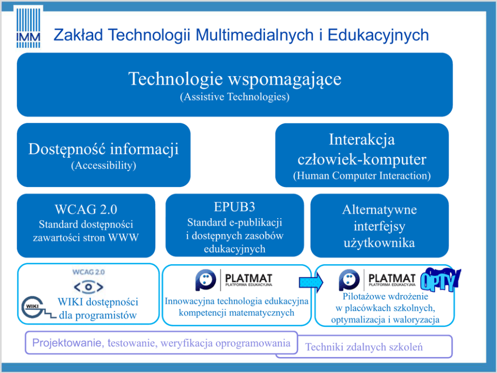 Zakład Technologii Multimedialnych i Edukacyjnych Technologie wspomagające (Assistive Technologies) Interakcja człowiek-komputer Dostępność informacji (Accessibility) (Human Computer Interaction) WCAG 2.0 WCAG 2.0 Standard dostępności Standard dostępności zawartości stron WWW WWW WIKI dostępności dla programistów EPUB3 Standard e-publikacji EPUB3 Alternatywne Alternatywne interfejsy interfejsy użytkownika użytkownika i dostępnych zasobów Standard e-publikacji edukacyjnych Innowacyjna technologia edukacyjna kompetencji matematycznych Projektowanie, testowanie, weryfikacja oprogramowania Pilotażowe wdrożenie w placówkach szkolnych, optymalizacja i waloryzacja Techniki zdalnych szkoleń Zakład Technologii Multimedialnych i Edukacyjnych Systemy dla MŚP e-Handel e-Usługi e-Szkolenia inne e-Sklepy e-Zamówienia e-Zarządzanie szk. Systemy dla niewidomych e-Aukcje e-Hotel Transmisja szk. Systemy sterowania