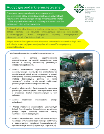 Audyt gospodarki energetycznej Oferujemy przeprowadzenie audytu gospodarki energetycznej, który przedstawi możliwości optymalnych rozwiązań w zakresie racjonalnego wykorzystania energii i paliw w przedsiębiorstwie, a także ograniczenia kosztów związanych z ich wykorzystaniem. Zestaw działań określonych w audycie może dotyczyć zarówno całego zakładu jak również wymaganego zakresu ustalonego z Zamawiającym. Audyt uwzględnia aspekty, energetyczne, ekonomiczne jak również ekologiczne. Zespół inżynierów zapewnia doradztwo w zakresie doboru technologii oraz wdrożenia inwestycji poprawiających efektywność energetyczną przedsiębiorstwa. Możliwy zakres audytu gospodarki energetycznej to: Analiza w zakresie zapotrzebowania przedsiębiorstwa na nośniki energetyczne oraz kierunki i sposoby modernizacji posiadanych układów energetycznych. Analiza efektywności wykorzystania energii, nośników energii i mediów (w tym analiza faktur za nośniki energii, dobór mocy zamówionej w energii elektrycznej, pomiary pobieranej mocy elektrycznej metodą bezinwazyjną, pomiary w stanie „zerowym”, analiza zużycia energii elektrycznej przez największe odbiory tego nośnika itp.) Analiza efektywności funkcjonowania systemów grzewczych, wentylacyjnych i klimatyzacyjnych wraz z propozycją działań modernizacyjnych w tym zakresie. Analiza możliwości wykorzystania energii odpadowej. Analiza możliwości wykorzystania Odnawialnych Źródeł Energii (ogniwa fotowoltaiczne, powietrzne pompy ciepła, kolektory słoneczne, turbiny wiatrowe i innych dostępnych) Analiza optymalizacyjna zmian infrastrukturalnych w zakresie wytwarzania ciepła i energii elektrycznej z zastosowaniem rozwiązań konwencjonalnych, systemów skojarzonych (kogeneracja, trigeneracja). Audyty energetyczne budynków w zakresie doboru przedsięwzięć termomodernizacyjnych z wykorzystaniem technik termowizyjnych. Analiza możliwości poprawy efektywności systemów oświetlenia. Analiza możliwości poprawy efektywności systemów wytwarzania pary. Analiza zakresu i możliwości zastosowania systemu optymalnego zarządzania dystrybucją energii elektrycznej. Analiza możliwości poprawy efektywności systemu sprężonego powietrza (w tym m.in. pomiar szczelności systemu sprężonego powietrza). Nasze atuty: Wiedza w zakresie możliwości pozyskania finansowania „zewnętrznego” do realizacji przedsięwzięć, także z uwzględnieniem możliwości uzyskania „białych certyfikatów” związanych ze zwiększeniem efektywności energetycznej. Zespół doświadczonych audytorów oraz współpracowników posiadających wiedzę techniczną i ekonomiczną w zakresie efektywności energetycznej. 25 lat doświadczenia w zakresie analiz efektywności energetycznej dla gmin, przedsiębiorstw czy budynków. Uczestnictwo w wielu krajowych i międzynarodowych projektach związanych z racjonalnym gospodarowaniem energią. Doświadczenie zarówno w przygotowywaniu audytów energetycznych, jak również w weryfikacji audytów na zlecenie instytucji dofinansowujących realizację przedsięwzięć. Elastyczność w zakresie merytoryki audytu, w zależności od zidentyfikowanych problemów czy zaleceń. Wykorzystanie metodologii wypracowanej przez FEWE, spójnej z zapisami Międzynarodowego Protokołu Oceny i Weryfikacji Efektywności (IPMVP). Swoboda w wykorzystywaniu narzędzi pomiarowych i badawczych (w tym także narzędzi termowizyjnych) oraz interpretacji wyników. Zapraszamy do współpracy! ul. Rymera 3/4 40-048 Katowice, Poland Tel. & fax: +48 32 203 51 14 Internet: www.fewe.pl e-mail: [email protected]