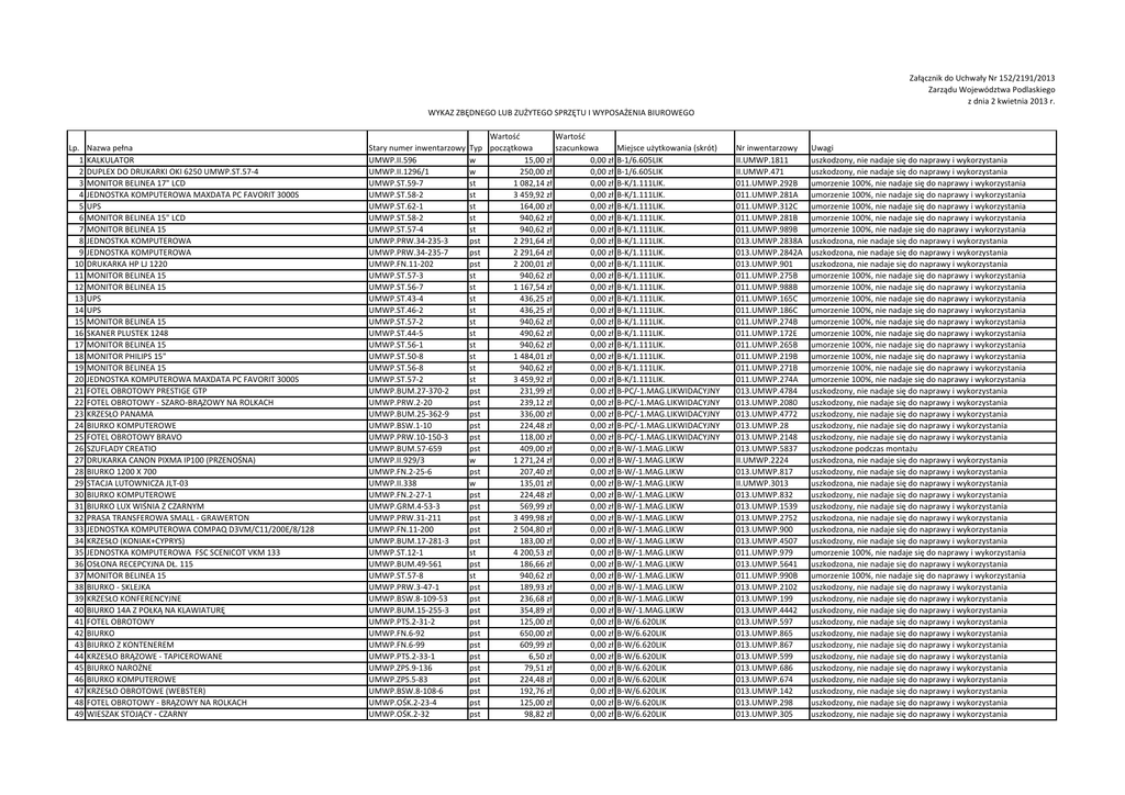 Załącznik do Uchwały Nr 152/2191/2013 Zarządu Województwa Podlaskiego z dnia 2 kwietnia 2013 r. WYKAZ ZBĘDNEGO LUB ZUŻYTEGO SPRZĘTU I WYPOSAŻENIA BIUROWEGO Lp. 1 2 3 4 5 6 7 8 9 10 11 12 13 14 15 16 17 18 19 20 21 22 23 24 25 26 27 28 29 30 31 32 33 34 35 36 37 38 39 40 41 42 43 44 45 46 47 48 49 Nazwa pełna KALKULATOR DUPLEX DO DRUKARKI OKI 6250 UMWP.ST.57-4 MONITOR BELINEA 17" LCD JEDNOSTKA KOMPUTEROWA MAXDATA PC FAVORIT 3000S UPS MONITOR BELINEA 15" LCD MONITOR BELINEA 15 JEDNOSTKA KOMPUTEROWA JEDNOSTKA KOMPUTEROWA DRUKARKA HP LJ 1220 MONITOR BELINEA 15 MONITOR BELINEA 15 UPS UPS MONITOR BELINEA 15 SKANER PLUSTEK 1248 MONITOR BELINEA 15 MONITOR PHILIPS 15" MONITOR BELINEA 15 JEDNOSTKA KOMPUTEROWA MAXDATA PC FAVORIT 3000S FOTEL OBROTOWY PRESTIGE GTP FOTEL OBROTOWY - SZARO-BRĄZOWY NA ROLKACH KRZESŁO PANAMA BIURKO KOMPUTEROWE FOTEL OBROTOWY BRAVO SZUFLADY CREATIO DRUKARKA CANON PIXMA IP100 (PRZENOŚNA) BIURKO 1200 X 700 STACJA LUTOWNICZA JLT-03 BIURKO KOMPUTEROWE BIURKO LUX WIŚNIA Z CZARNYM PRASA TRANSFEROWA SMALL - GRAWERTON JEDNOSTKA KOMPUTEROWA COMPAQ D3VM/C11/200E/8/128 KRZESŁO (KONIAK+CYPRYS) JEDNOSTKA KOMPUTEROWA FSC SCENICOT VKM 133 OSŁONA RECEPCYJNA DŁ. 115 MONITOR BELINEA 15 BIURKO - SKLEJKA KRZESŁO KONFERENCYJNE BIURKO 14A Z POŁKĄ NA KLAWIATURĘ FOTEL OBROTOWY BIURKO BIURKO Z KONTENEREM KRZESŁO BRĄZOWE - TAPICEROWANE BIURKO NAROŻNE BIURKO KOMPUTEROWE KRZESŁO OBROTOWE (WEBSTER) FOTEL OBROTOWY - BRĄZOWY NA ROLKACH WIESZAK STOJĄCY - CZARNY Stary numer inwentarzowy UMWP.II.596 UMWP.II.1296/1 UMWP.ST.59-7 UMWP.ST.58-2 UMWP.ST.62-1 UMWP.ST.58-2 UMWP.ST.57-4 UMWP.PRW.34-235-3 UMWP.PRW.34-235-7 UMWP.FN.11-202 UMWP.ST.57-3 UMWP.ST.56-7 UMWP.ST.43-4 UMWP.ST.46-2 UMWP.ST.57-2 UMWP.ST.44-5 UMWP.ST.56-1 UMWP.ST.50-8 UMWP.ST.56-8 UMWP.ST.57-2 UMWP.BUM.27-370-2 UMWP.PRW.2-20 UMWP.BUM.25-362-9 UMWP.BSW.1-10 UMWP.PRW.10-150-3 UMWP.BUM.57-659 UMWP.II.929/3 UMWP.FN.2-25-6 UMWP.II.338 UMWP.FN.2-27-1 UMWP.GRM.4-53-3 UMWP.PRW.31-211 UMWP.FN.11-200 UMWP.BUM.17-281-3 UMWP.ST.12-1 UMWP.BUM.49-561 UMWP.ST.57-8 UMWP.PRW.3-47-1 UMWP.BSW.8-109-53 UMWP.BUM.15-255-3 UMWP.PTS.2-31-2 UMWP.FN.6-92 UMWP.FN.6-99 UMWP.PTS.2-33-1 UMWP.ZPS.9-136 UMWP.ZPS.5-83 UMWP.BSW.8-108-6 UMWP.OŚK.2-23-4 UMWP.OŚK.2-32 Wartość Wartość Typ początkowa szacunkowa Miejsce użytkowania (skrót) w 15,00 zł 0,00 zł B-1/6.605LIK w 250,00 zł 0,00 zł B-1/6.605LIK st 1 082,14 zł 0,00 zł B-K/1.111LIK. st 3 459,92 zł 0,00 zł B-K/1.111LIK. st 164,00 zł 0,00 zł B-K/1.111LIK. st 940,62 zł 0,00 zł B-K/1.111LIK. st 940,62 zł 0,00 zł B-K/1.111LIK. pst 2 291,64 zł 0,00 zł B-K/1.111LIK. pst 2 291,64 zł 0,00 zł B-K/1.111LIK. pst 2 200,01 zł 0,00 zł B-K/1.111LIK. st 940,62 zł 0,00 zł B-K/1.111LIK. st 1 167,54 zł 0,00 zł B-K/1.111LIK. st 436,25 zł 0,00 zł B-K/1.111LIK. st 436,25 zł 0,00 zł B-K/1.111LIK. st 940,62 zł 0,00 zł B-K/1.111LIK. st 490,62 zł 0,00 zł B-K/1.111LIK. st 940,62 zł 0,00 zł B-K/1.111LIK. st 1 484,01 zł 0,00 zł B-K/1.111LIK. st 940,62 zł 0,00 zł B-K/1.111LIK. st 3 459,92 zł 0,00 zł B-K/1.111LIK. pst 231,99 zł 0,00 zł B-PC/-1.MAG.LIKWIDACYJNY pst 239,12 zł 0,00 zł B-PC/-1.MAG.LIKWIDACYJNY pst 336,00 zł 0,00 zł B-PC/-1.MAG.LIKWIDACYJNY pst 224,48 zł 0,00 zł B-PC/-1.MAG.LIKWIDACYJNY pst 118,00 zł 0,00 zł B-PC/-1.MAG.LIKWIDACYJNY pst 409,00 zł 0,00 zł B-W/-1.MAG.LIKW w 1 271,24 zł 0,00 zł B-W/-1.MAG.LIKW pst 207,40 zł 0,00 zł B-W/-1.MAG.LIKW w 135,01 zł 0,00 zł B-W/-1.MAG.LIKW pst 224,48 zł 0,00 zł B-W/-1.MAG.LIKW pst 569,99 zł 0,00 zł B-W/-1.MAG.LIKW pst 3 499,98 zł 0,00 zł B-W/-1.MAG.LIKW pst 2 504,80 zł 0,00 zł B-W/-1.MAG.LIKW pst 183,00 zł 0,00 zł B-W/-1.MAG.LIKW st 4 200,53 zł 0,00 zł B-W/-1.MAG.LIKW pst 186,66 zł 0,00 zł B-W/-1.MAG.LIKW st 940,62 zł 0,00 zł B-W/-1.MAG.LIKW pst 189,93 zł 0,00 zł B-W/-1.MAG.LIKW pst 236,68 zł 0,00 zł B-W/-1.MAG.LIKW pst 354,89 zł 0,00 zł B-W/-1.MAG.LIKW pst 125,00 zł 0,00 zł B-W/6.620LIK pst 650,00 zł 0,00 zł B-W/6.620LIK pst 609,99 zł 0,00 zł B-W/6.620LIK pst 6,50 zł 0,00 zł B-W/6.620LIK pst 79,51 zł 0,00 zł B-W/6.620LIK pst 224,48 zł 0,00 zł B-W/6.620LIK pst 192,76 zł 0,00 zł B-W/6.620LIK pst 125,00 zł 0,00 zł B-W/6.620LIK pst 98,82 zł 0,00 zł B-W/6.620LIK Nr inwentarzowy II.UMWP.1811 II.UMWP.471 011.UMWP.292B 011.UMWP.281A 011.UMWP.312C 011.UMWP.281B 011.UMWP.989B 013.UMWP.2838A 013.UMWP.2842A 013.UMWP.901 011.UMWP.275B 011.UMWP.988B 011.UMWP.165C 011.UMWP.186C 011.UMWP.274B 011.UMWP.172E 011.UMWP.265B 011.UMWP.219B 011.UMWP.271B 011.UMWP.274A 013.UMWP.4784 013.UMWP.2080 013.UMWP.4772 013.UMWP.28 013.UMWP.2148 013.UMWP.5837 II.UMWP.2224 013.UMWP.817 II.UMWP.3013 013.UMWP.832 013.UMWP.1539 013.UMWP.2752 013.UMWP.900 013.UMWP.4507 011.UMWP.979 013.UMWP.5641 011.UMWP.990B 013.UMWP.2102 013.UMWP.199 013.UMWP.4442 013.UMWP.597 013.UMWP.865 013.UMWP.867 013.UMWP.599 013.UMWP.686 013.UMWP.674 013.UMWP.142 013.UMWP.298 013.UMWP.305 Uwagi uszkodzony, nie nadaje się do naprawy i wykorzystania uszkodzony, nie nadaje się do naprawy i wykorzystania umorzenie 100%, nie nadaje się do naprawy i wykorzystania umorzenie 100%, nie nadaje się do naprawy i wykorzystania umorzenie 100%, nie nadaje się do naprawy i wykorzystania umorzenie 100%, nie nadaje się do naprawy i wykorzystania umorzenie 100%, nie nadaje się do naprawy i wykorzystania uszkodzona, nie nadaje się do naprawy i wykorzystania uszkodzona, nie nadaje się do naprawy i wykorzystania uszkodzona, nie nadaje się do naprawy i wykorzystania umorzenie 100%, nie nadaje się do naprawy i wykorzystania umorzenie 100%, nie nadaje się do naprawy i wykorzystania umorzenie 100%, nie nadaje się do naprawy i wykorzystania umorzenie 100%, nie nadaje się do naprawy i wykorzystania umorzenie 100%, nie nadaje się do naprawy i wykorzystania umorzenie 100%, nie nadaje się do naprawy i wykorzystania umorzenie 100%, nie nadaje się do naprawy i wykorzystania umorzenie 100%, nie nadaje się do naprawy i wykorzystania umorzenie 100%, nie 