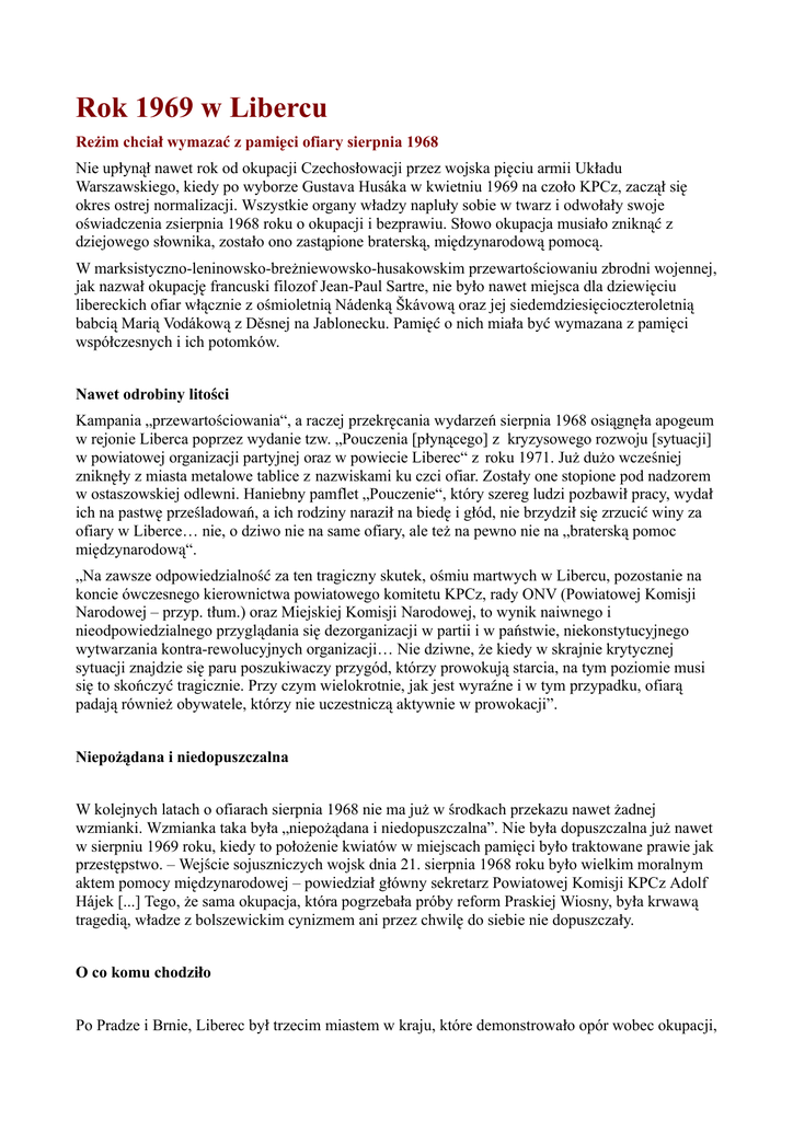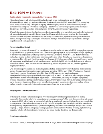 Rok 1969 w Libercu Reżim chciał wymazać z pamięci ofiary sierpnia 1968 Nie upłynął nawet rok od okupacji Czechosłowacji przez wojska pięciu armii Układu Warszawskiego, kiedy po wyborze Gustava Husáka w kwietniu 1969 na czoło KPCz, zaczął się okres ostrej normalizacji. Wszystkie organy władzy napluły sobie w twarz i odwołały swoje oświadczenia zsierpnia 1968 roku o okupacji i bezprawiu. Słowo okupacja musiało zniknąć z dziejowego słownika, zostało ono zastąpione braterską, międzynarodową pomocą. W marksistyczno-leninowsko-breżniewowsko-husakowskim przewartościowaniu zbrodni wojennej, jak nazwał okupację francuski filozof Jean-Paul Sartre, nie było nawet miejsca dla dziewięciu libereckich ofiar włącznie z ośmioletnią Nádenką Škávową oraz jej siedemdziesięcioczteroletnią babcią Marią Vodákową z Děsnej na Jablonecku. Pamięć o nich miała być wymazana z pamięci współczesnych i ich potomków. Nawet odrobiny litości Kampania „przewartościowania“, a raczej przekręcania wydarzeń sierpnia 1968 osiągnęła apogeum w rejonie Liberca poprzez wydanie tzw. „Pouczenia [płynącego] z kryzysowego rozwoju [sytuacji] w powiatowej organizacji partyjnej oraz w powiecie Liberec“ z roku 1971. Już dużo wcześniej zniknęły z miasta metalowe tablice z nazwiskami ku czci ofiar. Zostały one stopione pod nadzorem w ostaszowskiej odlewni. Haniebny pamflet „Pouczenie“, który szereg ludzi pozbawił pracy, wydał ich na pastwę prześladowań, a ich rodziny naraził na biedę i głód, nie brzydził się zrzucić winy za ofiary w Liberce… nie, o dziwo nie na same ofiary, ale też na pewno nie na „braterską pomoc międzynarodową“. „Na zawsze odpowiedzialność za ten tragiczny skutek, ośmiu martwych w Libercu, pozostanie na koncie ówczesnego kierownictwa powiatowego komitetu KPCz, rady ONV (Powiatowej Komisji Narodowej – przyp. tłum.) oraz Miejskiej Komisji Narodowej, to wynik naiwnego i nieodpowiedzialnego przyglądania się dezorganizacji w partii i w państwie, niekonstytucyjnego wytwarzania kontra-rewolucyjnych organizacji… Nie dziwne, że kiedy w skrajnie krytycznej sytuacji znajdzie się paru poszukiwaczy przygód, którzy prowokują starcia, na tym poziomie musi się to skończyć tragicznie. Przy czym wielokrotnie, jak jest wyraźne i w tym przypadku, ofiarą padają również obywatele, którzy nie uczestniczą aktywnie w prowokacji”. Niepożądana i niedopuszczalna W kolejnych latach o ofiarach sierpnia 1968 nie ma już w środkach przekazu nawet żadnej wzmianki. Wzmianka taka była „niepożądana i niedopuszczalna”. Nie była dopuszczalna już nawet w sierpniu 1969 roku, kiedy to położenie kwiatów w miejscach pamięci było traktowane prawie jak przestępstwo. – Wejście sojuszniczych wojsk dnia 21. sierpnia 1968 roku było wielkim moralnym aktem pomocy międzynarodowej – powiedział główny sekretarz Powiatowej Komisji KPCz Adolf Hájek [...] Tego, że sama okupacja, która pogrzebała próby reform Praskiej Wiosny, była krwawą tragedią, władze z bolszewickim cynizmem ani przez chwilę do siebie nie dopuszczały. O co komu chodziło Po Pradze i Brnie, Liberec był trzecim miastem w kraju, które demonstrowało opór wobec okupacji, a w sierpniu 1969 otwarcie wystąpiło przeciw ustalonej polityce Centralnego Komitetu KPCz. Do sprowokowania tych wydarzeń zmierzały przygotowania StB (czeskie Służby Bezpieczeństwa – przyp. tłum.). [...] Wszystko wskazuje na to, że obok siebie funkcjonowały dwa sztaby z różnymi zadaniami: jedna komisja koordynująca i jedna nadzwyczajna, które przygotowywały agentów i prowokatorów zamieszek, co uzasadniłoby interwencję jednostek zbrojnych. Chodziło o „sprowokowanie jak najpoważniejszej akcji, która nie tylko wytłumaczyłaby masową i ostrą interwencję, ale dzięki udowodnieniu u nas istnienia kontra-rewolucji, zdobyła pełną zasadność ‘braterskiej pomocy’! Stąd ZSRR przykładało do niej tak wielką wagę. Gwarantem akcji był naczelnik StB… Jednocześnie jednak z przygotowaniami prowokacji we wszystkich organach przebiegało przygotowanie środków, które miałyby zapobiec masowym akcjom 21.8.1969” (Kronika wydarzeń 1968-1971 dla tzw. Komisji Menzla). Już 5. sierpnia kierownictwo powiatowej komisji KPCz w libereckiej gazecie Vpřed drukuje odezwę do wszystkich obywateli: „Trzeba zapobiec strzałom, ekstremalnym akcjom, nieroztropnym postępowaniom – pomóżcie w sierpniowych dniach zapewnić porządek, spokój i bezpieczeństwo wszystkich obywateli naszego powiatu! […]”. Niepokój wisiał w powietrzu W ostatniej chwili, 19. sierpnia, Vpřed drukuje (analogiczną) odezwę do „Obywateli regionu Liberca“, kierownictwa powiatowej komisji Frontu Narodowego i rady ONV w Libercu. Mówi ona między innymi o tym, że „w powiecie odkryto kilka prób nielegalnej dystrybucji ulotek, różnych haseł, instrukcji, osobistej perswazji i innych różnych sposobów wywoływania nieporządku”. Do odezwy na pierwszej stronie Vpředu pod tytułem „Spokój i porządek – gwarancja konsolidacji” dołączyły się również niektóre firmy i fabryki [...]. Opinię podpisuje też kierownictwo KPCz i ROH (Revoluční odborové hnutí – Rewolucyjny Ruch Specjalistyczny – przyp. tłum.) oraz dyrektorzy, a najczęściej pojawiające się w niej słowa to „nie dopuśćcie, nie pozwólcie, skazujemy”. Tego dnia we wtorek zebrało się nadzwyczajne posiedzenie rady ONV. O tym, czego dowiedział się od aktywu funkcjonariuszy w Usti nad Łabą, w którym udział wzięło ponad 1200 osób, a przemawiał na nim sam Jozef Lenárt, informował sekretarz ONV Josef Peci. Na przykład o tym, że dochodzi do rozkradania broni, i to w naszej armii, że w ČSSR jest ponad tysiąc emigrantów z zagranicy, że z Pragi są rozsyłane ulotki, że sowieccy turyści są napadani, a komisje narodowe niech lepiej uważają na studentów i sz