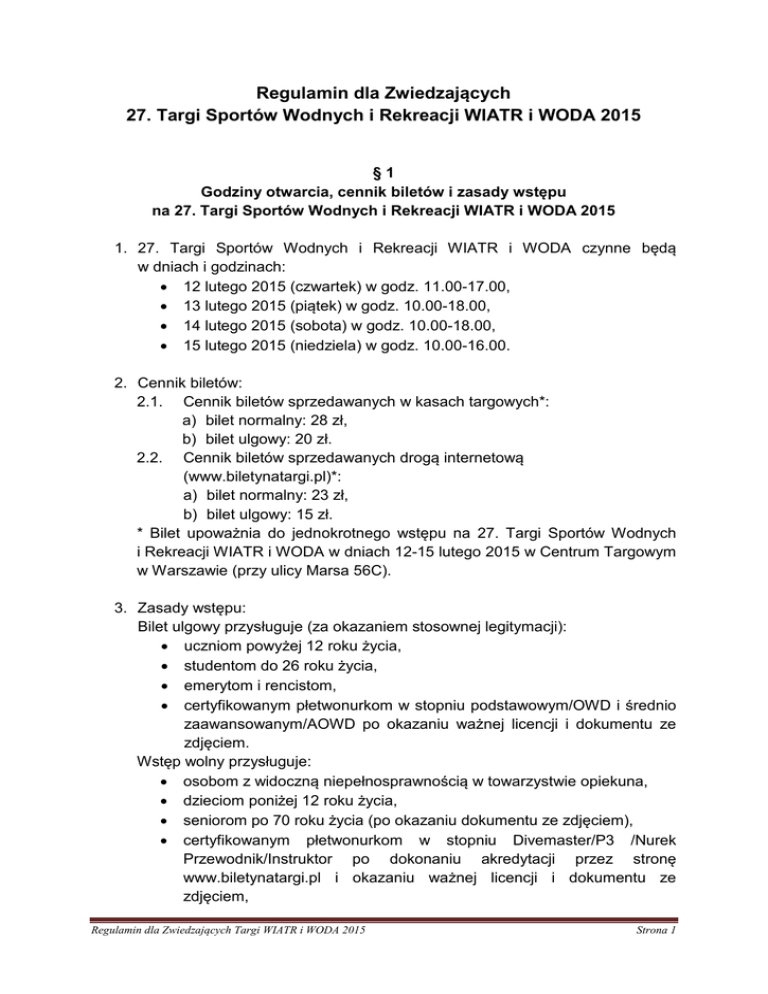 Regulamin dla Zwiedzających 27. Targi Sportów Wodnych i Rekreacji WIATR i WODA 2015 §1 Godziny otwarcia, cennik biletów i zasady wstępu na 27. Targi Sportów Wodnych i Rekreacji WIATR i WODA 2015 1. 27. Targi Sportów Wodnych i Rekreacji WIATR i WODA czynne będą w dniach i godzinach: • 12 lutego 2015 (czwartek) w godz. 11.00-17.00, • 13 lutego 2015 (piątek) w godz. 10.00-18.00, • 14 lutego 2015 (sobota) w godz. 10.00-18.00, • 15 lutego 2015 (niedziela) w godz. 10.00-16.00. 2. Cennik biletów: 2.1. Cennik biletów sprzedawanych w kasach targowych*: a) bilet normalny: 28 zł, b) bilet ulgowy: 20 zł. 2.2. Cennik biletów sprzedawanych drogą internetową (www.biletynatargi.pl)*: a) bilet normalny: 23 zł, b) bilet ulgowy: 15 zł. * Bilet upoważnia do jednokrotnego wstępu na 27. Targi Sportów Wodnych i Rekreacji WIATR i WODA w dniach 12-15 lutego 2015 w Centrum Targowym w Warszawie (przy ulicy Marsa 56C). 3. Zasady wstępu: Bilet ulgowy przysługuje (za okazaniem stosownej legitymacji): • uczniom powyżej 12 roku życia, • studentom do 26 roku życia, • emerytom i rencistom, • certyfikowanym płetwonurkom w stopniu podstawowym/OWD i średnio zaawansowanym/AOWD po okazaniu ważnej licencji i dokumentu ze zdjęciem. Wstęp wolny przysługuje: • osobom z widoczną niepełnosprawnością w towarzystwie opiekuna, • dzieciom poniżej 12 roku życia, • seniorom po 70 roku życia (po okazaniu dokumentu ze zdjęciem), • certyfikowanym płetwonurkom w stopniu Divemaster/P3 /Nurek Przewodnik/Instruktor po dokonaniu akredytacji przez stronę www.biletynatargi.pl i okazaniu ważnej licencji i dokumentu ze zdjęciem, Regulamin dla Zwiedzających Targi WIATR i WODA 2015 Strona 1 • dziennikarzom po dokonaniu akredytacji przez stronę www.biletynatargi.pl i okazaniu na Targach legitymacji prasowej lub imiennej wizytówki potwierdzającej pracę / współpracę z redakcją. §2 Przepisy porządkowe 1. Bilet upoważnia do wstępu na Targi tylko z opaską identyfikacyjną, wydawaną przez organizatora przy wejściu na Targi. 2. Kolor opaski zmienia się każdego dnia Targów. 3. Zwiedzający mogą przebywać na terenie Targów tylko w terminach i godzinach otwarcia Targów. 4. Fotografowanie, filmowanie stoisk i eksponatów w celach niekomercyjnych wymaga uprzedniej zgody użytkownika stoiska tj. uczestnika Targów (wystawcy) lub organizatora. 5. Zabronione jest prowadzenie przez Zwiedzających jakichkolwiek działań komercyjnych, akwizycyjnych, reklamowych, promocyjnych, a także agitacyjnych oraz zbiórek pieniężnych nieuzgodnionych z Murator EXPO sp. z o.o., jak również działań niezgodnych z obowiązującymi przepisami prawa. 6. Na terenie Targów obowiązują zakazy: a) wnoszenia i używania broni, amunicji i materiałów pirotechnicznych oraz szkodliwych substancji chemicznych, a także ognia otwartego, stanowiących zagrożenie pożarowe, uszkodzenia mienia oraz stwarzających niebezpieczeństwo dla zdrowia i życia osób, b) wnoszenia i spożywania alkoholu oraz rozprowadzania i zażywania środków odurzających, c) zakłócania porządku publicznego (np. głośne, agresywne zachowanie), d) wprowadzania zwierząt, a także rowerów, deskorolek itp., e) palenia wyrobów tytoniowych, z wyjątkiem miejsc wydzielonych i specjalnie oznaczonych, f) zanieczyszczania pawilonów i terenów otwartych odpadami wygenerowanymi przez siebie (opakowania po napojach i jedzeniu, niedopałki, gumy do żucia itp.), g) niszczenia infrastruktury (np. oklejanie ścian, szyb, posadzek ulotkami reklamowymi oraz innymi materiałami), h) opierania się o elementy zabudowy stoisk, konstrukcje reklamowe i inne elementy aranżacji przestrzeni. 7. Osoby będące w stanie wyraźnego odurzenia narkotykowego lub upojenia alkoholowego oraz próbujące wnieść alkohol, środki odurzające lub niebezpieczne przedmioty, nie będą wpuszczane na teren Targów. 8. W razie nieprzestrzegania w/w zakazów Murator EXPO sp. z o.o. zastrzega sobie prawo natychmiastowego wyprowadzenia Zwiedzającego z terenu Regulamin dla Zwiedzających Targi WIATR i WODA 2015 Strona 2 Targów i uniemożliwienia ponownego przypadkach wezwania Policji. wstępu, a w uzasadnionych §3 Zobowiązania Zwiedzających Zwiedzający są zobowiązani do: a. respektowania oznaczeń stref wydzielonych z ruchu podlegających ochronie przeciwpożarowej, b. wykonywania poleceń porządkowych wydawanych przez służby organizatora ze względów organizacyjnych albo konieczności zabezpieczenia mienia i zapewnienia bezpieczeństwa osób przebywających na terenie Targów, c. przestrzegania przepisów o ruchu drogowym, które obowiązują w strefie ruchu na terenie Targów. §4 Postanowienia końcowe Organizator zastrzega możliwość rejestracji przebiegu Targów (za pomocą urządzeń utrwalających obraz i/lub dźwięk). W związku z tym osoby przebywające na terenie Targów, poprzez fakt uczestnictwa w Targach, stosownie do postanowień art. 81 ustawy z dnia 4 lutego 1994 r. o prawie autorskim i prawach pokrewnych, wyrażają zgodę, bez dodatkowego wynagrodzenia, na utrwalanie, wykorzystywanie i rozpowszechnianie swojego wizerunku stanowiącego szczegół całości, w celach dokumentacyjnych, promocyjnych i edukacyjnych, bez ograniczeń czasowych i terytorialnych w materiałach reklamowych organizatora, w szczególności w reklamach zewnętrznych, reklamach prasowych, Internecie, a także w celu produkcji i prezentowania zapisów foto, wideo i audio z Targów i/lub każdego elementu wydarzenia w przekazach medialnych na całym świecie. Jednocześnie każdy uczestnik Targów może zastrzec wobec organizatora brak wyrażenia takiej zgody. Regulamin dla Zwiedzających Targi WIATR i WODA 2015 Strona 3