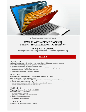 KONFERENCJA OGÓLNOPOLSKIEGO SYSTEMU OCHRONY ZDROWIA W RAMACH TARGÓW MEDYCZNYCH SALMED 2014 IT W PLACÓWCE MEDYCZNEJ NOWOŚCI – SYTUACJA PRAWNA – PERSPEKTYWY 11 luty 2014 r. (wtorek) Międzynarodowe Targi Poznańskie | Hala nr 7 (antresola) SESJA A 10.00-10.30 Ogólnopolski System Ochrony Zdrowia – stan obecny i kierunki dalszego rozwoju. Zygmunt Kamiński / Ogólnopolski System Ochrony Zdrowia podsumowanie dotychczasowego rozwoju OSOZ, leczenie naprawcze, czy projektowanie zdrowia – Model Zdrowotny Pacjenta, nowe projekty dla e-zdrowia i m-zdrowia, aktywizacja pacjentów w obszarze zdrowia. 10.35-11.05 Informatyzacja rynku zdrowia - Ministerstwo Zdrowia, NFZ, ZUS. Rafał Kozioł, Artur Pyrek / KAMSOFT S.A. plany Ministerstwa Zdrowia i NFZ dot. procesów informatyzacji, zmiany ustawowe, stan rozwoju projektu P1, ZIP i eWUŚ, nowe zasady kontraktowania i rozliczeń świadczeń medycznych, elektroniczna recepta, skierowanie, zwolnienie. 11.10-11.40 Wspomaganie zdrowia na platformie OSOZ. Paweł Błaszczyk / KAMSOFT S.A. rejestracja elektroniczna, programy zdrowotne oraz lojalnościowe, komunikaty zdrowotne SMS, serwisy dla społeczeństwa. 11.40-12.10 PRZERWA – POCZĘSTUNEK DLA GOŚCI. SESJA B 12.10-12.50 IT jako element budowy strategicznej przewagi konkurencyjnej. Piotr Krząkała, Krzysztof Błasiak / KAMSOFT S.A. nowoczesne systemy i metody zarzadzania przedsiębiorstwami medycznymi, elementy środowiska IT budujące przewagę konkurencyjną, w jaki sposób prowadzić e-dokumentację medyczną zgodnie z wymaganiami prawnymi, aktualizacja informacji, bezpieczeństwo danych medycznych – przetwarzanie danych osobowych w służbie zdrowia. 12.55-13.25 Informatyzacja rynku zdrowia w praktyce – od pomysłu do realizacji. Andrzej Witek / Grupa Kapitałowa Centermed blaski i cienie informatyzacji placówki medycznej, początkowe koszty i końcowe efekty w liczbach, dokumentacja elektroniczna i podstawowe korzyści, komunikacja elektroniczna z otoczeniem – e-rejestracja, e-recepta, e-skierowanie, końcowe opinie początkowych sceptyków. 13.30-14.00 Dodatkowe Ubezpieczenia Zdrowotne – fanaberia czy konieczność? Xenia Kruszewska / Towarzystwo Ubezpieczeń ZDROWIE S.A. problemy finansowania opieki zdrowotnej w modelu dotychczasowym, aktualna wielkość rynku ubezpieczeń dodatkowych w liczbach, system OLS jako przykład elektronicznej likwidacji szkód, w czasie rzeczywistym, oferta ubezpieczeniowa dla rynku – polisa zdrowotna i polisa lekowa w praktyce. 14.00-14.20 Podsumowanie konferencji – dyskusja, wnioski. Artur Olesch / Czasopismo OSOZ 14.20 Losowanie nagród wśród uczestników konferencji Konsultacje indywidualne na stoisku KAMSOFT S.A. / OSOZ