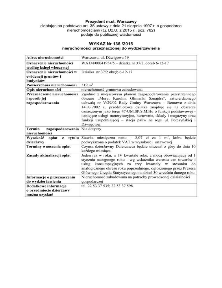 Prezydent m.st. Warszawy działając na podstawie art. 35 ustawy z dnia 21 sierpnia 1997 r. o gospodarce nieruchomościami (t.j. Dz.U. z 2015 r., poz. 782) podaje do publicznej wiadomości WYKAZ Nr 135 /2015 nieruchomości przeznaczonej do wydzierżawienia Adres nieruchomości Oznaczenie nieruchomości według księgi wieczystej Oznaczenie nieruchomości w ewidencji gruntów i budynków Powierzchnia nieruchomości Opis nieruchomości Przeznaczenie nieruchomości i sposób jej zagospodarowania Warszawa, ul. Dźwigowa 59 WA1M/00041954/5 – działka nr 37/2, obręb 6-12-17 Działka nr 37/2 obręb 6-12-17 319 m2 nieruchomość gruntowa zabudowana Zgodnie z miejscowym planem zagospodarowania przestrzennego obszaru „Mory, Karolin, Glinianki Sznajdra”, zatwierdzonego uchwałą nr V/29/02 Rady Gminy Warszawa – Bemowo z dnia 14.03.2002 r., przedmiotowa działka znajduje się na obszarze oznaczonym jako teren 47-UM.SP.S.M.Hu o funkcji podstawowej istniejące usługi motoryzacyjne, hurtownie, składy i magazyny oraz funkcji uzupełniającej – stacja paliw na rogu ul. Połczyńskiej i Dźwigowej. Termin zagospodarowania Nie dotyczy nieruchomości Wysokość opłat z tytułu Stawka miesięczna netto – 8,07 zł za 1 m2, która będzie podwyższona o podatek VAT w wysokości ustawowej dzierżawy Czynsz dzierżawny Dzierżawca będzie uiszczał z góry do dnia 10 Terminy wnoszenia opłat każdego miesiąca. Jeden raz w roku, w IV kwartale roku, z mocą obowiązującą od 1 Zasady aktualizacji opłat stycznia następnego roku - wg wskaźnika wzrostu cen towarów i usług konsumpcyjnych za trzy kwartały w stosunku do analogicznego okresu roku poprzedniego, ogłoszonego przez Prezesa Głównego Urzędu Statystycznego na dzień 30 września danego roku Nieruchomość zabudowana na potrzeby prowadzonej działalności Informacje o przeznaczeniu gospodarczej do wydzierżawienia tel. 22 53 37 535; 22 53 37 598. Dodatkowe informacje o przedmiocie dzierżawy można uzyskać
