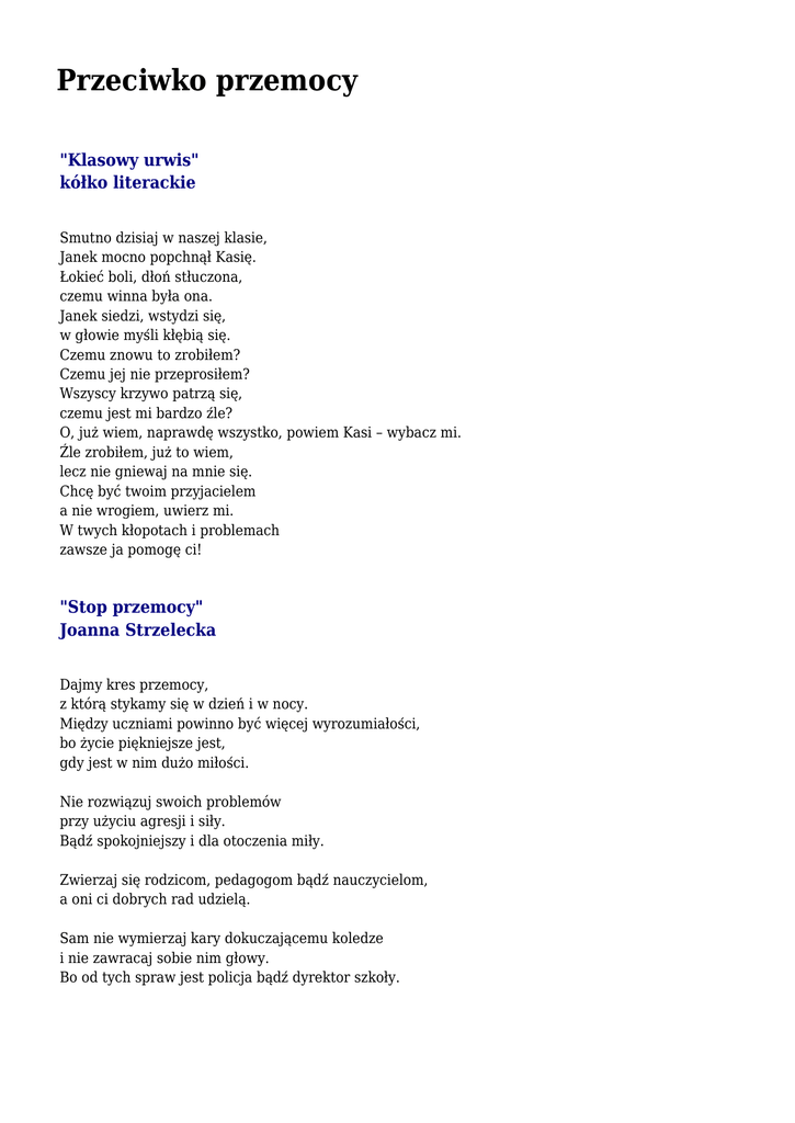 Przeciwko przemocy "Klasowy urwis" kółko literackie Smutno dzisiaj w naszej klasie, Janek mocno popchnął Kasię. Łokieć boli, dłoń stłuczona, czemu winna była ona. Janek siedzi, wstydzi się, w głowie myśli kłębią się. Czemu znowu to zrobiłem? Czemu jej nie przeprosiłem? Wszyscy krzywo patrzą się, czemu jest mi bardzo źle? O, już wiem, naprawdę wszystko, powiem Kasi – wybacz mi. Źle zrobiłem, już to wiem, lecz nie gniewaj na mnie się. Chcę być twoim przyjacielem a nie wrogiem, uwierz mi. W twych kłopotach i problemach zawsze ja pomogę ci! "Stop przemocy" Joanna Strzelecka Dajmy kres przemocy, z którą stykamy się w dzień i w nocy. Między uczniami powinno być więcej wyrozumiałości, bo życie piękniejsze jest, gdy jest w nim dużo miłości. Nie rozwiązuj swoich problemów przy użyciu agresji i siły. Bądź spokojniejszy i dla otoczenia miły. Zwierzaj się rodzicom, pedagogom bądź nauczycielom, a oni ci dobrych rad udzielą. Sam nie wymierzaj kary dokuczającemu koledze i nie zawracaj sobie nim głowy. Bo od tych spraw jest policja bądź dyrektor szkoły. "O przemocy" Iza Hanycz Przemoc to pokazywanie swojej słabości, odkrywanie swojej kultury w całej okazałości. Przemoc to brak szacunku dla ludzkiego gatunku. Przemoc to agresji wywoływanie i brak szacunku dla bliźnich pokazywanie. Więc jeśli człowiekiem chcesz się nazywać odstaw bijatyki i zacznij się zachowywać, bo na razie przykładu nie dajesz wcale, a narodowi i swej rodzinie uprzykrzasz życie całe. Jeśli Polakiem chcesz być prawdziwym, bądź: miłym, grzecznym i uczciwym. A na pewno zyskasz przyjaciół wielu, bo będziesz godny pochwał, obywatelu. "Prezent" Dominika Kulbat Każdy dla kogo ty będziesz grzeczny, da ci prezent bajeczny, będzie o Tobie pamiętał w dzień zwykły, jak również i w święta. "Przyjaciele" Artur Patura Lepiej mieć przyjaciół miłych, nie używać swojej siły. Wolę bawić się i śmiać, niż do domu szybko gnać "Uśmiech jest dobry na co dzień" Kółko literackie Zgodnie się bawić to wielka jest sztuka, Pamiętaj kolego to ważna nauka. By rówieśnicy byli wokół ciebie, myśl dobrze o innych, bądź ich przyjacielem. Pomagaj, gdy możesz, pocieszaj gdy umiesz a nigdy nie zgubisz swych przyjaciół w tłumie. "Kajtek" Weronika Ćwiklińska Gdy Kajtek z kolegami w piłkę grał wesoło, nagle złość ogromna zatańczyła wkoło. Piłka do kolegów dwóch naraz pognała i wybrać jednego długo nie umiała. Całe zamieszanie nie było miłe wcale, zabawa się skończyła a miało być wspaniale. "Nienawiść do agresji" Natalia Dmowska Agresjo, nie chcemy cię w naszej szkole! Płyń sobie hen, hen za morze! Za morza głębokie, za morza szerokie. I już nie wracaj we dnie i w noce. "Nie bądź obojętny" Małgosia Roksela Kiedy krzywdzą kogoś, nie stój obojętnie obok. Głośno krzycz, biegnij po pomoc. Wspólnie razem będziemy silniejsi niż przemoc.