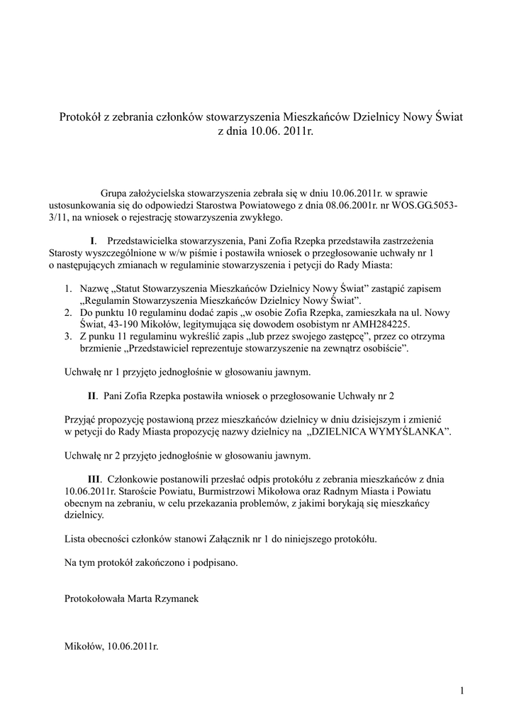 Protokół z zebrania członków stowarzyszenia Mieszkańców Dzielnicy Nowy Świat z dnia 10.06. 2011r. Grupa założycielska stowarzyszenia zebrała się w dniu 10.06.2011r. w sprawie ustosunkowania się do odpowiedzi Starostwa Powiatowego z dnia 08.06.2001r. nr WOS.GG.50533/11, na wniosek o rejestrację stowarzyszenia zwykłego. I. Przedstawicielka stowarzyszenia, Pani Zofia Rzepka przedstawiła zastrzeżenia Starosty wyszczególnione w w/w piśmie i postawiła wniosek o przegłosowanie uchwały nr 1 o następujących zmianach w regulaminie stowarzyszenia i petycji do Rady Miasta: 1. Nazwę „Statut Stowarzyszenia Mieszkańców Dzielnicy Nowy Świat” zastąpić zapisem „Regulamin Stowarzyszenia Mieszkańców Dzielnicy Nowy Świat”. 2. Do punktu 10 regulaminu dodać zapis „w osobie Zofia Rzepka, zamieszkała na ul. Nowy Świat, 43-190 Mikołów, legitymująca się dowodem osobistym nr AMH284225. 3. Z punku 11 regulaminu wykreślić zapis „lub przez swojego zastępcę”, przez co otrzyma brzmienie „Przedstawiciel reprezentuje stowarzyszenie na zewnątrz osobiście”. Uchwałę nr 1 przyjęto jednogłośnie w głosowaniu jawnym. II. Pani Zofia Rzepka postawiła wniosek o przegłosowanie Uchwały nr 2 Przyjąć propozycję postawioną przez mieszkańców dzielnicy w dniu dzisiejszym i zmienić w petycji do Rady Miasta propozycję nazwy dzielnicy na „DZIELNICA WYMYŚLANKA”. Uchwałę nr 2 przyjęto jednogłośnie w głosowaniu jawnym. III. Członkowie postanowili przesłać odpis protokółu z zebrania mieszkańców z dnia 10.06.2011r. Staroście Powiatu, Burmistrzowi Mikołowa oraz Radnym Miasta i Powiatu obecnym na zebraniu, w celu przekazania problemów, z jakimi borykają się mieszkańcy dzielnicy. Lista obecności członków stanowi Załącznik nr 1 do niniejszego protokółu. Na tym protokół zakończono i podpisano. Protokołowała Marta Rzymanek Mikołów, 10.06.2011r. 1 Uchwała nr 1 z dnia 10.06.2011r. Stowarzyszenia Mieszkańców Dzielnicy Nowy Świat 1. Nazwę „Statut Stowarzyszenia Mieszkańców Dzielnicy Nowy Świat” zastąpić zapisem „Regulamin Stowarzyszenia Mieszkańców Dzielnicy Nowy Świat”. 2. Do punktu 10 regulaminu dodać zapis „w osobie Zofia Rzepka, zamieszkała na ul. Nowy Świat 71A, 43-190 Mikołów, legitymująca się dowodem osobistym nr AMH284225. 3. Z punku 11 regulaminu wykreślić zapis „lub przez swojego zastępcę”, i pozostawić brzmienie „Przedstawiciel reprezentuje stowarzyszenie na zewnątrz osobiście”. Uchwała nr 2 z dnia 10.06.2011r. Stowarzyszenia Mieszkańców Dzielnicy Nowy Świat Stowarzyszenie przyjmuje propozycję postawioną przez mieszkańców dzielnicy w dniu dzisiejszym i zmienić w petycji do Rady Miasta propozycję nazwy dzielnicy na „DZIELNICA WYMYŚLANKA”. Uchwały przyjęto jednogłośnie w głosowaniu jawnym Protokółowała Marta Rzymanek Mikołów, 10.06.2011r. 2 Mikołów, 15.06.201r. Stowarzyszenie Mieszkańców Dzielnicy Nowy Świat Adres do kontaktu: 43-190 Mikołów Ul. Nowy Świat 5 Starostwo Powiatowe w Mikołowie ul. Żwirki i Wigury 4a 43-190 Mikołów W odpowiedzi na pismo nr WOS.GG.5053-3/11 z dnia 08.06.2011r. o uzupełnienie braków w regulaminie stowarzyszenia, przesyłamy w załączeniu: 1. 2. 3. 4. Regulamin stowarzyszenie po naniesionych zmianach. Protokół z zebrania z dnia 10.06.2011r. Uchwały nr 1 i nr 2 z dnia 10.06.2011r. Listę obecności na zebraniu. W związku z uzupełnieniem braków wnosimy o zarejestrowanie naszego stowarzyszenia. Z poważaniem Załączniki: 4 egz. 3