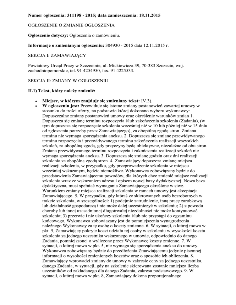 Numer ogłoszenia: 311198 - 2015; data zamieszczenia: 18.11.2015 OGŁOSZENIE O ZMIANIE OGŁOSZENIA Ogłoszenie dotyczy: Ogłoszenia o zamówieniu. Informacje o zmienianym ogłoszeniu: 304930 - 2015 data 12.11.2015 r. SEKCJA I: ZAMAWIAJĄCY Powiatowy Urząd Pracy w Szczecinie, ul. Mickiewicza 39, 70-383 Szczecin, woj. zachodniopomorskie, tel. 91 4254950, fax. 91 4225533. SEKCJA II: ZMIANY W OGŁOSZENIU II.1) Tekst, który należy zmienić: Miejsce, w którym znajduje się zmieniany tekst: IV.3). W ogłoszeniu jest: Przewiduje się istotne zmiany postanowień zawartej umowy w stosunku do treści oferty, na podstawie której dokonano wyboru wykonawcy: Dopuszczalne zmiany postanowień umowy oraz określenie warunków zmian 1. Dopuszcza się zmianę terminu rozpoczęcia i/lub zakończenia szkolenia (Zadania), (w tym dopuszcza się rozpoczęcie szkolenia wcześniej niż w 10 lub później niż w 15 dniu od zgłoszenia potrzeby przez Zamawiającego), za obopólną zgodą stron. Zmiana terminu nie wymaga sporządzenia aneksu. 2. Dopuszcza się zmianę przewidywanego terminu rozpoczęcia i przewidywanego terminu zakończenia realizacji wszystkich szkoleń, za obopólną zgodą, gdy przyczyny będą obiektywne, niezależne od obu stron. Zmiana przewidywanego terminu rozpoczęcia i zakończenia realizacji szkoleń nie wymaga sporządzenia aneksu. 3. Dopuszcza się zmianę godzin oraz dni realizacji szkolenia za obopólną zgodą stron. 4. Zamawiający dopuszcza zmianę miejsca realizacji szkolenia, w przypadku, gdy przeprowadzenie szkolenia w miejscu wcześniej wskazanym, będzie niemożliwe. Wykonawca zobowiązany będzie do przedstawienia Zamawiającemu powodów, dla których chce zmienić miejsce realizacji szkolenia wraz ze wskazaniem adresu i opisem nowej bazy dydaktycznej. Nowa baza dydaktyczna, musi spełniać wymagania Zamawiającego określone w siwz. Warunkiem zmiany miejsca realizacji szkolenia w ramach umowy jest akceptacja Zamawiającego. 5. W przypadku, gdy któraś ze skierowanych osób bezrobotnych w trakcie szkolenia, w szczególności: 1) podejmie zatrudnienie, inną pracę zarobkową lub działalność gospodarczą i nie może dalej uczestniczyć w szkoleniu; 2) z powodu choroby lub innej uzasadnionej długotrwałej niezdolności nie może kontynuować szkolenia; 3) przerwie i nie ukończy szkolenia i/lub nie przystąpi do egzaminu końcowego, Wykonawca zobowiązany jest do pomniejszenia wynagrodzenia należnego Wykonawcy za tę osobę o koszty zmienne. 6. W sytuacji, o której mowa w pkt. 5, Zamawiający pokryje koszt udziału tej osoby w szkoleniu w wysokości kosztu szkolenia za jednego uczestnika wskazanego w umowie, odpowiednio do danego Zadania, pomniejszonej o wyliczone przez Wykonawcę koszty zmienne. 7. W sytuacji, o której mowa w pkt. 5, nie wymaga się sporządzenia aneksu do umowy. Wykonawca zobowiązany będzie do przedłożenia Zmawiającemu jedynie pisemnej informacji o wysokości zmienionych kosztów oraz o sposobie ich obliczenia. 8. Zamawiający wprowadzi zmiany do umowy w zakresie ceny za jednego uczestnika, danego Zadania, w sytuacji, gdy na szkolenie skierowana zostanie mniejsza liczba uczestników od zakładanego dla danego Zadania, zakresu podstawowego. 9. W sytuacji, o której mowa w pkt. 8, Zamawiający dokona proporcjonalnego pomniejszenia wynagrodzenia Wykonawcy, o kwotę równą kosztom zmiennym szkolenia za osoby nieskierowane, na podstawie złożonej przez Wykonawcę kalkulacji kosztów. Koszty zmienne, o których mowa wyżej zostaną odjęte od wynagrodzenia Wykonawcy stanowiącego: iloczyn ceny brutto za jednego uczestnika szkolenia, odpowiednio dla danego Zadania oraz liczby osób określonej dla zamówienia podstawowego, odpowiednio dla danego Zadania. Niniejsza zmiana wymaga sporządzenia aneksu do umowy. 10. Jeżeli Wykonawca nie będzie należycie wykonywał warunków ustalonych w umowie, Zamawiający może: 1) przedłużyć odpowiednio terminy określone w umowie bez zastosowania kar umownych, jeżeli przyczyny będą obiektywne i nie wynikną z winy Wykonawcy; 2) przedłużyć odpowiednio terminy określone w umowie, jeżeli przyczyny wystąpią z winy Wykonawcy i naliczyć karę umowną w wysokości 0,1% kwoty wynagrodzenia należnego Wykonawcy. 11. Strony dopuszczają możliwość zmiany umowy będącej następstwem sukcesji uniwersalnej albo przejęcia z mocy prawa pełni praw i obowiązków dotyczących którejkolwiek ze stron. 12. Dopuszcza się możliwość następujących zmian w umowie: a) zmian danych stron ujawnionych w rejestrach publicznych; b) zmian będących następstwem zmian obowiązujących przepisów prawa, regulujących prawa i obowiązki stron.. W ogłoszeniu powinno być: Przewiduje się istotne zmiany postanowień zawartej umowy w stosunku do treści oferty, na podstawie której dokonano wyboru wykonawcy: Dopuszczalne zmiany postanowień umowy oraz określenie warunków zmian 1. Dopuszcza się zmianę terminu rozpoczęcia i/lub zakończenia szkolenia (Zadania), (w tym dopuszcza się rozpoczęcie szkolenia wcześniej niż w 10 lub później niż w 15 dniu od zgłoszenia potrzeby przez Zamawiającego), za obopólną zgodą stron. Zmiana terminu nie wymaga sporządzenia aneksu. 2. Dopuszcza się zmianę przewidywanego terminu rozpoczęcia i przewidywanego terminu zakończenia realizacji wszystkich szkoleń, za obopólną zgodą, gdy przyczyny będą obiektywne, niezależne od obu stron. Zmiana przewidywanego terminu rozpoczęcia i zakończenia realizacji szkoleń nie wymaga sporządzenia aneksu. 3. Dopuszcza się zmianę godzin oraz dni realizacji szkolenia za obopólną zgodą stron. 4. Zamawiający dopuszcza zmianę miejsca realizacji szkolenia, w przypadku, gdy przeprowadzenie szkolenia w miejscu wcześniej wskazanym, będzie niemożliwe. Wykonawca zobowiązany będzie do przedstawienia Zamawiającemu powodów, dla których chce zmienić miejsce realizacji szkolenia wraz ze wskazaniem adresu i opisem nowej bazy dydakt