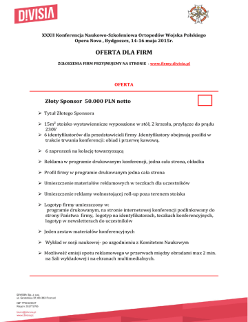 XXXII Konferencja Naukowo-Szkoleniowa Ortopedów Wojska Polskiego Opera Nova , Bydgoszcz, 14-16 maja 2015r. OFERTA DLA FIRM ZGŁOSZENIA FIRM PRZYJMUJEMY NA STRONIE : www.firmy.divisia.pl OFERTA Złoty Sponsor 50.000 PLN netto Tytuł Złotego Sponsora 15m² stoisko wystawiennicze wyposażone w stół, 2 krzesła, przyłącze do prądu 230V 6 identyfikatorów dla przedstawicieli firmy .Identyfikatory obejmują posiłki w trakcie trwania konferencji: obiad i przerwę kawową. 6 zaproszeń na kolację towarzyszącą Reklama w programie drukowanym konferencji, jedna cała strona, okładka Profil firmy w programie drukowanym jedna cała strona Umieszczenie materiałów reklamowych w teczkach dla uczestników Umieszczenie reklamy wolnostojącej roll-up poza terenem stoiska Logotyp firmy umieszczony w: programie drukowanym, na stronie internetowej konferencji podlinkowany do strony Państwa firmy, logotyp na identyfikatorach, teczkach konferencyjnych, logotyp w newsletterach do uczestników Jeden zestaw materiałów konferencyjnych Wykład w sesji naukowej- po uzgodnieniu z Komitetem Naukowym Możliwość emisji spotu reklamowego w przerwach między obradami max 2 min. na Sali wykładowej i na ekranach multimedialnych. Srebrny Sponsor 30.000 PLN netto Tytuł Srebrnego Sponsora 10m2 stoisko, wyposażone w 1 stół, 2 krzesła, przyłącze elektryczne 230V 4 identyfikatory dla przedstawicieli firmy . Identyfikatory obejmują posiłki w trakcie trwania konferencji obiad i przerwę kawową. 4 zaproszenia na kolację towarzyszącą Reklama w programie drukowanym konferencji, ½ strony. Profil firmy w programie drukowanym ½ strony. Umieszczenie materiałów reklamowych w teczkach dla uczestników. Logotyp w programie konferencji oraz podlinkowany logotyp na stronie internetowej konferencji. Jeden zestaw materiałów konferencyjnych. Umieszczenie reklamy wolnostojącej roll-up poza terenem stoiska. możliwość przeprowadzenia warsztatu po uzgodnieniu z Komitetem Naukowym. Reklama firmy wyświetlana na ekranach multimedialnych tj. ekranach wolnostojących ,w przerwach między obradami. Brązowy Sponsor 10.000 PLN netto Tytuł Brązowego Sponsora 8m² powierzchni wystawienniczej, wyposażonej w 1 stół, 2 krzesła, przyłącze elektryczne 230V 3 identyfikatory dla przedstawicieli firmy . Identyfikatory obejmują posiłki w trakcie trwania konferencji obiad i przerwę kawową. 3 zaproszenia na kolację towarzyszącą Umieszczenie materiałów reklamowych w teczkach dla uczestników Logotyp w programie drukowanym oraz na stronie internetowej konferencji 1 zestaw materiałów konferencyjnych Profil firmy w programie drukowanym- ½ strony Umieszczenie reklamy wolnostojącej roll-up poza terenem stoiska Wystawca 5000 PLN netto 4m² powierzchni wystawienniczej wyposażonej w 1 stół , 2 krzesła, przyłącze 230V 2 identyfikatory dla przedstawicieli firmy . Identyfikatory obejmują posiłki w trakcie trwania konferencji obiad i przerwę kawową. 2 zaproszenia na kolację towarzyszącą towarzyszą Logotyp na stronie internetowej konferencji oraz w programie drukowanym Dodatkowe opcje Dodatkowa powierzchnia wystawiennicza w m2 doliczona do stoiska standardowego 1 000 PLN* /za każdy m² (uwaga: stoisko wyposażone jest tak jak stoisko standardowe) Dodatkowy identyfikator dla przedstawiciela 300PLN netto ( obejmuje posiłki w trakcie konferencji oraz imprezę towarzyszącą) Umieszczenie materiałów reklamowych w teczkach konferencyjnych 1000 PLN netto Umieszczenie reklamy wolnostojącej roll-up poza terenem stoiska 500PLN netto Reklama na monitorach multimedialnych (przygotowana zgodnie z wytycznymi Organizatora) 2000 PLN netto Sponsorowanie przerwy kawowej dla uczestników stacje z kawą zostaną oznaczone Państwa logotypami i specjalnymi podziękowaniami 3000 PLN netto Sponsorowanie dystrybutorów z wodą dla uczestników stacje z wodą (kubeczki oraz baniaki) będą oznaczone Państwa logotypem oraz specjalnymi podziękowaniami 1500 PLN netto Do wszystkich podanych cen należy doliczyć 23 % VAT. Wpłaty należy kierować na poniższe dane mBank : 44 1140 2004 0000 3502 7523 2364 Divisia Sp. z o.o. ul. Grodziska 37 60-363 Poznań NIP 7792423227 KRS 0000516724 Regon 302772766 ZGŁOSZENIA FIRM PRZYJMUJEMY NA STRONIE : www.firmy.divisia.pl W razie pytań zapraszamy do kontaktu: Agnieszka Zygmunt [email protected] 726-888-818