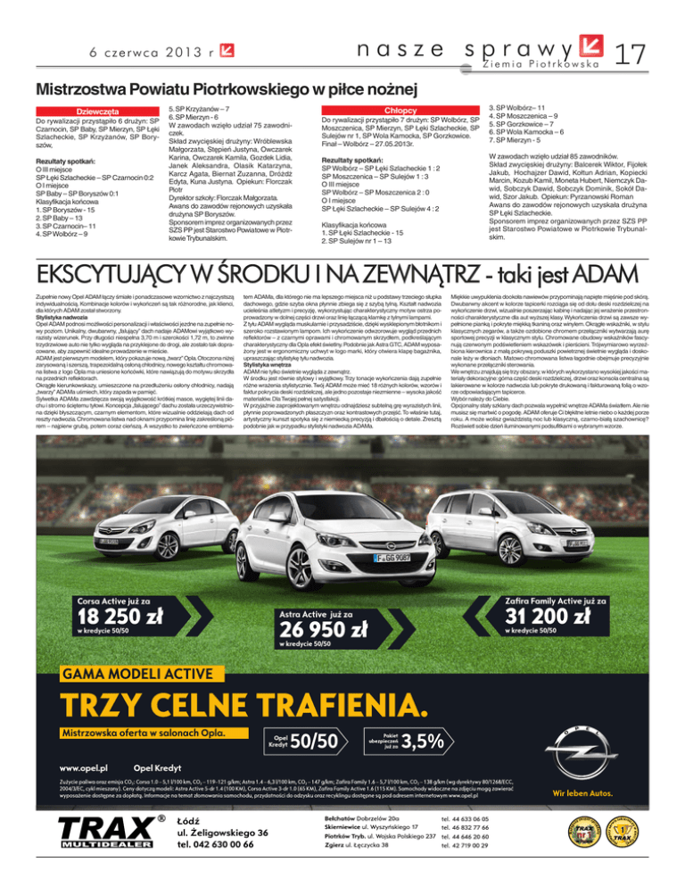 nasze sprawy 6 czerwca 2013 r Ziemia Piotrkowska 17 Mistrzostwa Powiatu Piotrkowskiego w piłce nożnej Dziewczęta Do rywalizacji przystąpiło 6 drużyn: SP Czarnocin, SP Baby, SP Mierzyn, SP Łęki Szlacheckie, SP Krzyżanów, SP Boryszów, Rezultaty spotkań: O III miejsce SP Łęki Szlacheckie – SP Czarnocin 0:2 O I miejsce SP Baby – SP Boryszów 0:1 Klasyfikacja końcowa 1. SP Boryszów - 15 2. SP Baby – 13 3. SP Czarnocin– 11 4. SP Wolbórz – 9 5. SP Krzyżanów – 7 6. SP Mierzyn - 6 W zawodach wzięło udział 75 zawodniczek. Skład zwycięskiej drużyny: Wróblewska Małgorzata, Stępień Justyna, Owczarek Karina, Owczarek Kamila, Gozdek Lidia, Janek Aleksandra, Olasik Katarzyna, Karcz Agata, Biernat Zuzanna, Dróżdż Edyta, Kuna Justyna. Opiekun: Florczak Piotr Dyrektor szkoły: Florczak Małgorzata. Awans do zawodów rejonowych uzyskała drużyna SP Boryszów. Sponsorem imprez organizowanych przez SZS PP jest Starostwo Powiatowe w Piotrkowie Trybunalskim. Chłopcy Do rywalizacji przystąpiło 7 drużyn: SP Wolbórz, SP Moszczenica, SP Mierzyn, SP Łęki Szlacheckie, SP Sulejów nr 1, SP Wola Kamocka, SP Gorzkowice. Finał – Wolbórz – 27.05.2013r. Rezultaty spotkań: SP Wolbórz – SP Łęki Szlacheckie 1 : 2 SP Moszczenica – SP Sulejów 1 : 3 O III miejsce SP Wolbórz – SP Moszczenica 2 : 0 O I miejsce SP Łęki Szlacheckie – SP Sulejów 4 : 2 Klasyfikacja końcowa 1. SP Łęki Szlacheckie - 15 2. SP Sulejów nr 1 – 13 3. SP Wolbórz– 11 4. SP Moszczenica – 9 5. SP Gorzkowice – 7 6. SP Wola Kamocka – 6 7. SP Mierzyn - 5 W zawodach wzięło udział 85 zawodników. Skład zwycięskiej drużyny: Balcerek Wiktor, Fijołek Jakub, Hochajzer Dawid, Kołtun Adrian, Kopiecki Marcin, Kozub Kamil, Moneta Hubert, Niemczyk Dawid, Sobczyk Dawid, Sobczyk Dominik, Sokół Dawid, Szor Jakub. Opiekun: Pyrzanowski Roman Awans do zawodów rejonowych uzyskała drużyna SP Łęki Szlacheckie. Sponsorem imprez organizowanych przez SZS PP jest Starostwo Powiatowe w Piotrkowie Trybunalskim. EKSCYTUJĄCY W ŚRODKU I NA ZEWNĄTRZ - taki jest ADAM Zupełnie nowy Opel ADAM łączy śmiałe i ponadczasowe wzornictwo z najczystszą indywidualnością. Kombinacje kolorów i wykończeń są tak różnorodne, jak klienci, dla których ADAM został stworzony. Stylistyka nadwozia Opel ADAM podnosi możliwości personalizacji i właściwości jezdne na zupełnie nowy poziom. Unikalny, dwubarwny, „falujący” dach nadaje ADAMowi wyjątkowo wyrazisty wizerunek. Przy długości niespełna 3,70 m i szerokości 1,72 m, to zwinne trzydrzwiowe auto nie tylko wygląda na przyklejone do drogi, ale zostało tak dopracowane, aby zapewnić idealne prowadzenie w mieście. ADAM jest pierwszym modelem, który pokazuje nową „twarz” Opla. Otoczona niżej zarysowaną i szerszą, trapezoidalną osłoną chłodnicy, nowego kształtu chromowana listwa z logo Opla ma uniesione końcówki, które nawiązują do motywu skrzydła na przednich reflektorach. Okrągłe kierunkowskazy, umieszczone na przedłużeniu osłony chłodnicy, nadają „twarzy” ADAMa uśmiech, który zapada w pamięć. Sylwetka ADAMa zawdzięcza swoją wyjątkowość krótkiej masce, wygiętej linii dachu i stromo ściętemu tyłowi. Koncepcja „falującego” dachu została urzeczywistniona dzięki błyszczącym, czarnym elementom, które wizualnie oddzielają dach od reszty nadwozia. Chromowana listwa nad oknami przypomina linię zakreśloną piórem – najpierw grubą, potem coraz cieńszą. A wszystko to zwieńczone emblema- tem ADAMa, dla którego nie ma lepszego miejsca niż u podstawy trzeciego słupka dachowego, gdzie szyba okna płynnie zbiega się z szybą tylną. Kształt nadwozia ucieleśnia atletyzm i precyzję, wykorzystując charakterystyczny motyw ostrza poprowadzony w dolnej części drzwi oraz linię łączącą klamkę z tylnymi lampami. Z tyłu ADAM wygląda muskularnie i przysadziście, dzięki wysklepionym błotnikom i szeroko rozstawionym lampom. Ich wykończenie odwzorowuje wygląd przednich reflektorów – z czarnymi oprawami i chromowanym skrzydłem, podkreślającym charakterystyczny dla Opla efekt świetlny.Podobnie jak Astra GTC, ADAM wyposażony jest w ergonomiczny uchwyt w logo marki, który otwiera klapę bagażnika, upraszczając stylistykę tyłu nadwozia. Stylistyka wnętrza ADAM nie tylko świetnie wygląda z zewnątrz. W środku jest równie stylowy i wyjątkowy. Trzy tonacje wykończenia dają zupełnie różne wrażenia stylistycznie.Twój ADAM może mieć 18 różnych kolorów, wzorów i faktur pokrycia deski rozdzielczej, ale jedno pozostaje niezmienne – wysoka jakość materiałów. Dla Twojej pełnej satysfakcji. W przyjaźnie zaprojektowanym wnętrzu odnajdziesz subtelną grę wyrazistych linii, płynnie poprowadzonych płaszczyzn oraz kontrastowych przejść. To właśnie tutaj, artystyczny kunszt spotyka się z niemiecką precyzją i dbałością o detale. Zresztą podobnie jak w przypadku stylistyki nadwozia ADAMa. Miękkie uwypuklenia dookoła nawiewów przypominają napięte mięśnie pod skórą. Dwubarwny akcent w kolorze tapicerki rozciąga się od dołu deski rozdzielczej na wykończenie drzwi, wizualnie poszerzając kabinę i nadając jej wrażenie przestronności charakterystyczne dla aut wyższej klasy. Wykończenia drzwi są zawsze wypełnione pianką i pokryte miękką tkaniną oraz winylem. Okrągłe wskaźniki, w stylu klasycznych zegarów, a także ozdobione chromem przełączniki wytwarzają aurę sportowej precyzji w klasycznym stylu. Chromowane obudowy wskaźników fascynują czerwonym podświetleniem wskazówek i pierścieni. Trójwymiarowo wyrzeźbiona kierownica z małą pokrywą poduszki powietrznej świetnie wygląda i doskonale leży w dłoniach. Matowo chromowana listwa łagodnie obejmuje precyzyjnie wykonane przełączniki sterowania. We wnętrzu znajdują się trzy obszary, w których wykorzystano wysokiej jakości materiały dekoracyjne:górna 